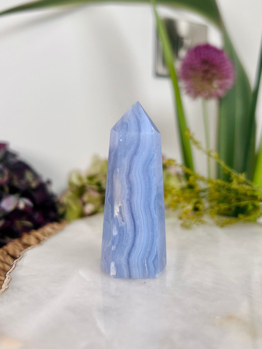 Grade AAA Natural Blue Lace Agate Tower from Namibia, Healing Crystal Home Decor 66g, Banded Chalcedony, Heart & Throat Chakra BLA09