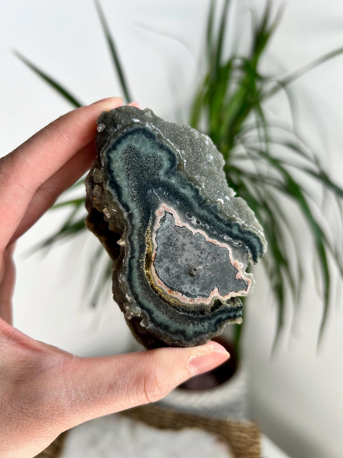 Grade AA Natural Green Druzy Jasper Stalactite Eye with Calcite from Uruguay – Rainbow Amethyst, Heart, Sacral and Root Chakra, US99, 185g