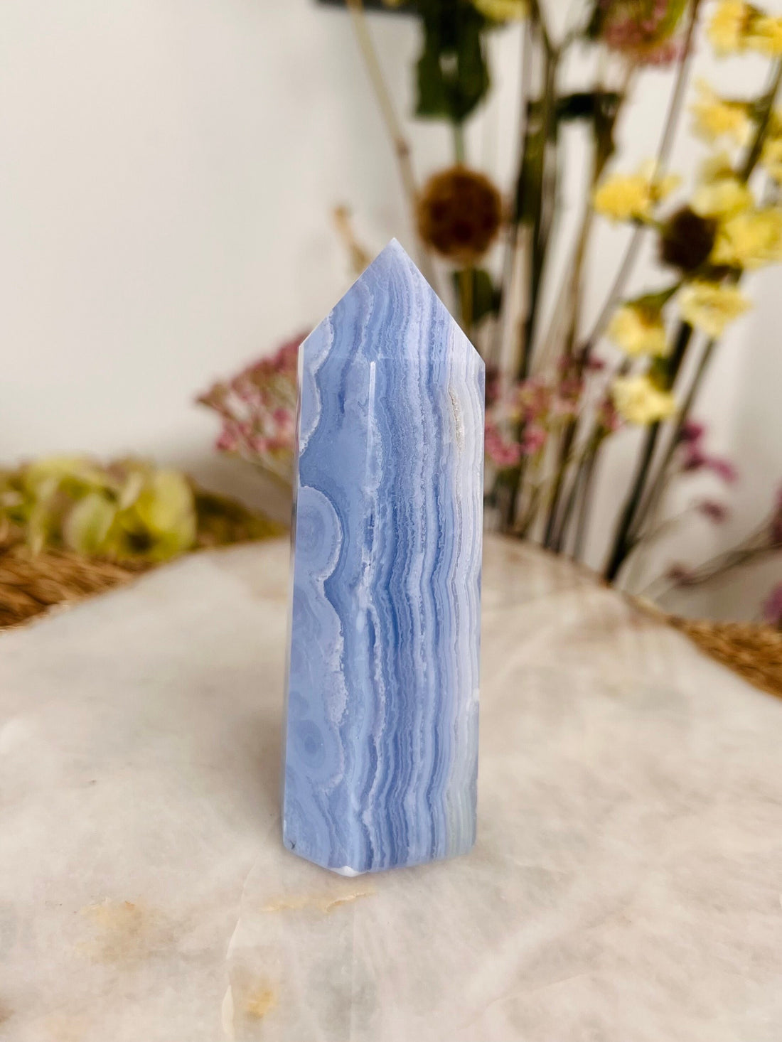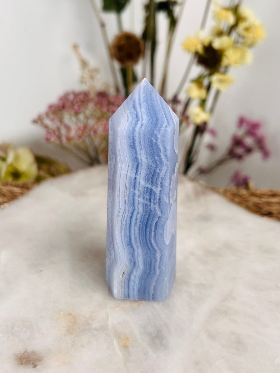 Grade AAA Natural Blue Lace Agate Tower from Namibia, Healing Crystal Home Decor 120g, BLA19 Discounted for minor imperfection