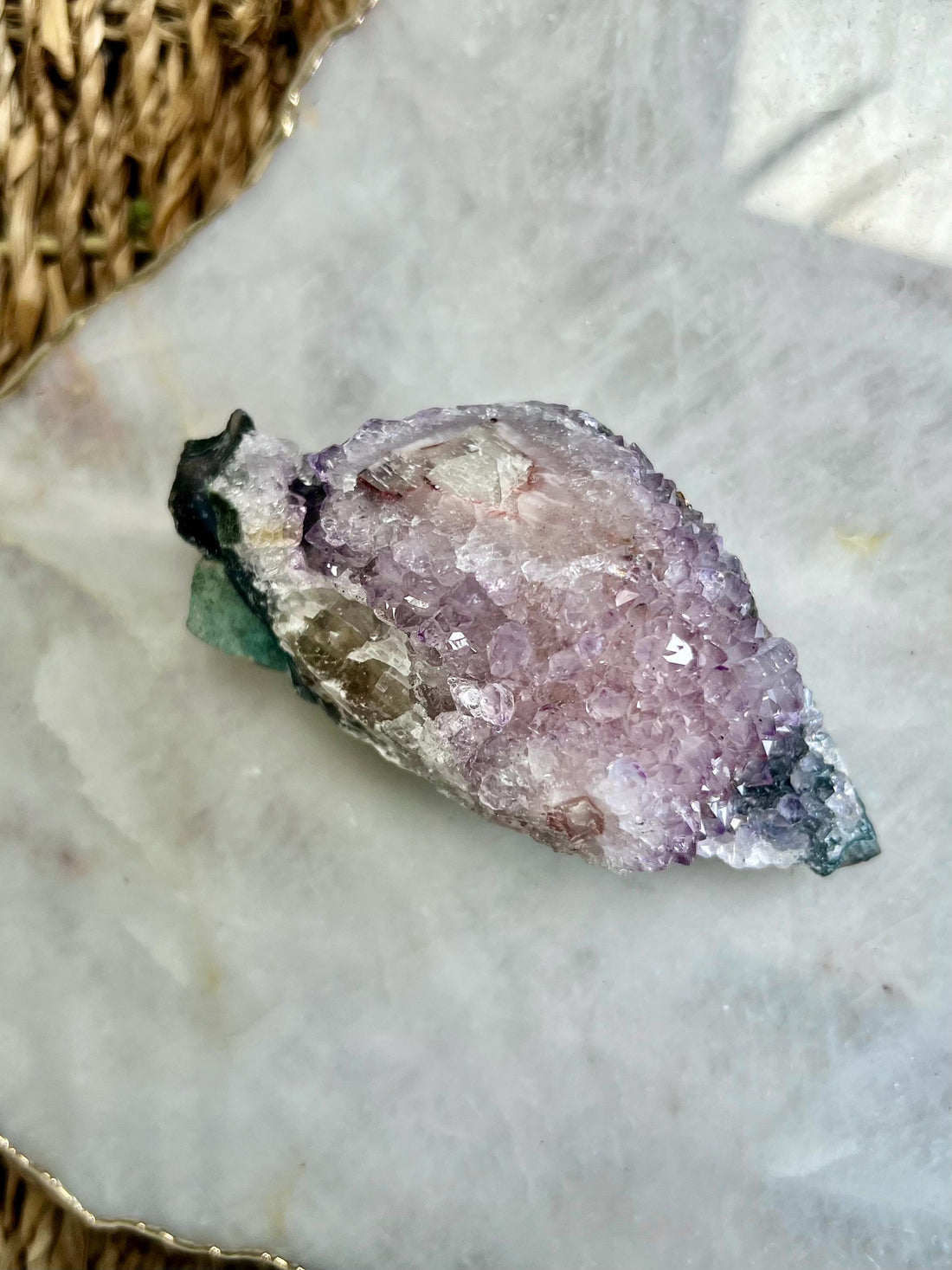 Grade AAA Pink Amethyst Tower with Druzy Geode and Green Jasper - Soothing Energy & Divine Femininity 261g PET07