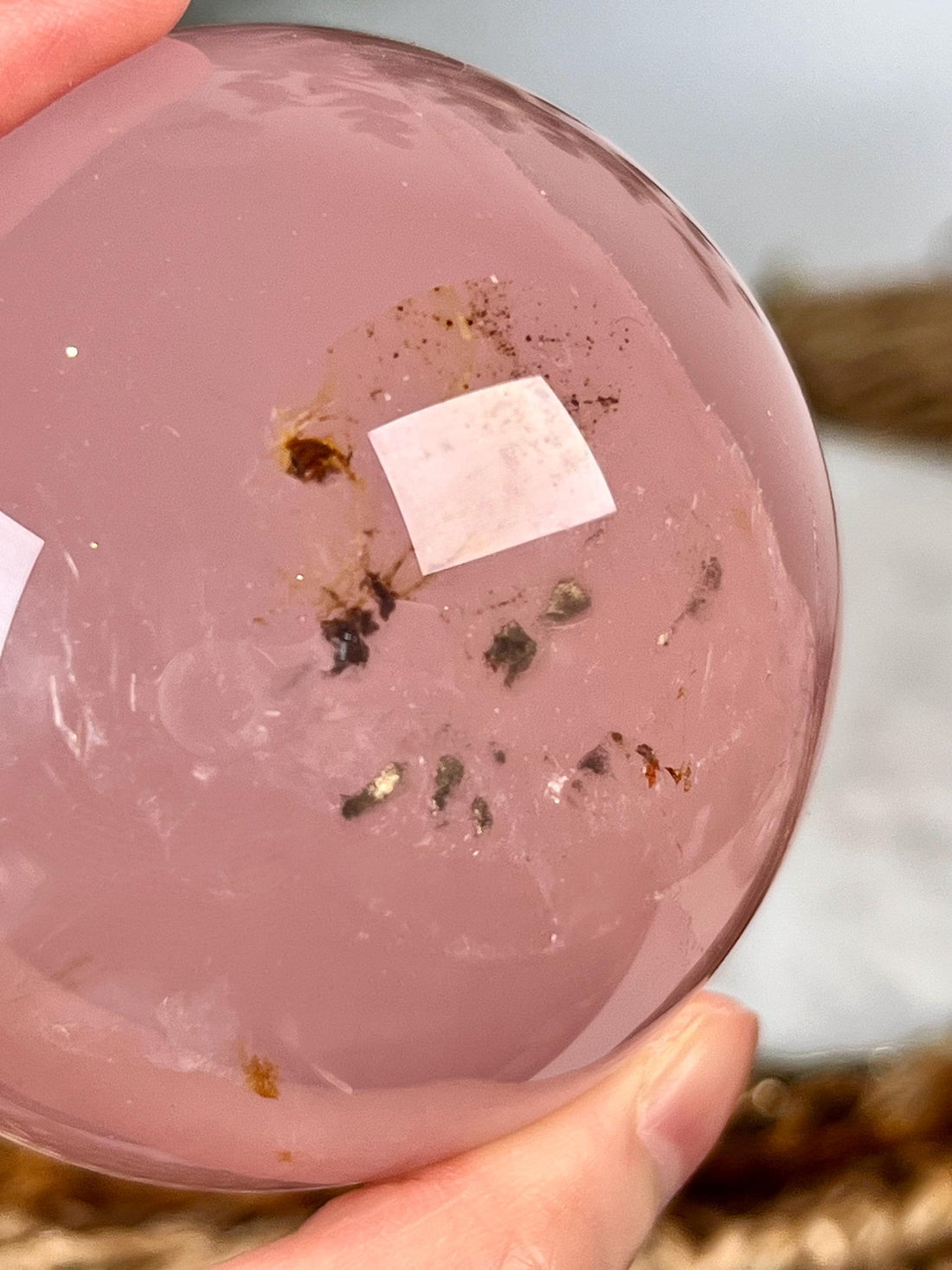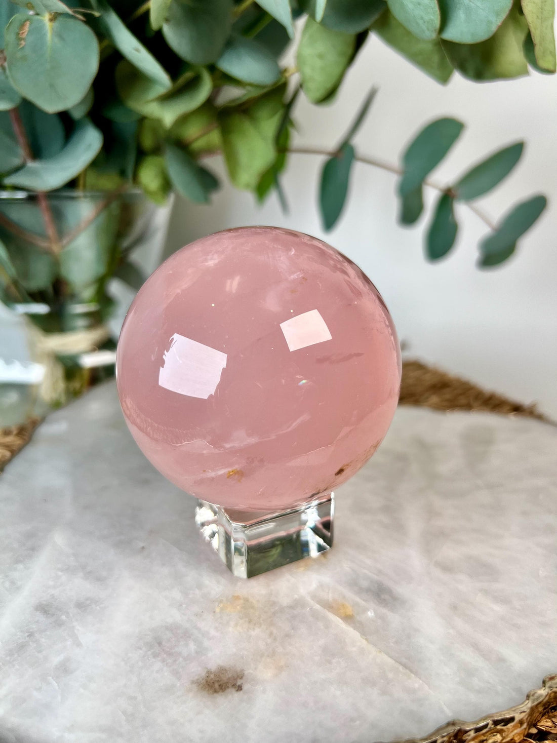 Grade AAA Rose Quartz Sphere with Iron Inclusion, Starlight and Rainbow | Heart Healing Crystal on Glass Stand |Madagascar Quartz 308g - RSQ