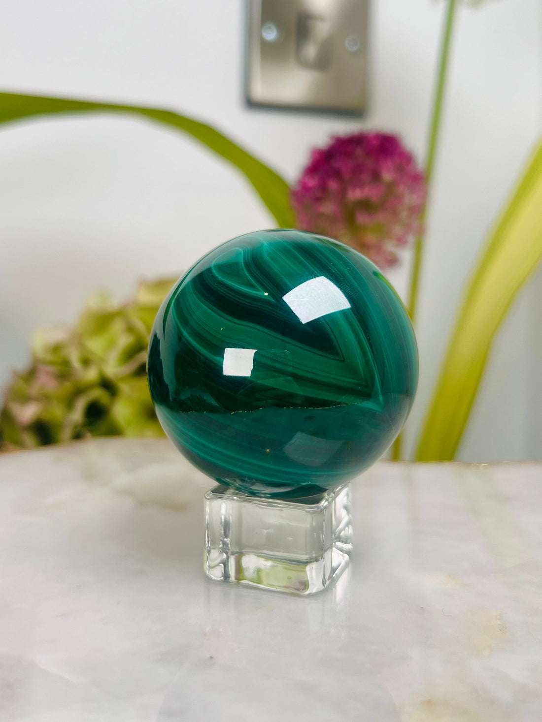 Grade AAA Natural Malachite Sphere on Stand, Manifestation Crystal,Energy Clearing, Good Fortune, Stone for New Beginnings, 333g - MS10