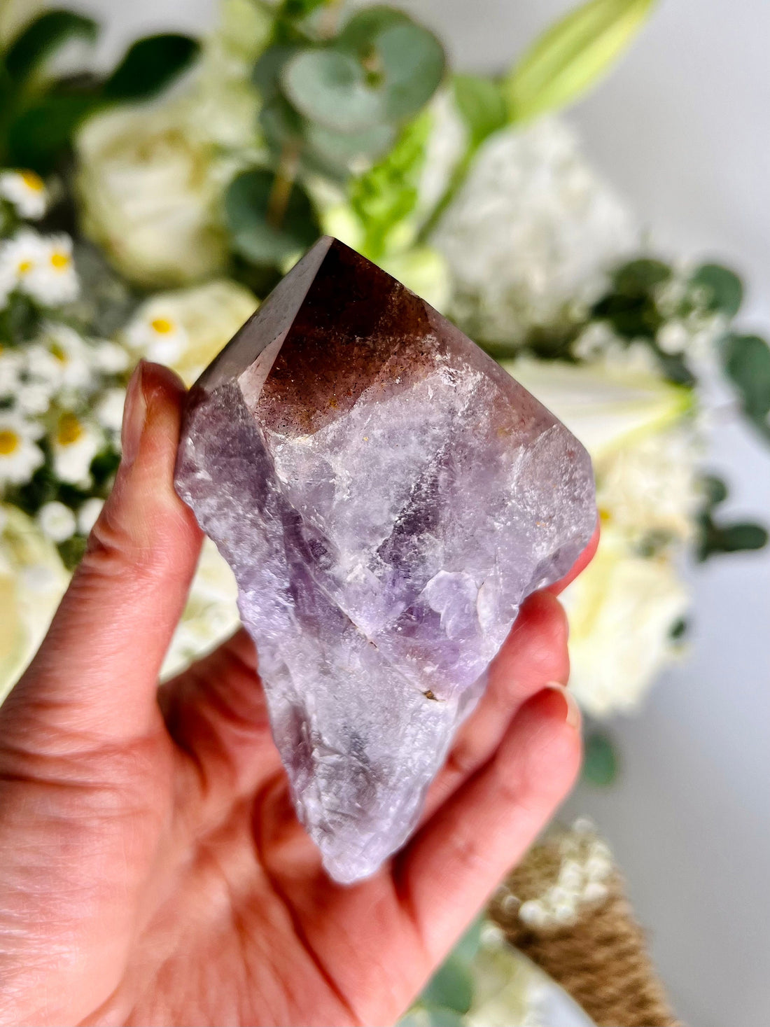 Grade A+ Phantom Amethyst Quartz Tower with Rainbows and Iron | Energetically Activated PA17, 43g DISCOUNTED for Minor Chip on Point