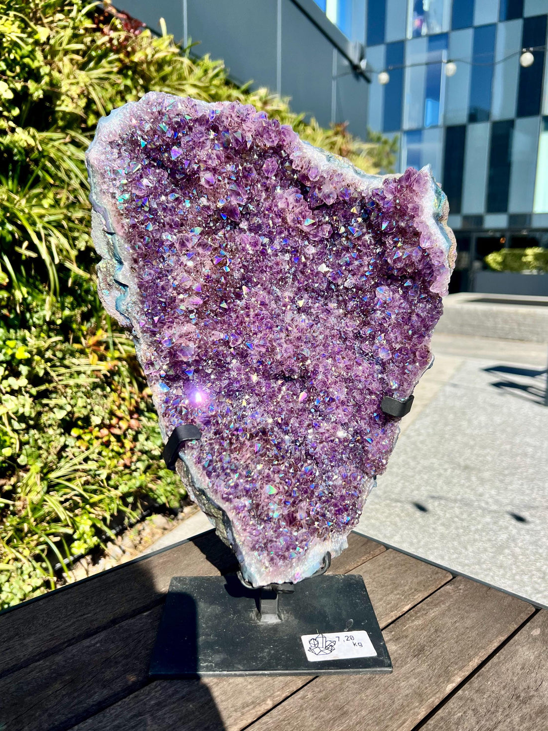 Grade AA+ Large Aura Amethyst Cluster on Stand – 7.2kg Titanium-Coated with Amethyst Flower Formation, Space Guardian, Portal Opening