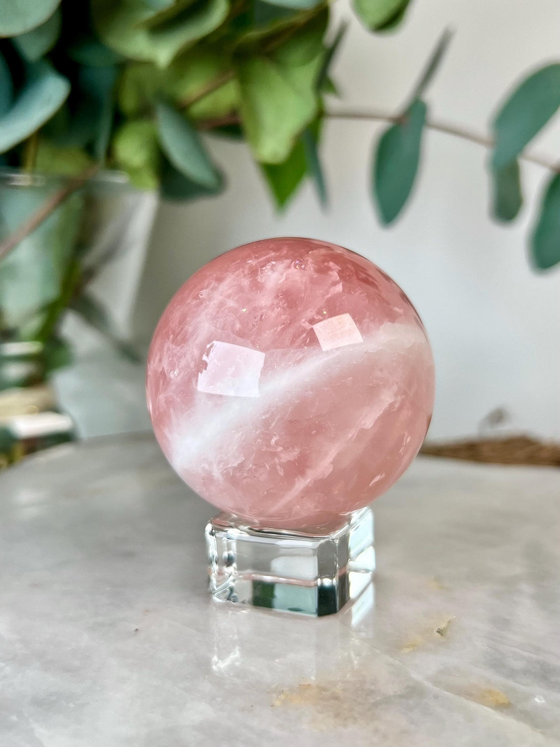Grade AAA Rose Quartz Sphere with Starlight and Rainbow | High-Vibe Heart Healing Crystal on Glass Stand | Madagascar Quartz 187g - RSQ01