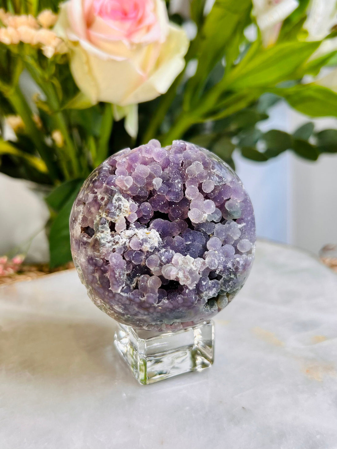 Grade AAA Natural Purple Grape Agate Sphere on Stand from Indonesia 288g Natural Velvet Shine Bubbles, Healing Crystal Home Decor