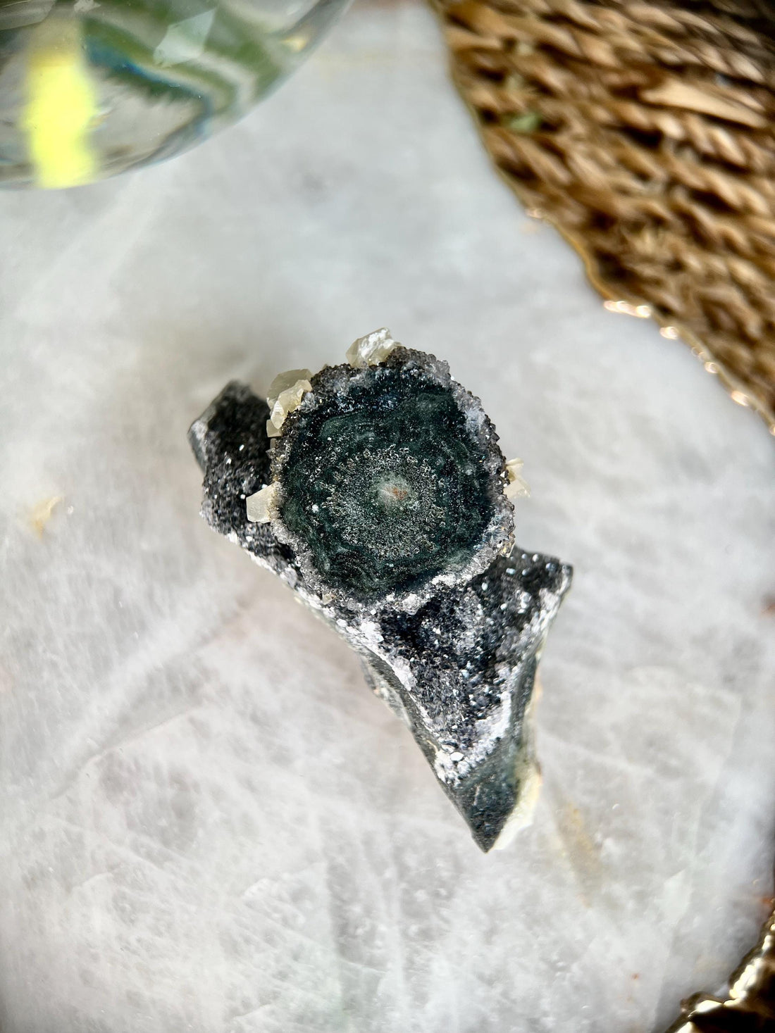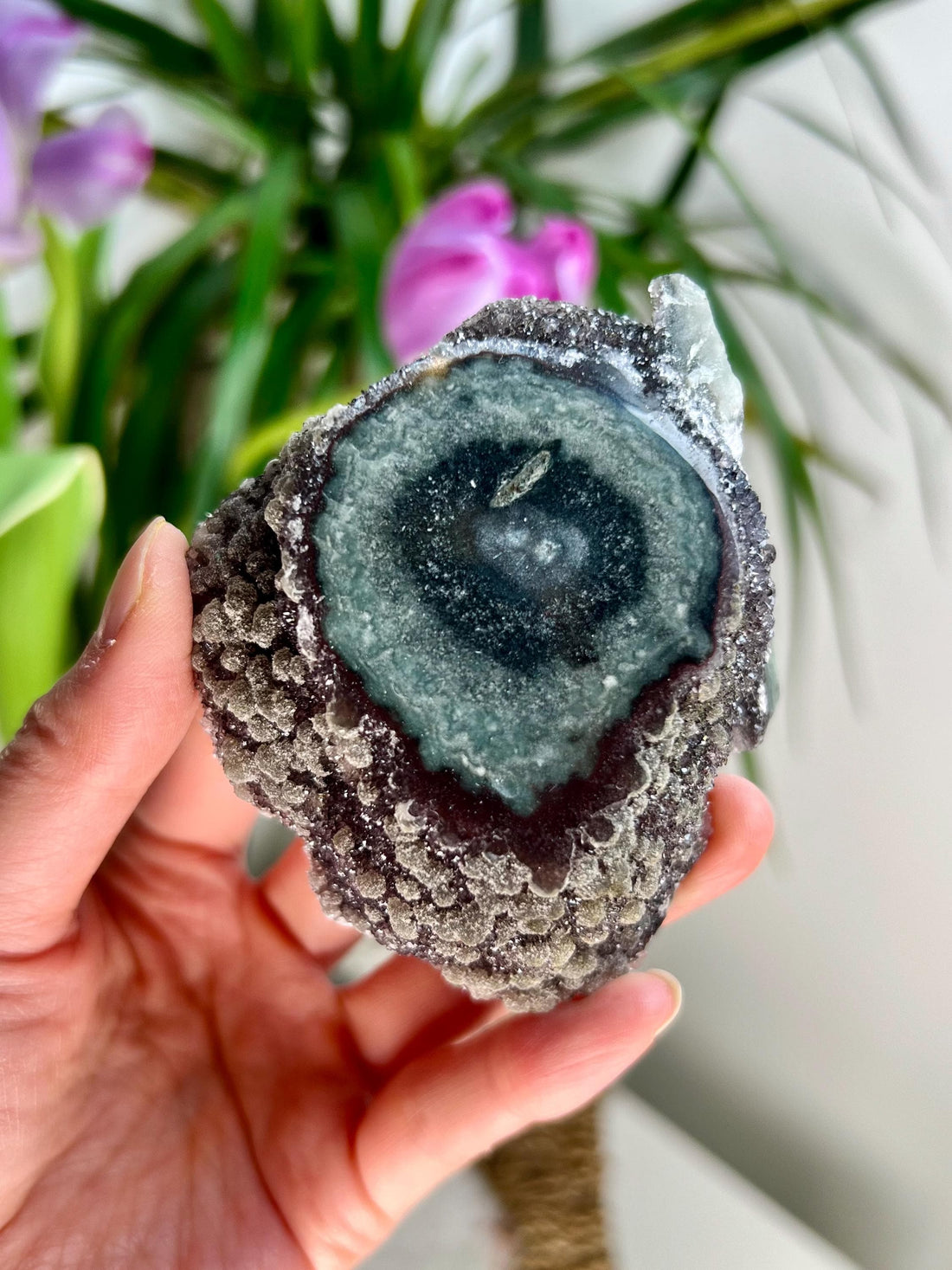 Grade AA Natural Green Jasper Druzy Stalactite Eye with Calcite Cube from Uruguay – Rainbow Amethyst, Heart Chakra, US26,107g