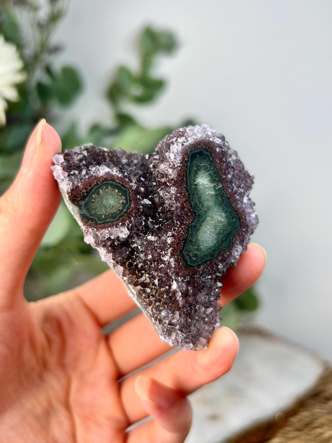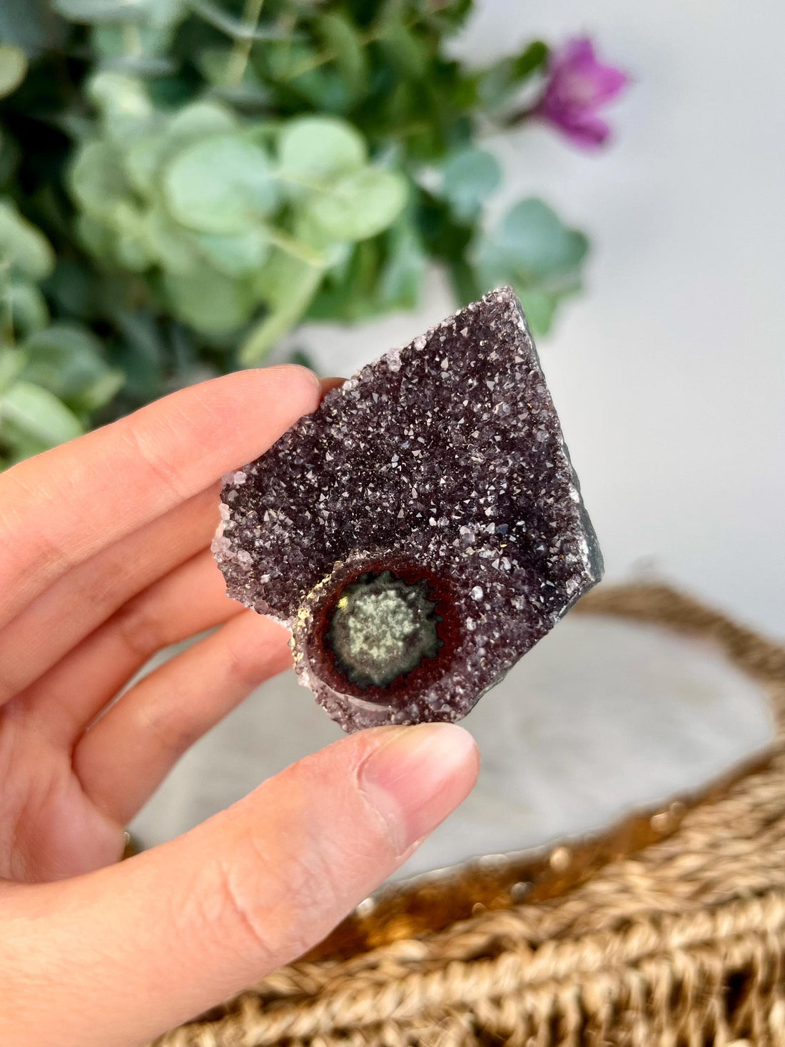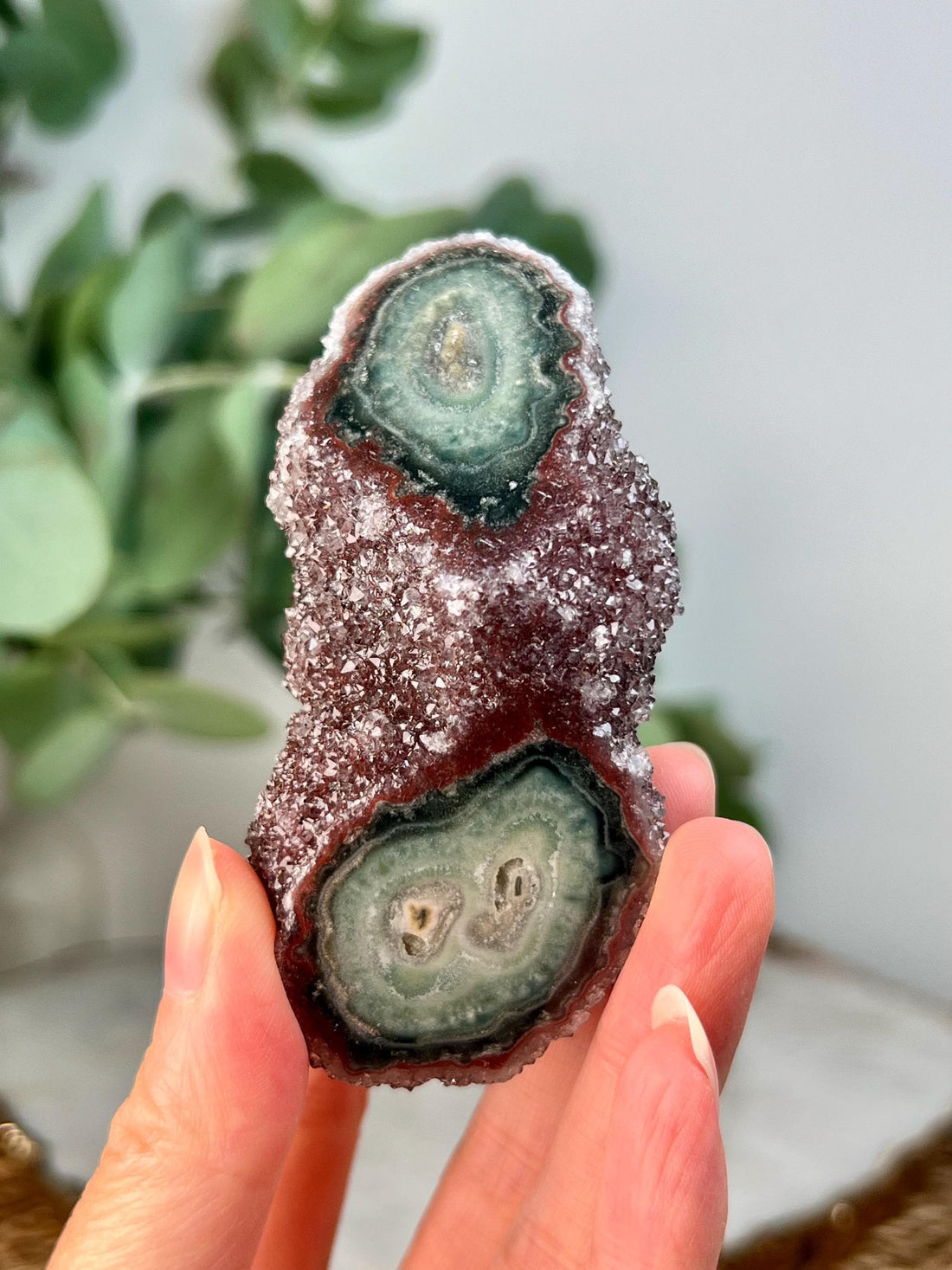 Grade AA Natural Red Druzy with Green Jasper Stalactite Eye from Uruguay – Rainbow Amethyst, Crown, Heart and Root Chakra, US85, 105g