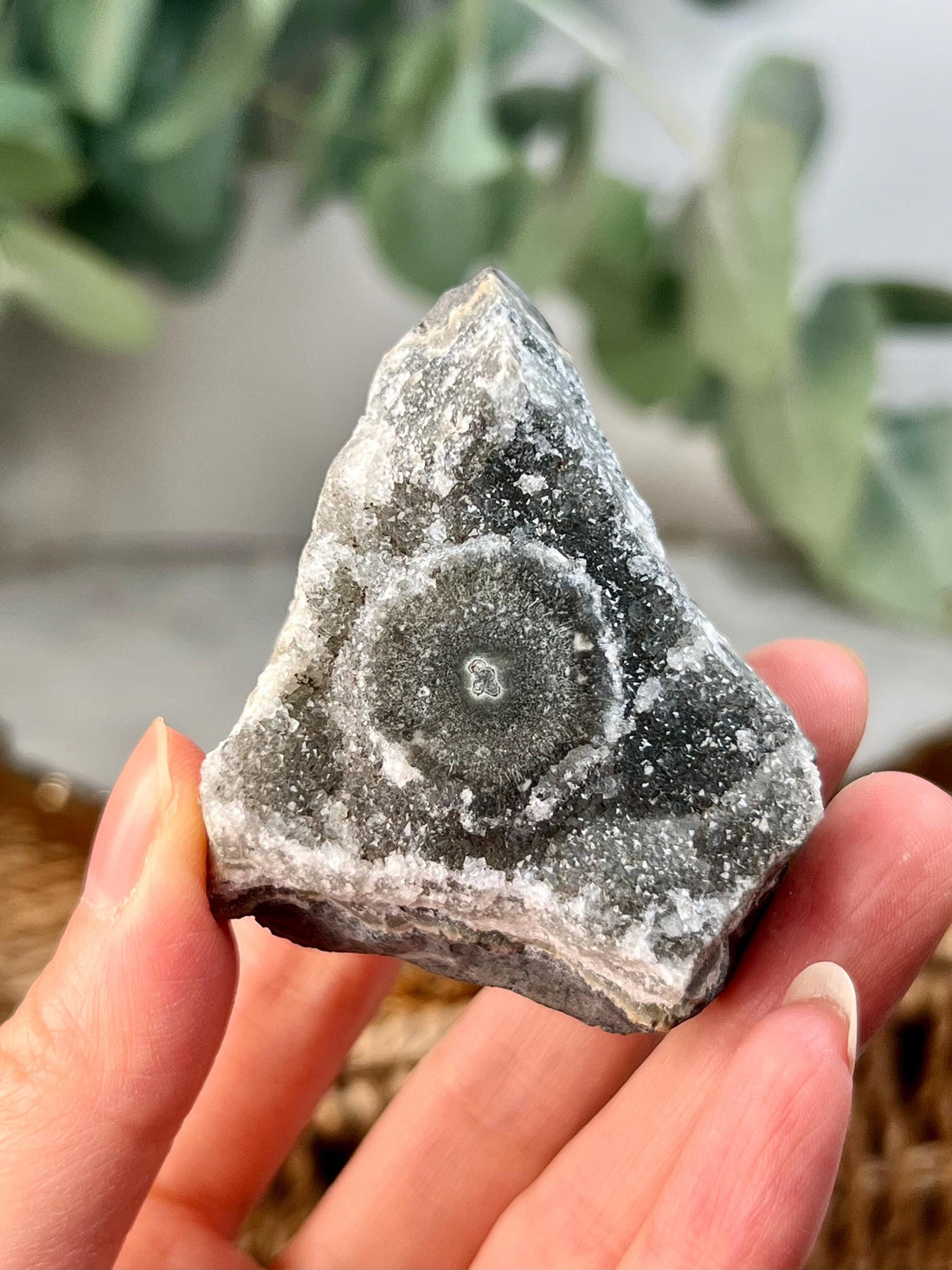 Grade AA Natural Green Jasper Grey Druzy Stalactite Eye with Calcite Cubes from Uruguay – Rainbow Amethyst, Heart Chakra, US114, 136g