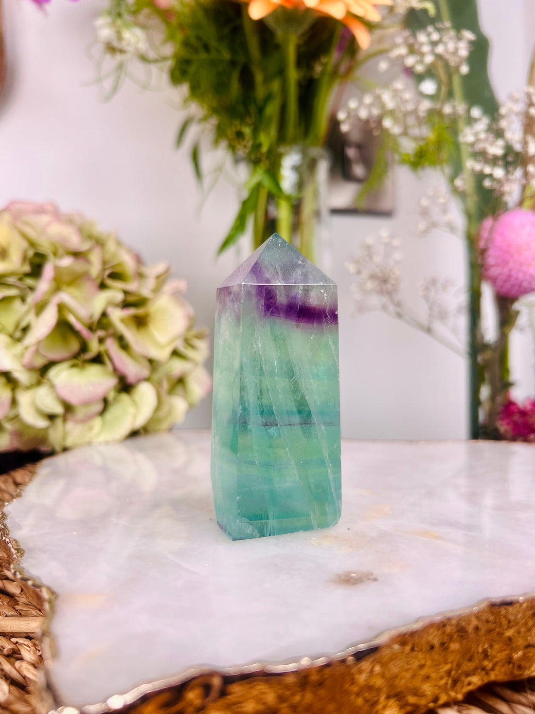 Grade AAA Rainbow Fluorite Tower, Green Purple Fluorite, Healing Crystal Home Decor 137g