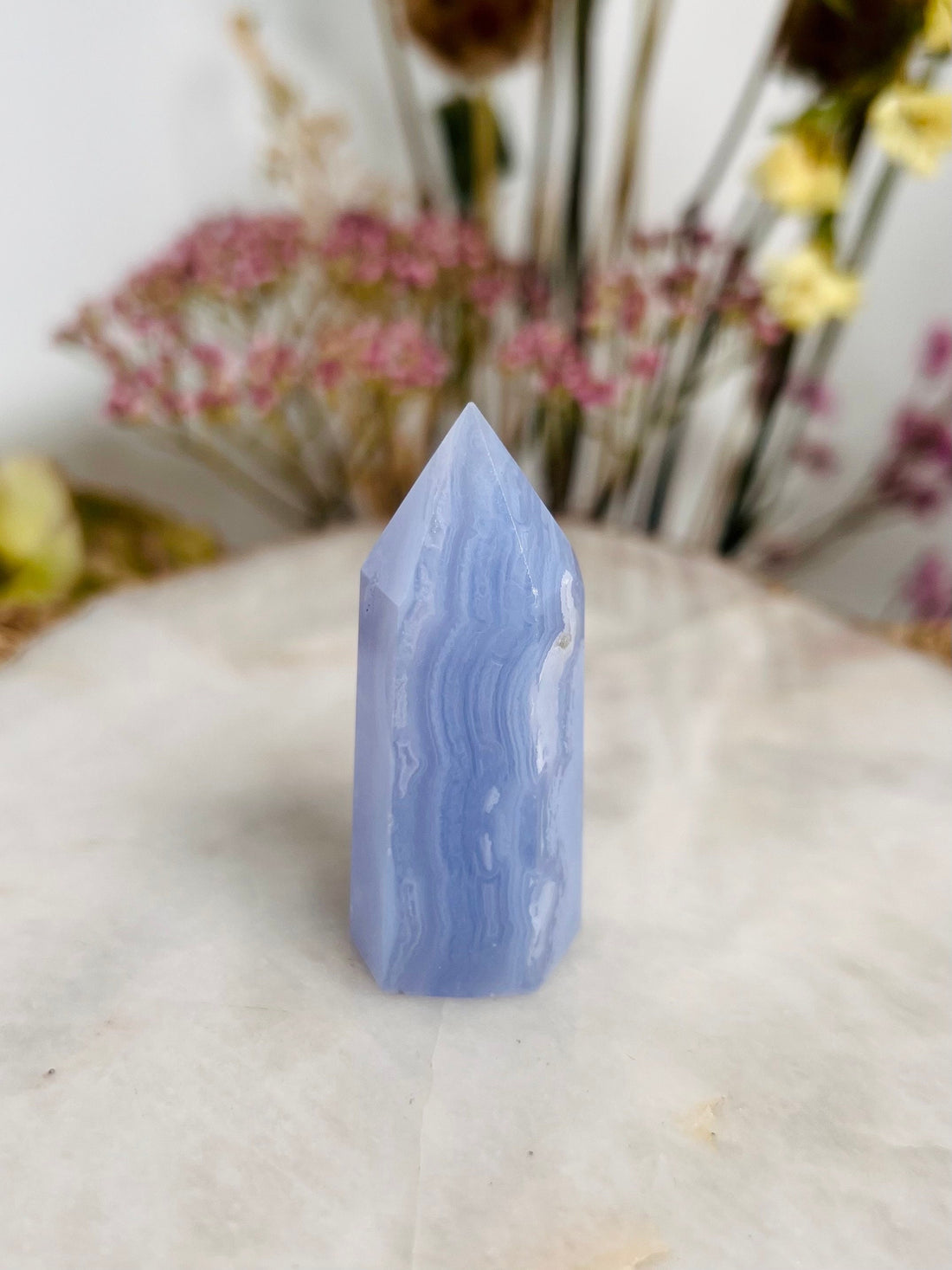 Grade AAA Natural Blue Lace Agate Tower from Namibia, Healing Crystal Home Decor 35g, Banded Chalcedony, Heart & Throat Chakra, BLA13