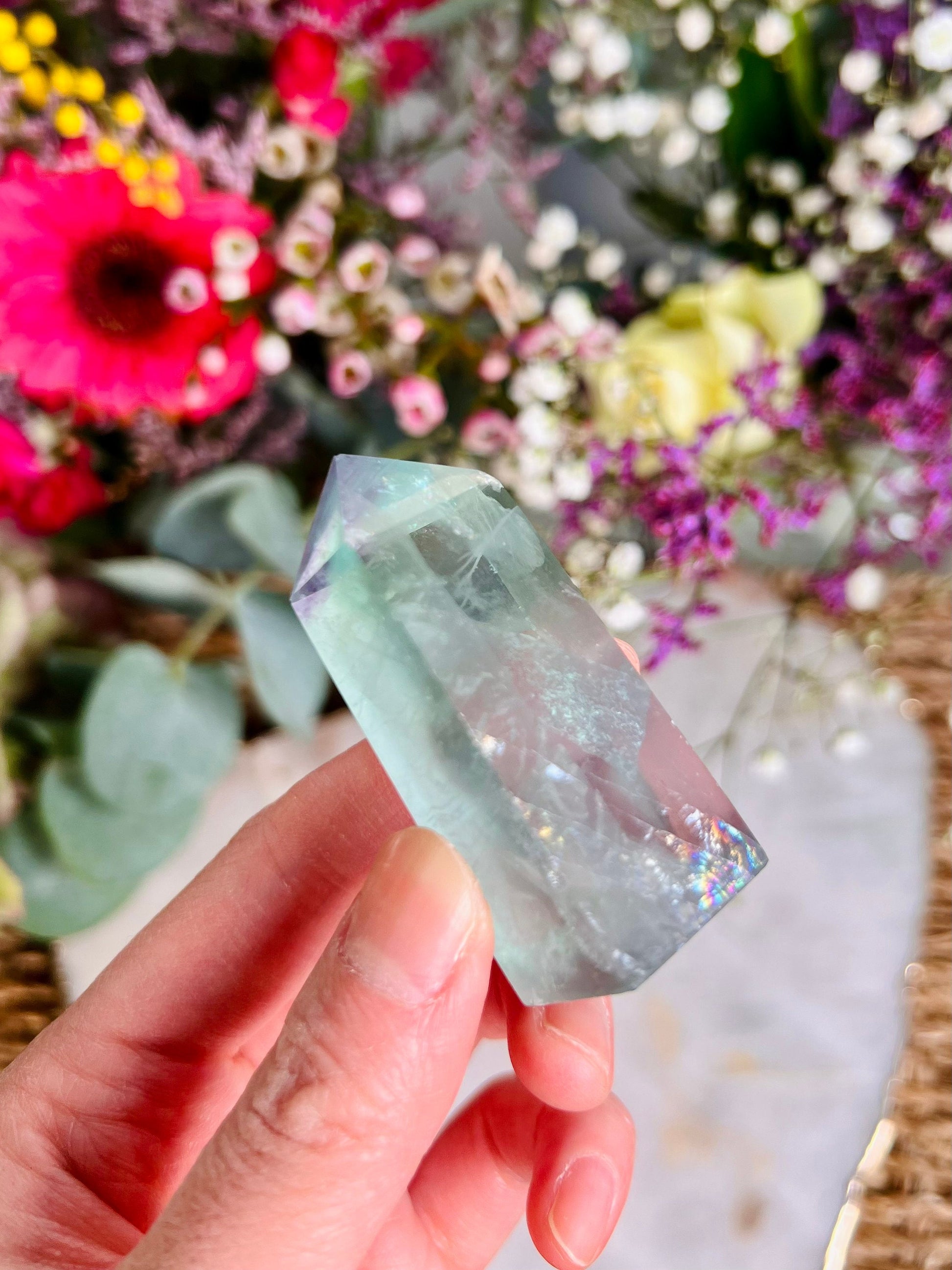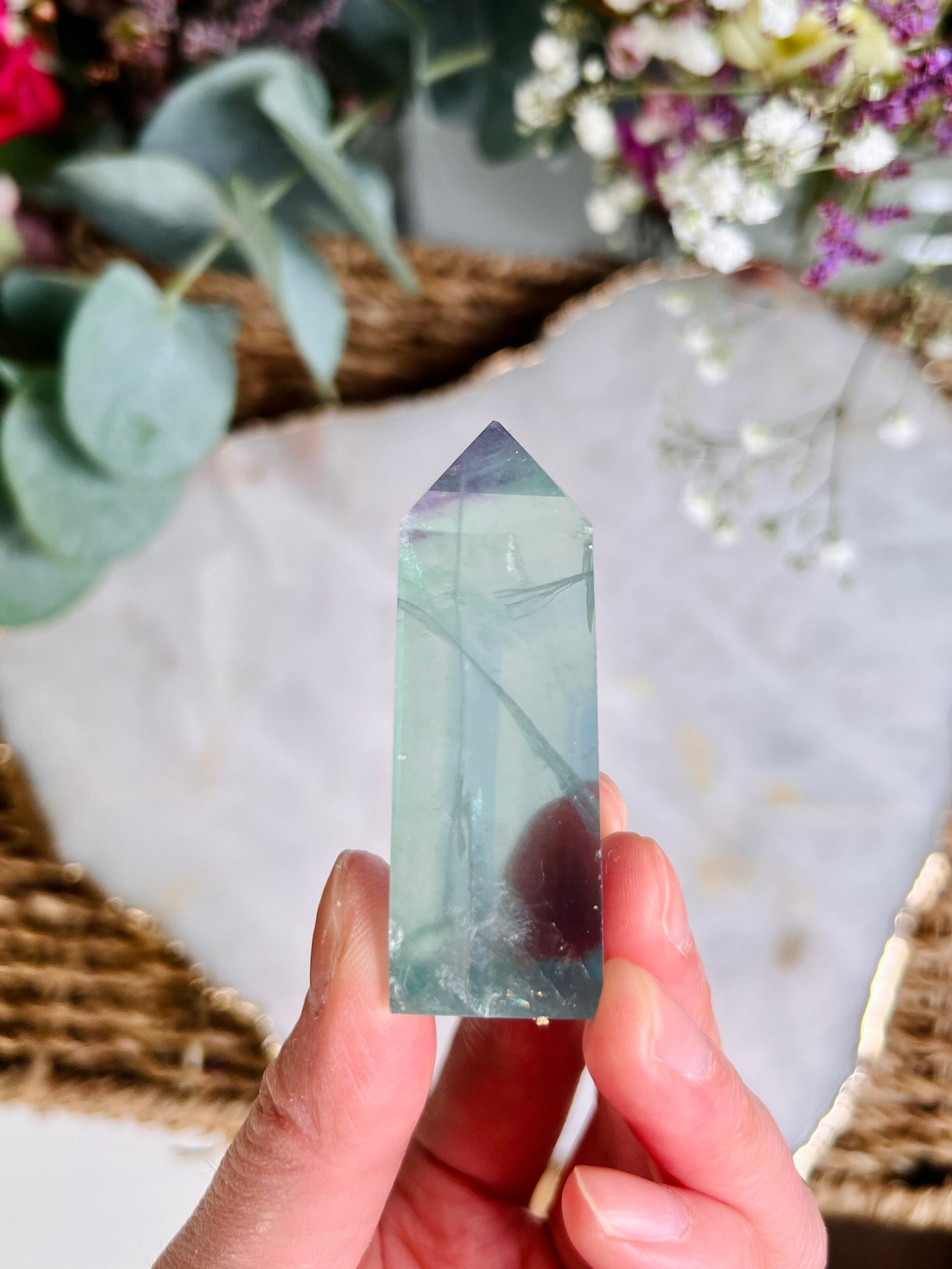 ADOPTION- Grade AAA Rainbow Fluorite Tower 53g, Green Purple Fluorite, Gem Quality, Discounted for minor shipping damage