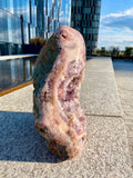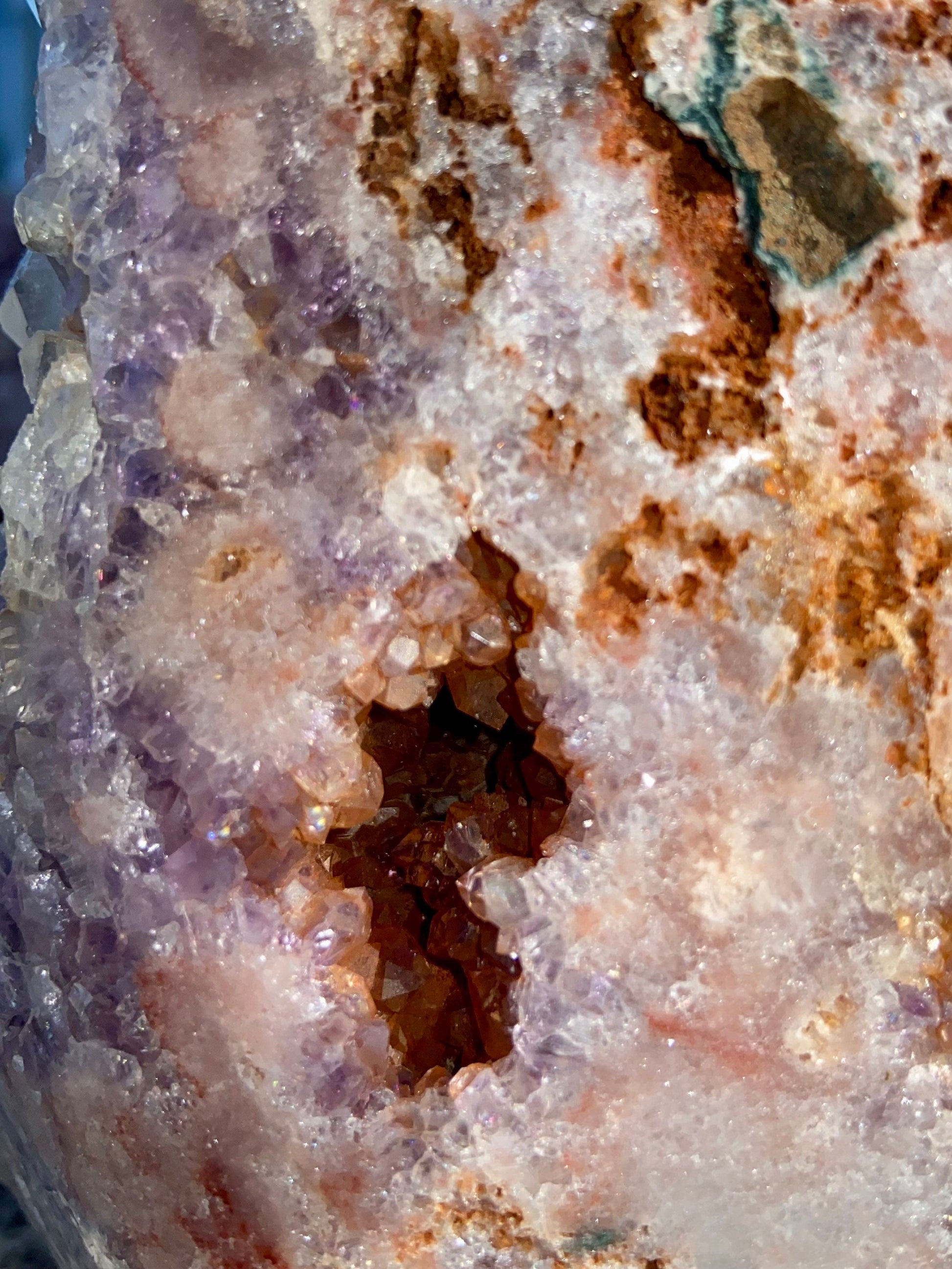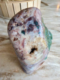✨ Discover Serenity and Balance - Embrace the unparalleled beauty and calming energy of our Grade AAAA Pink Amethyst statement piece. This extraordinary crystal, adorned with natural purple and pink amethyst geodes, green jasper lining, hematite, and full-bodied sparkling druzy, stands as a testament to nature's artistry and the profound healing powers of the earth.