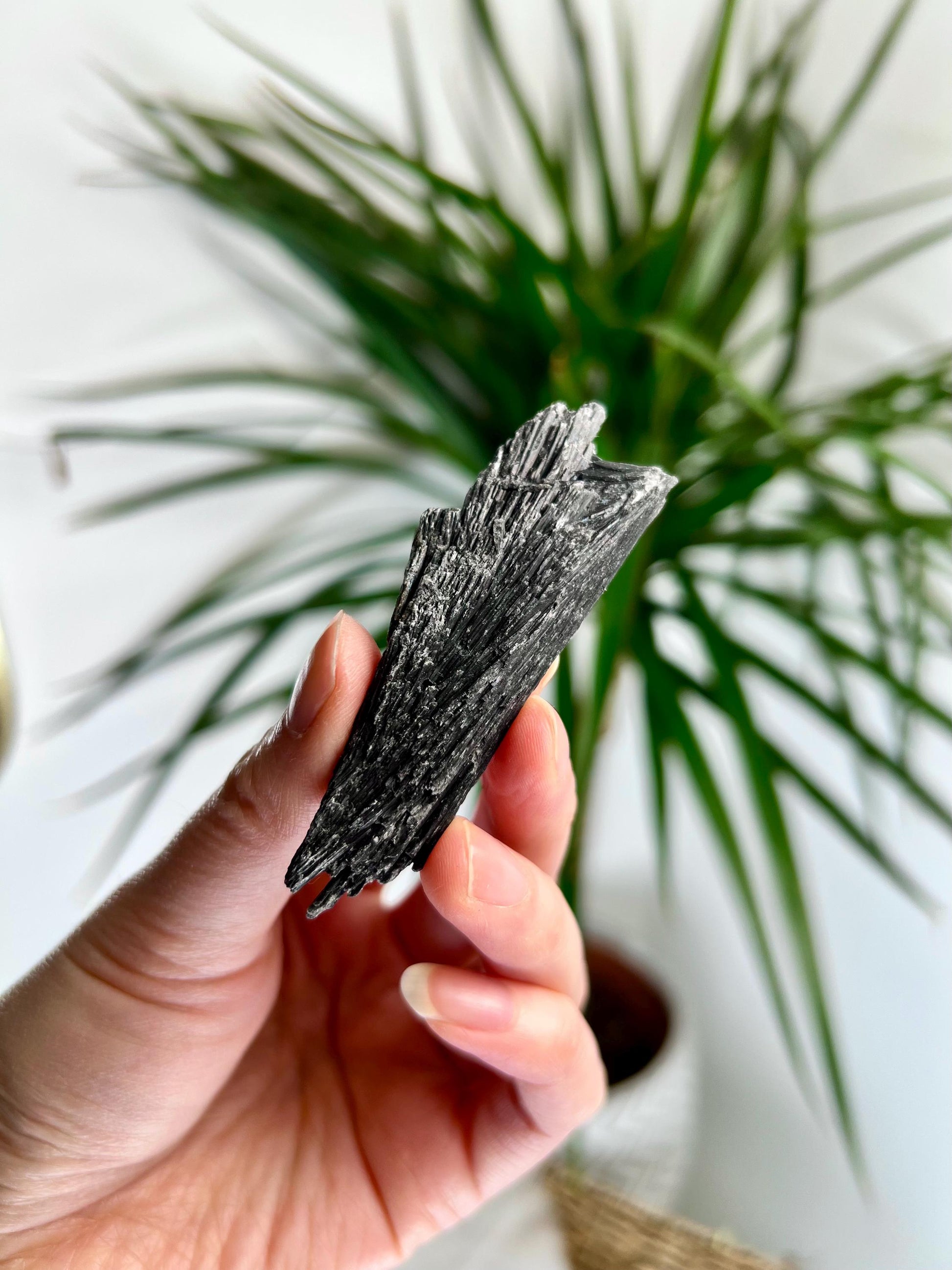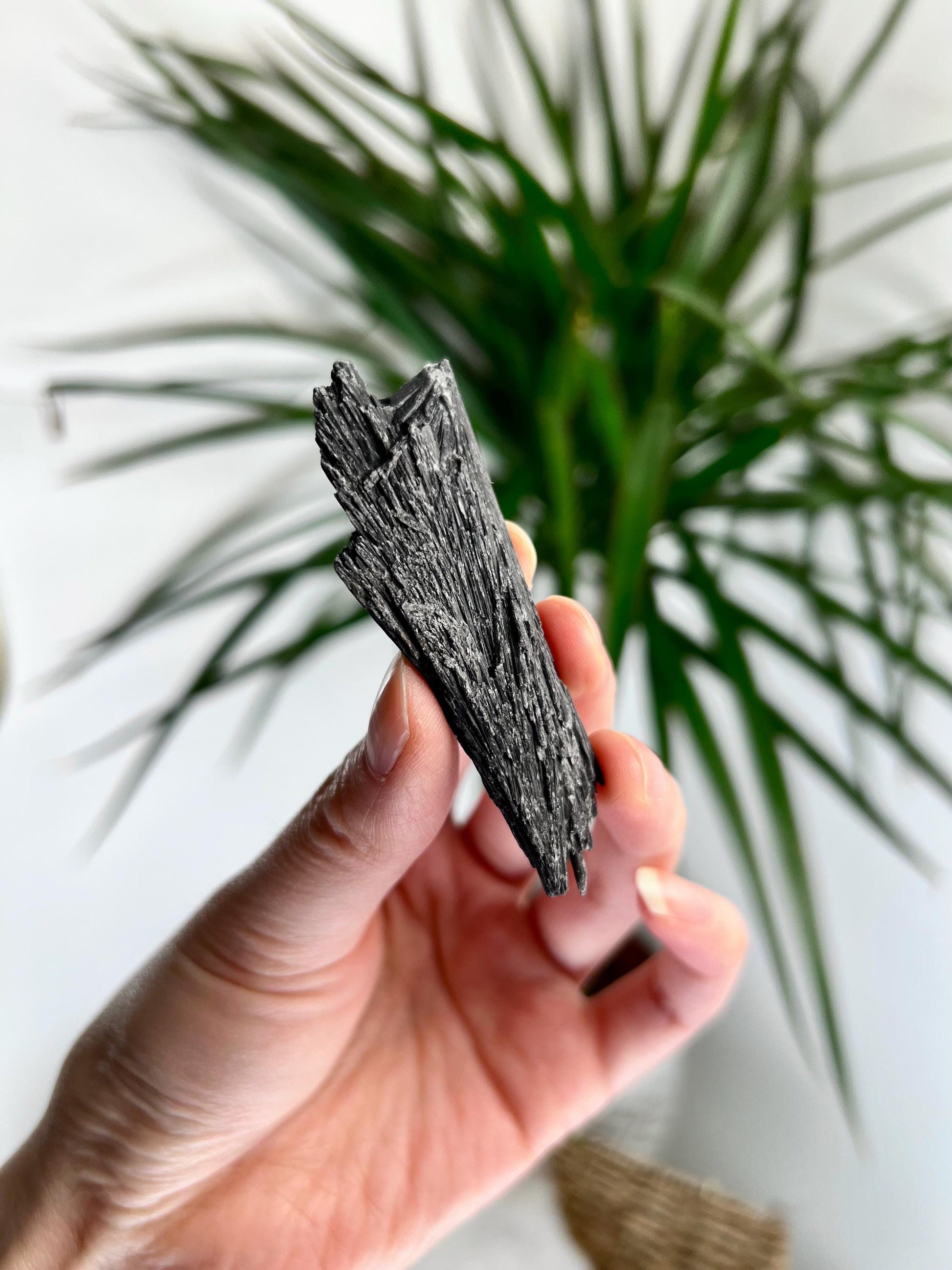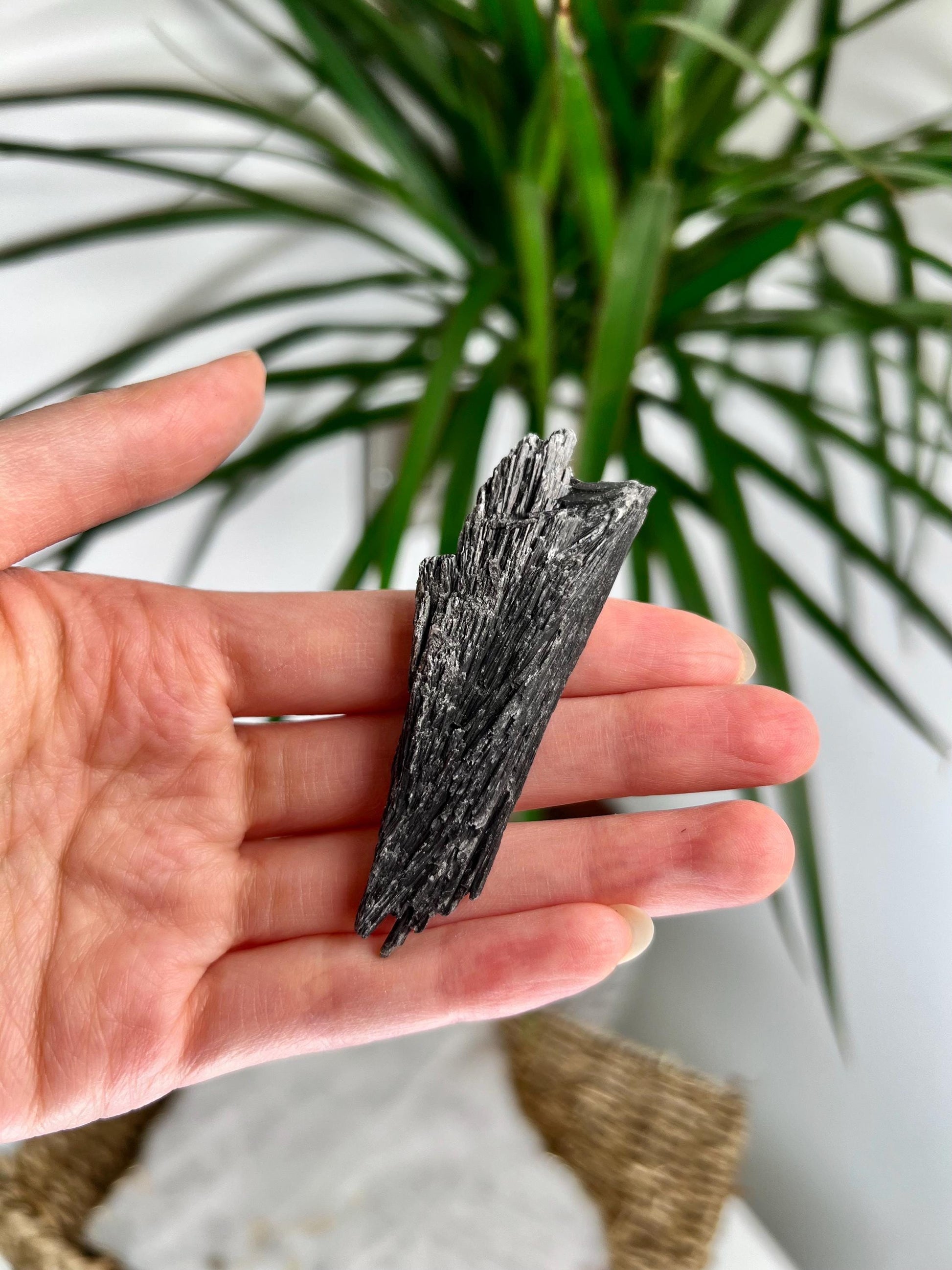 Black Kyanite is a powerful stone for protection, grounding, and clearing negative energies. Its unique blade-like structure is excellent for cutting through energy blockages and aligning the chakras. Black Kyanite doesn't need cleansing, as it automatically repels negativity and retains a high vibration. It's also known for connecting with higher spiritual realms while keeping you grounded.