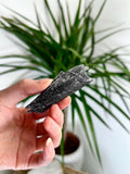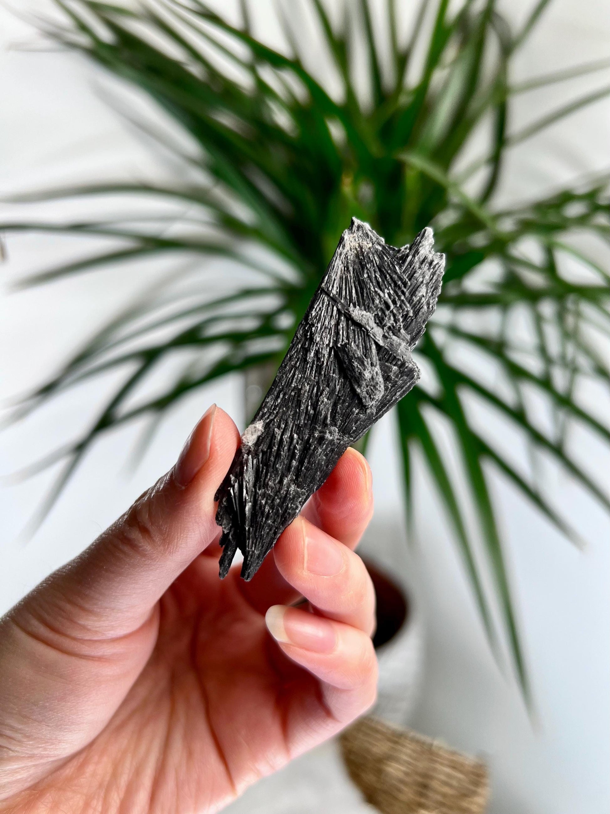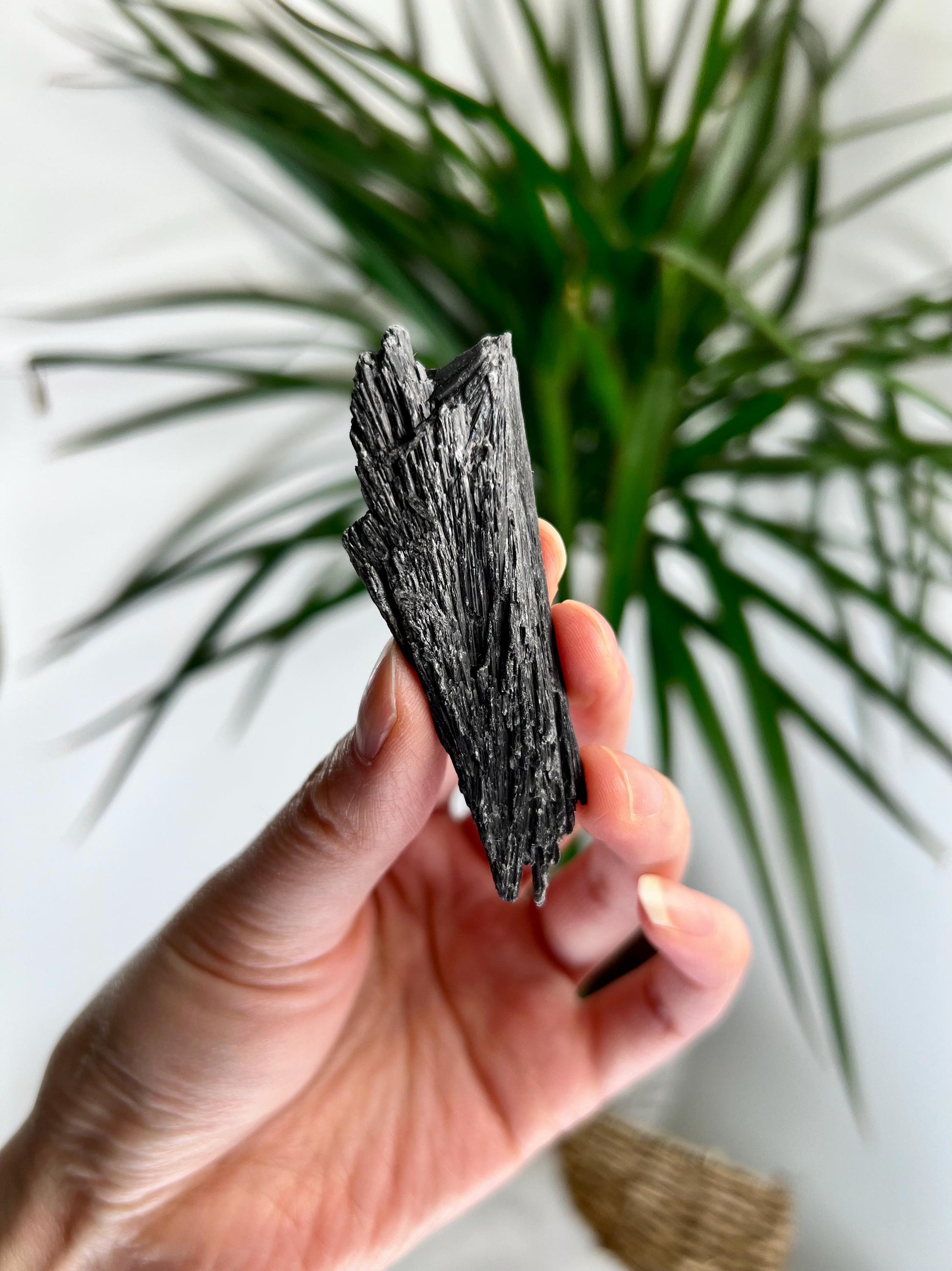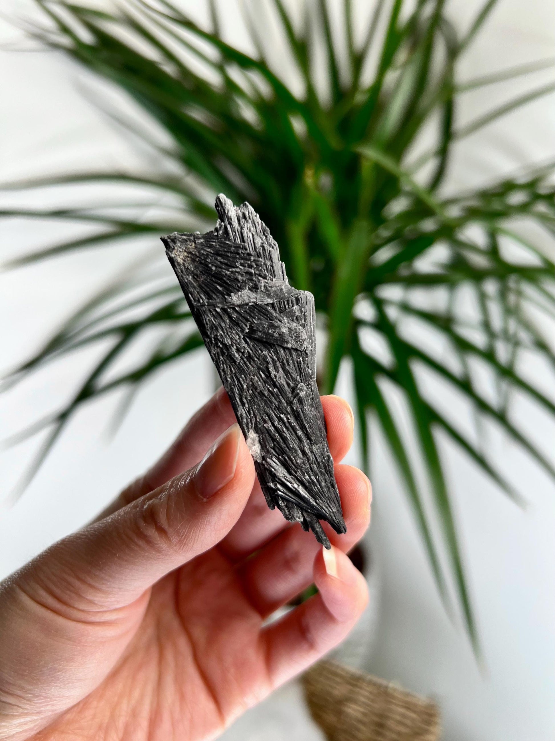 Black Kyanite is a powerful stone for protection, grounding, and clearing negative energies. Its unique blade-like structure is excellent for cutting through energy blockages and aligning the chakras. Black Kyanite doesn't need cleansing, as it automatically repels negativity and retains a high vibration. It's also known for connecting with higher spiritual realms while keeping you grounded.