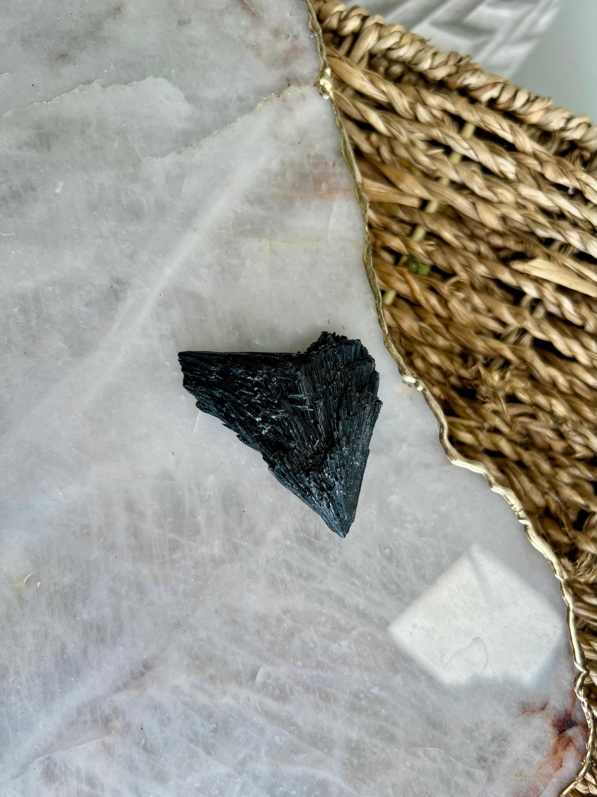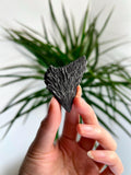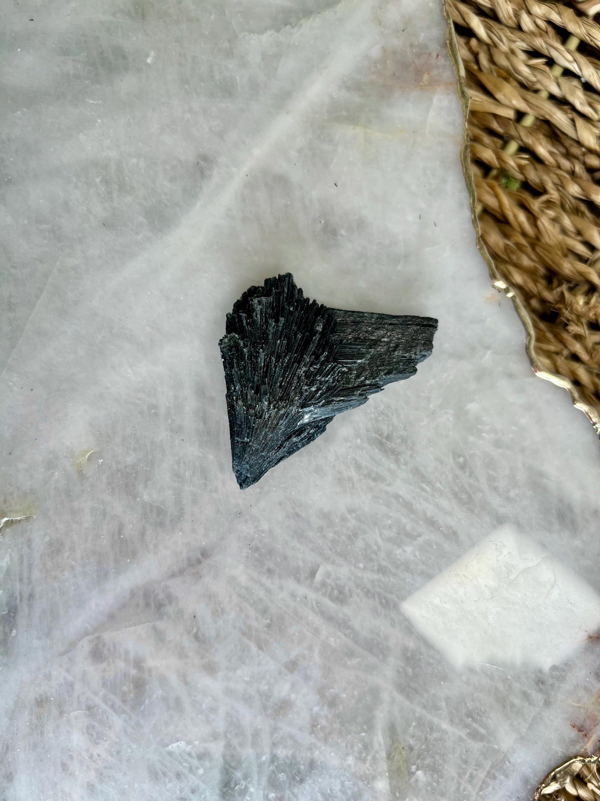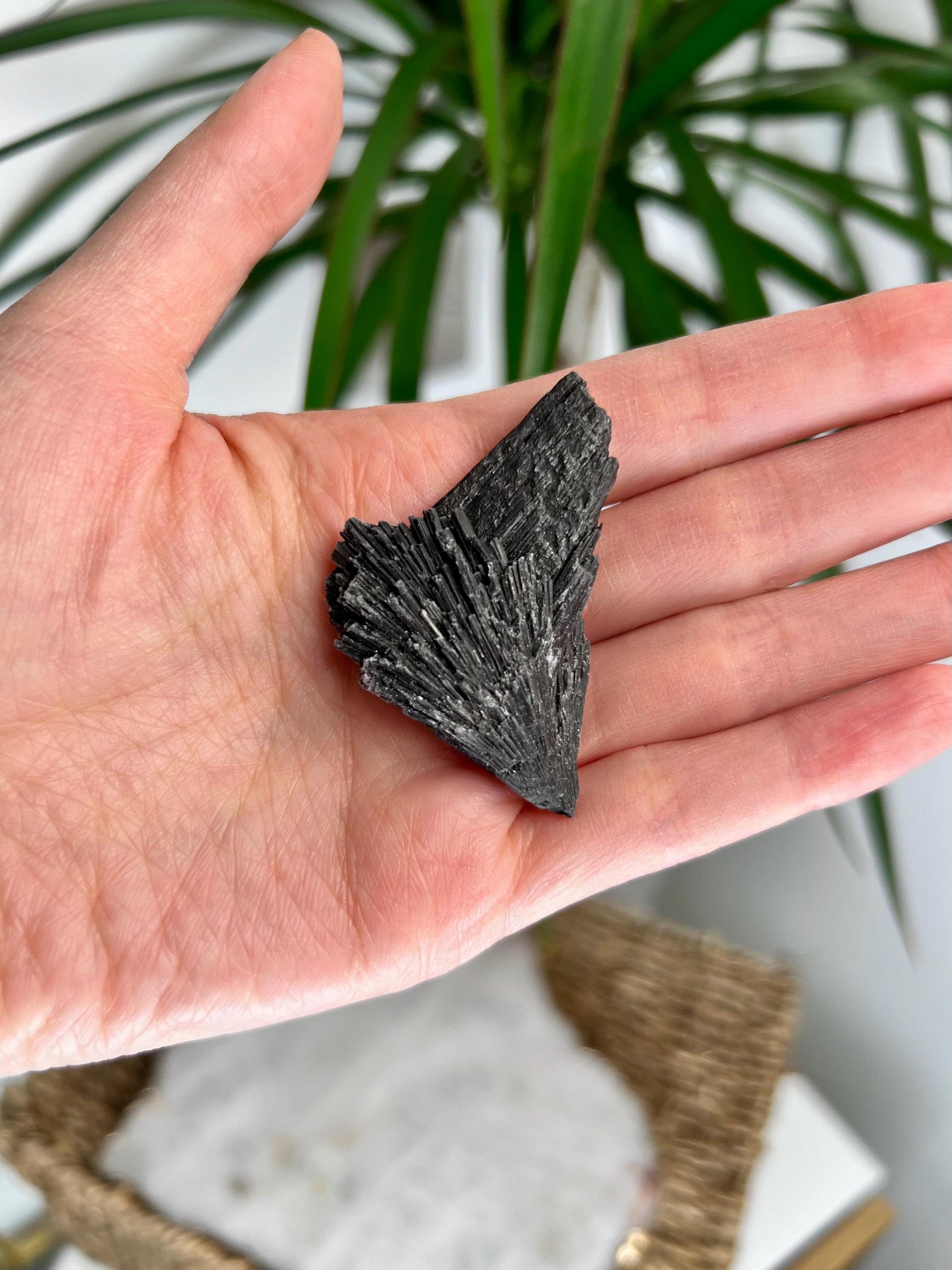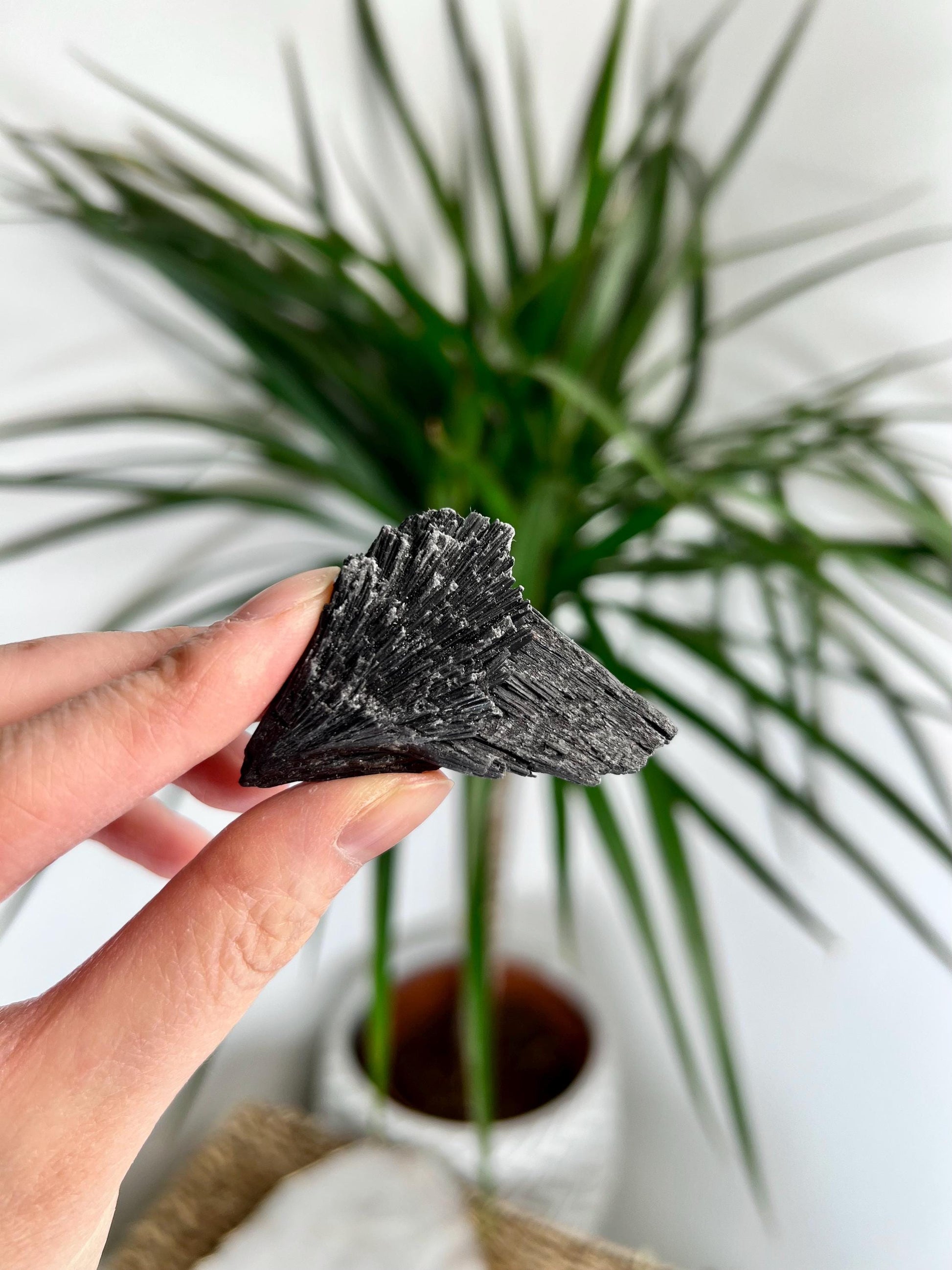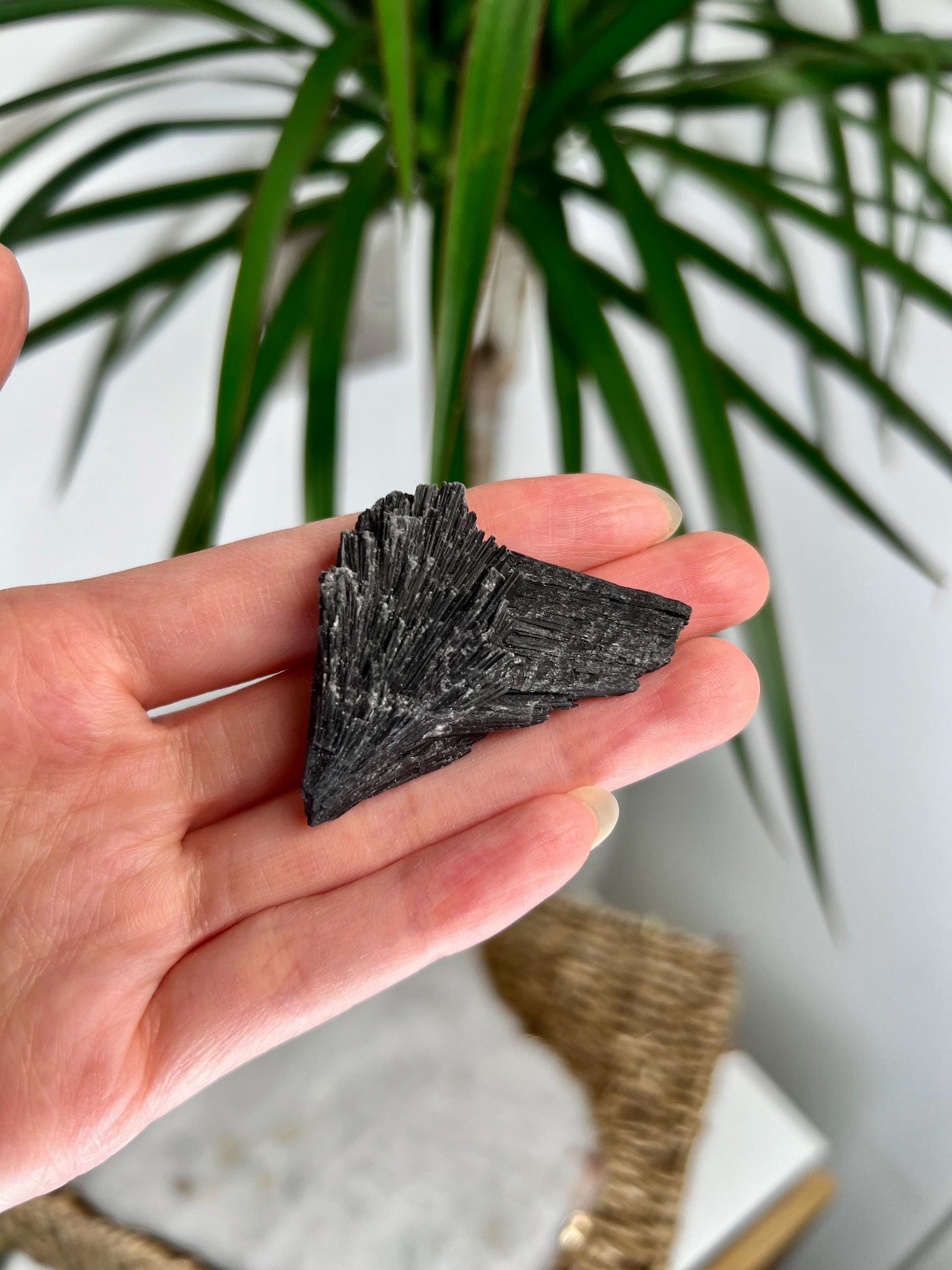 Black Kyanite is a powerful stone for protection, grounding, and clearing negative energies. Its unique blade-like structure is excellent for cutting through energy blockages and aligning the chakras. Black Kyanite doesn't need cleansing, as it automatically repels negativity and retains a high vibration. It's also known for connecting with higher spiritual realms while keeping you grounded.