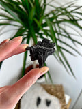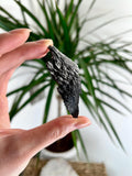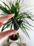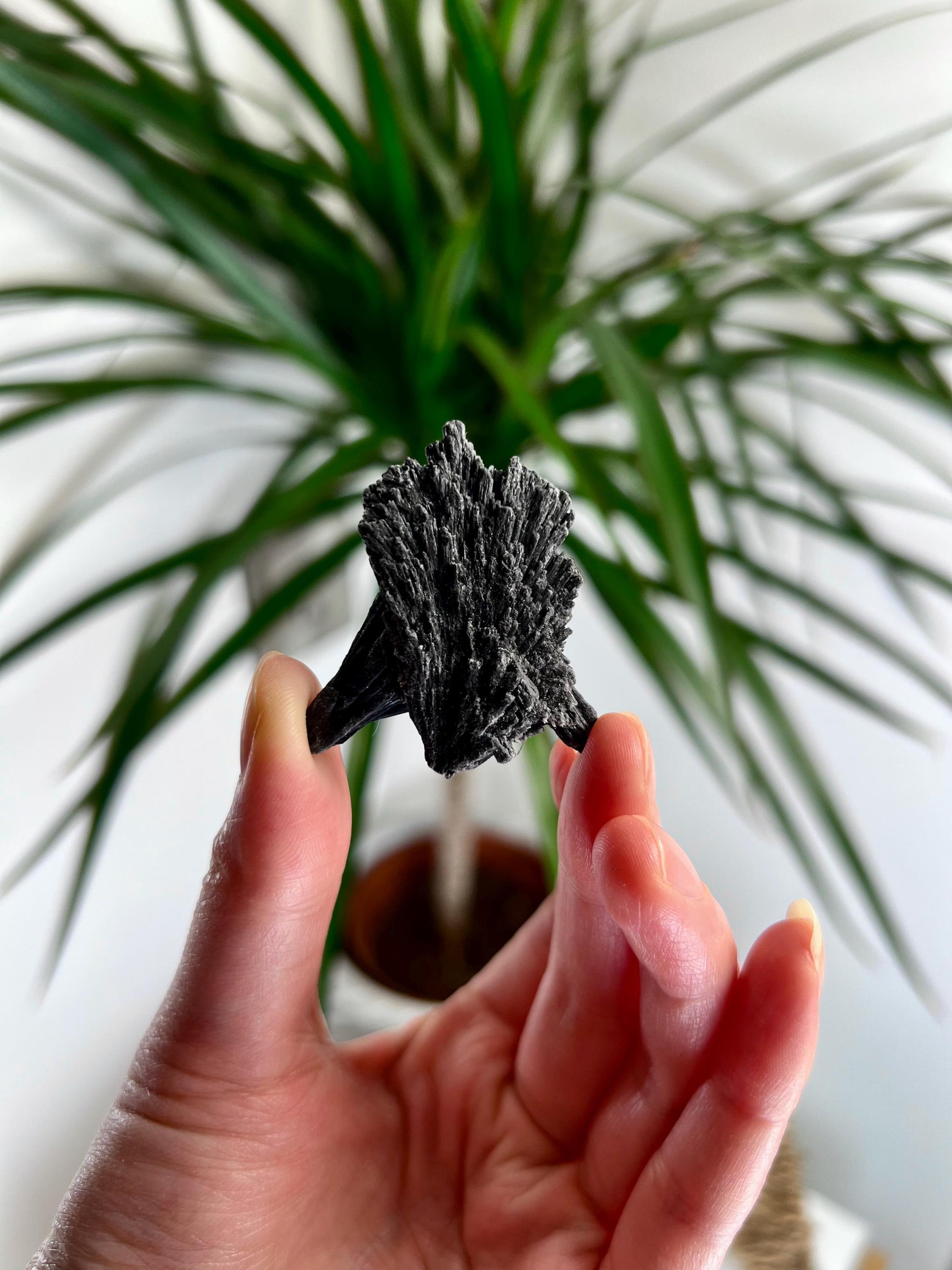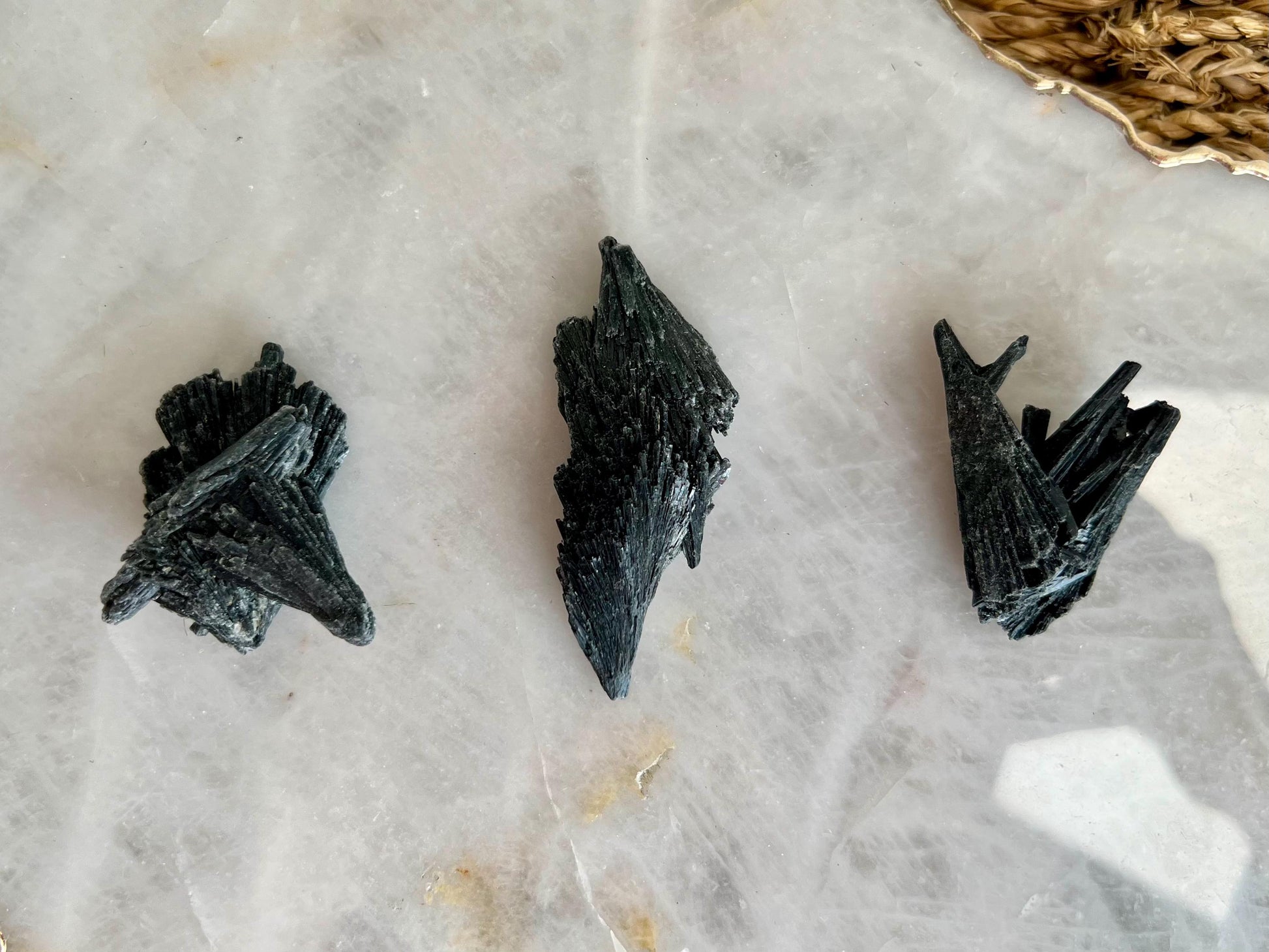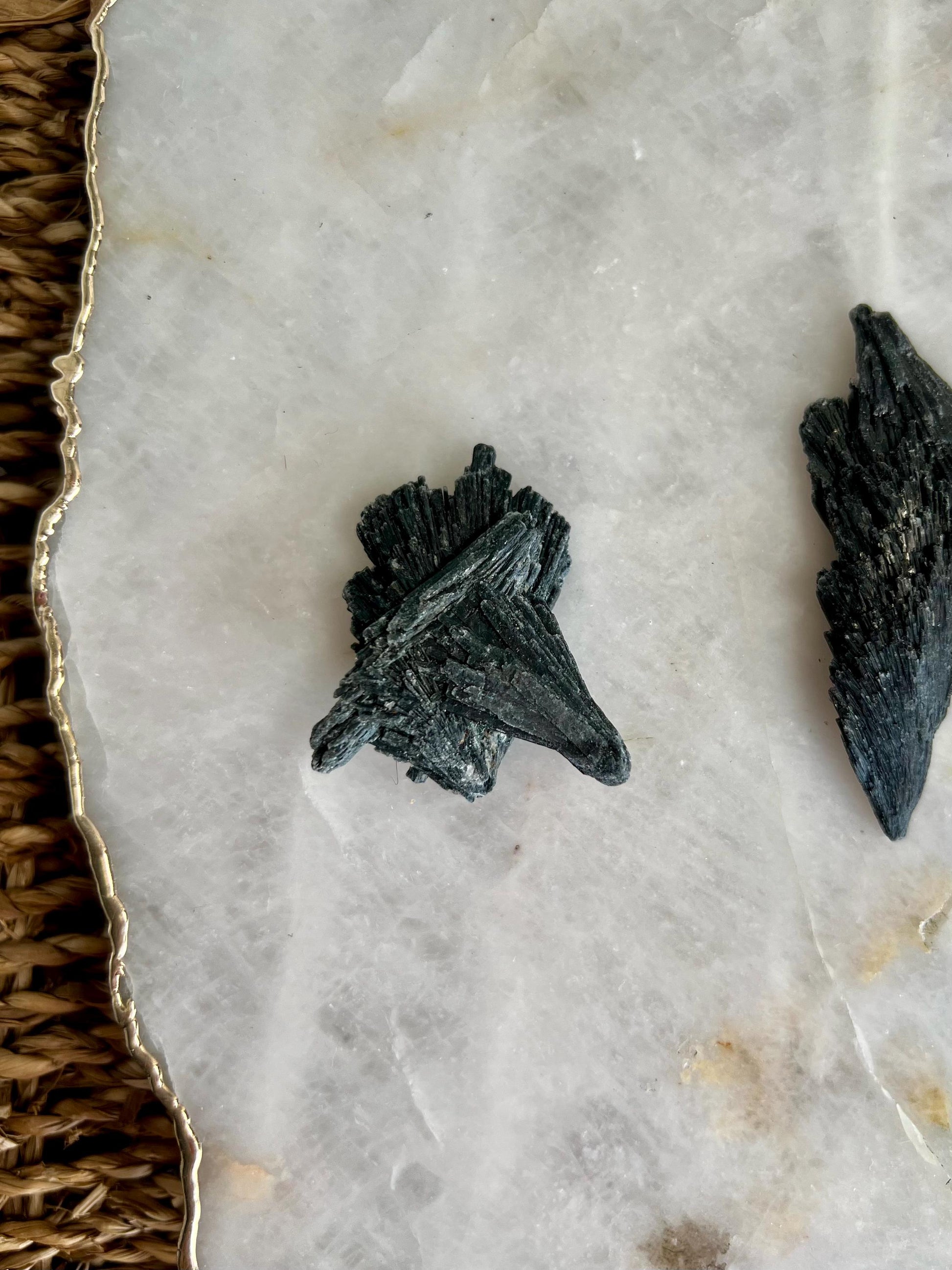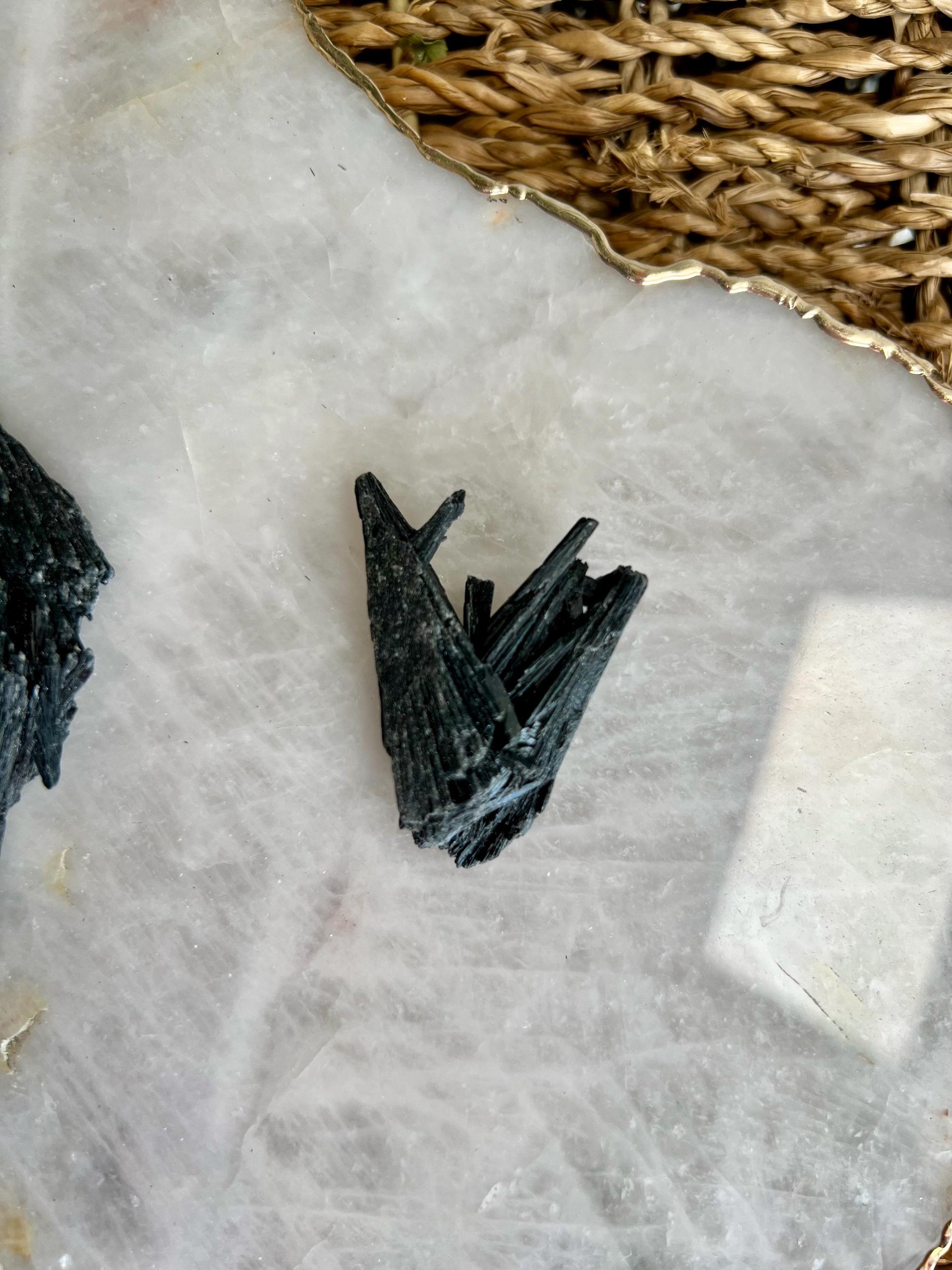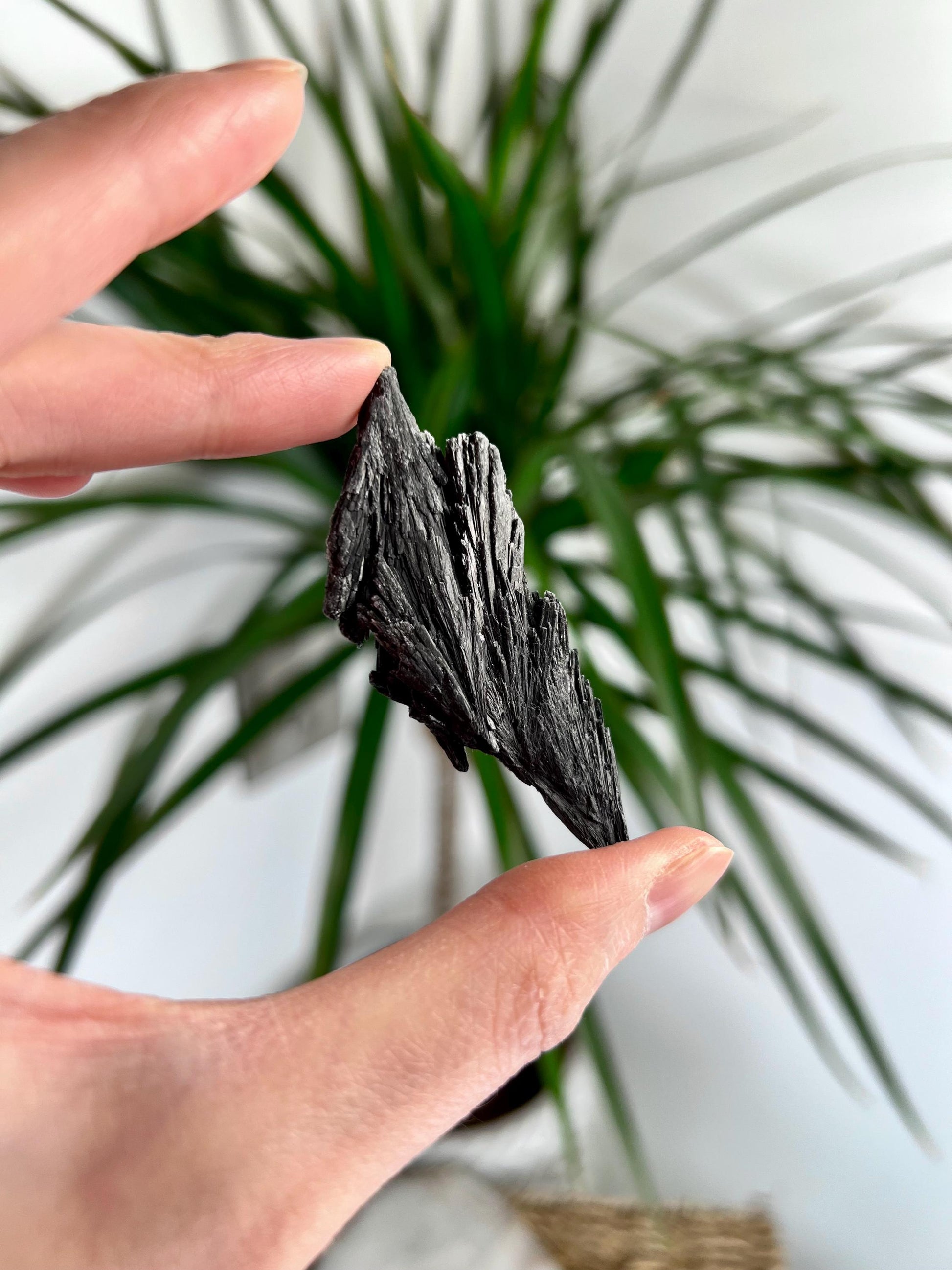 Black Kyanite is a powerful stone for protection, grounding, and clearing negative energies. Its unique blade-like structure is excellent for cutting through energy blockages and aligning the chakras. Black Kyanite doesn't need cleansing, as it automatically repels negativity and retains a high vibration. It's also known for connecting with higher spiritual realms while keeping you grounded.