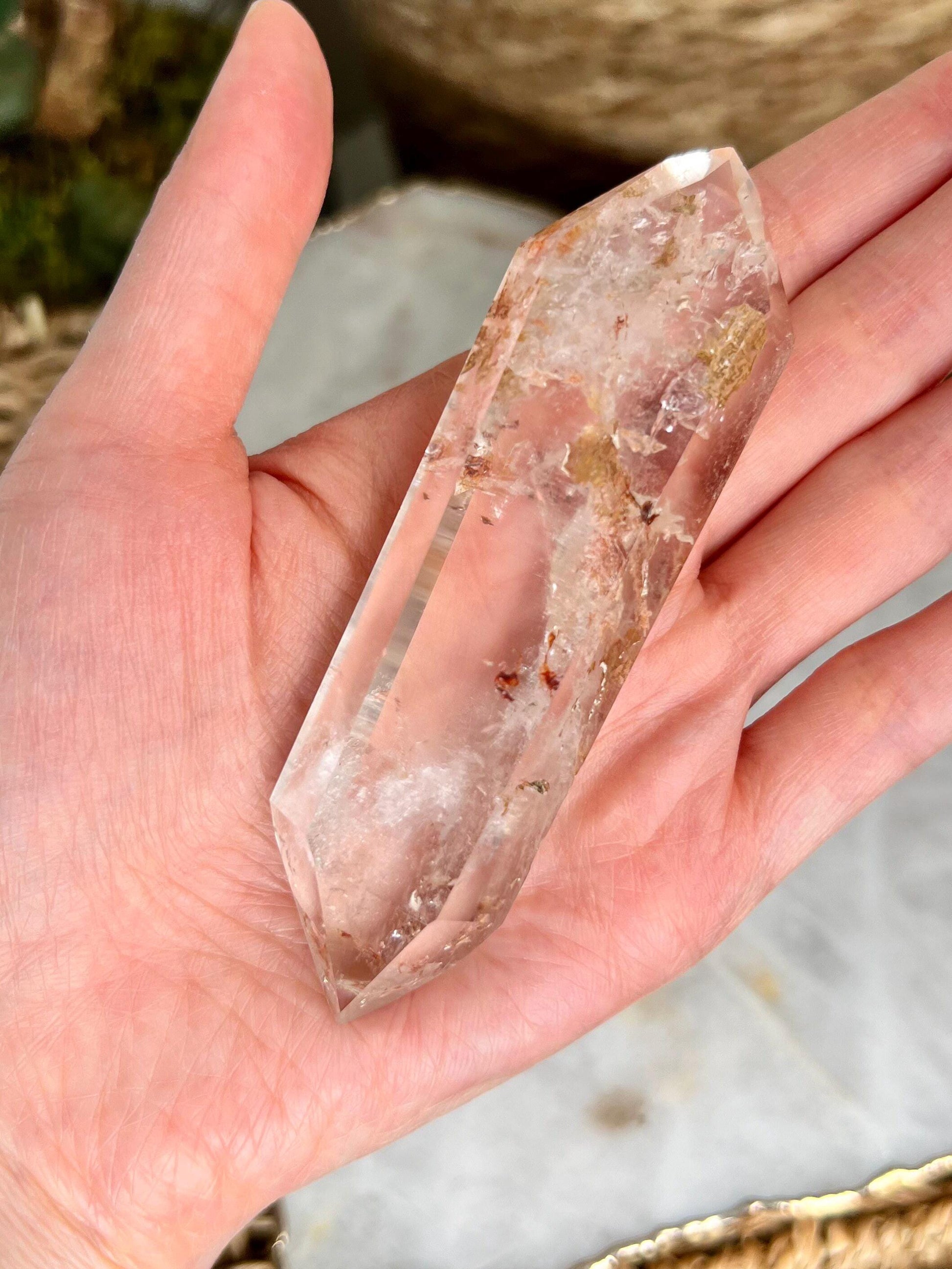 The Double-Terminated structure of the quartz allows it to send and receive energy simultaneously, creating a continuous flow of healing energy. It is especially helpful in spiritual communication and enhancing intuition. These inclusions in quartz also improve the crystal's ability to balance dualities-like spiritual and physical realities, thought and action-making it a perfect tool for those undergoing personal transformation.