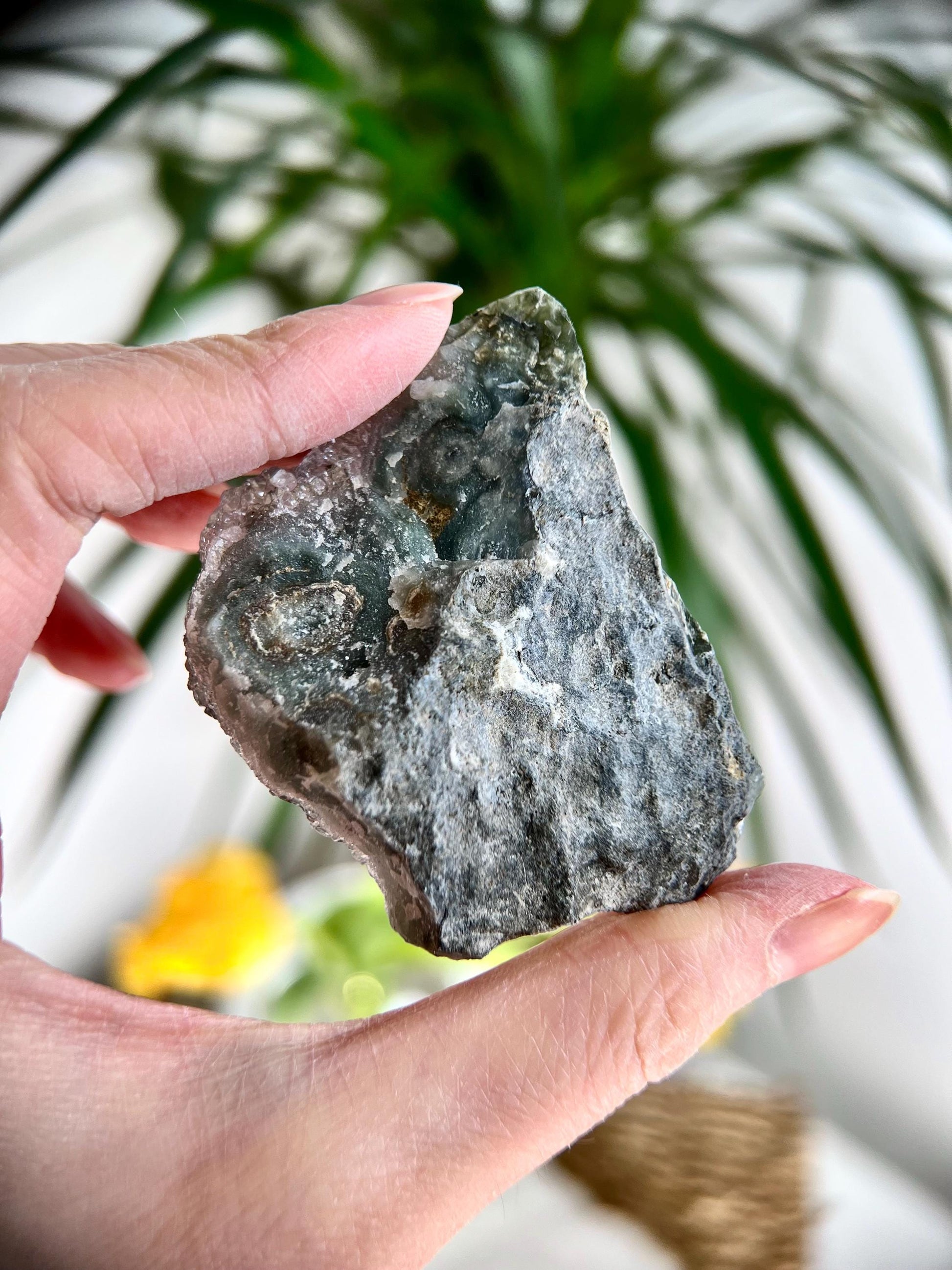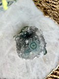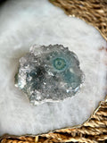 This Dark Druzy with Stalactite Eye combines grounding, intuitive, and emotional balancing properties. The dark druzy quartz connects deeply with the Root and Third Eye Chakras, offering grounding and heightened spiritual awareness. The Stalactite Eye focuses energy, amplifying intentions, and promoting clarity. Known as a unique variation of Rainbow Amethyst, this crystal bridges grounding energy with intuitive and emotional insight, making it a powerful tool for meditation and manifestation.