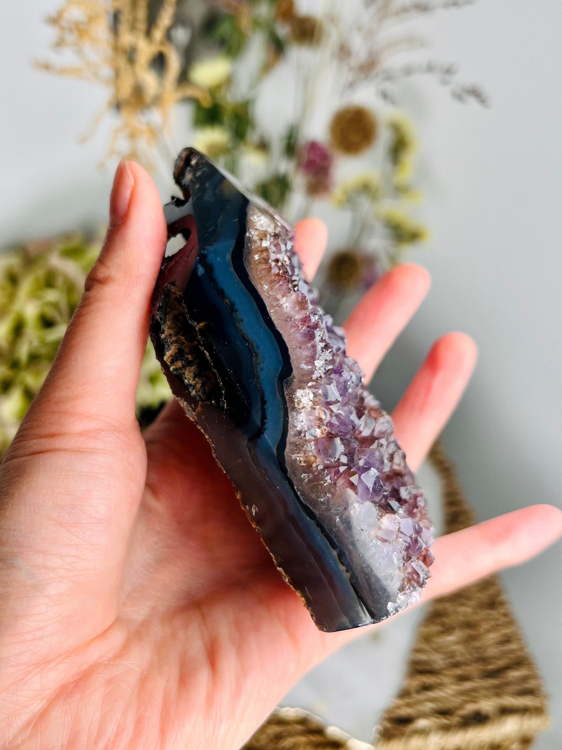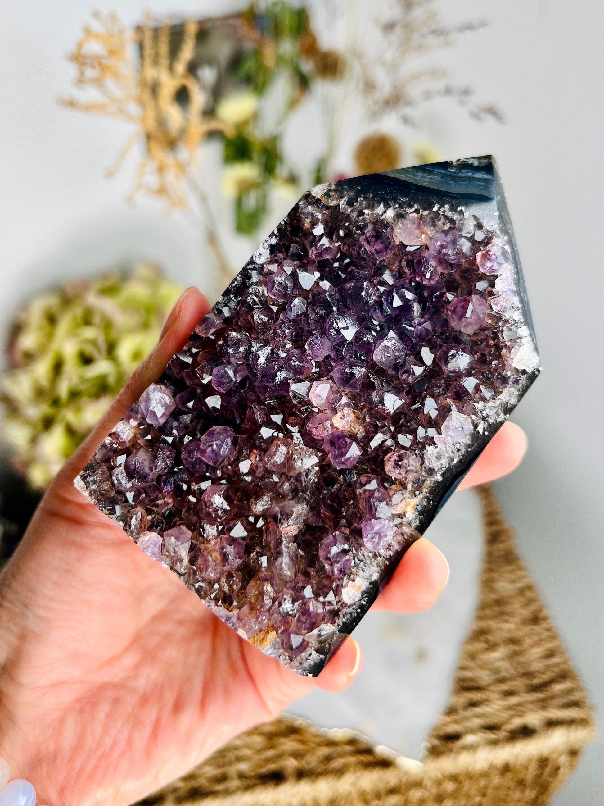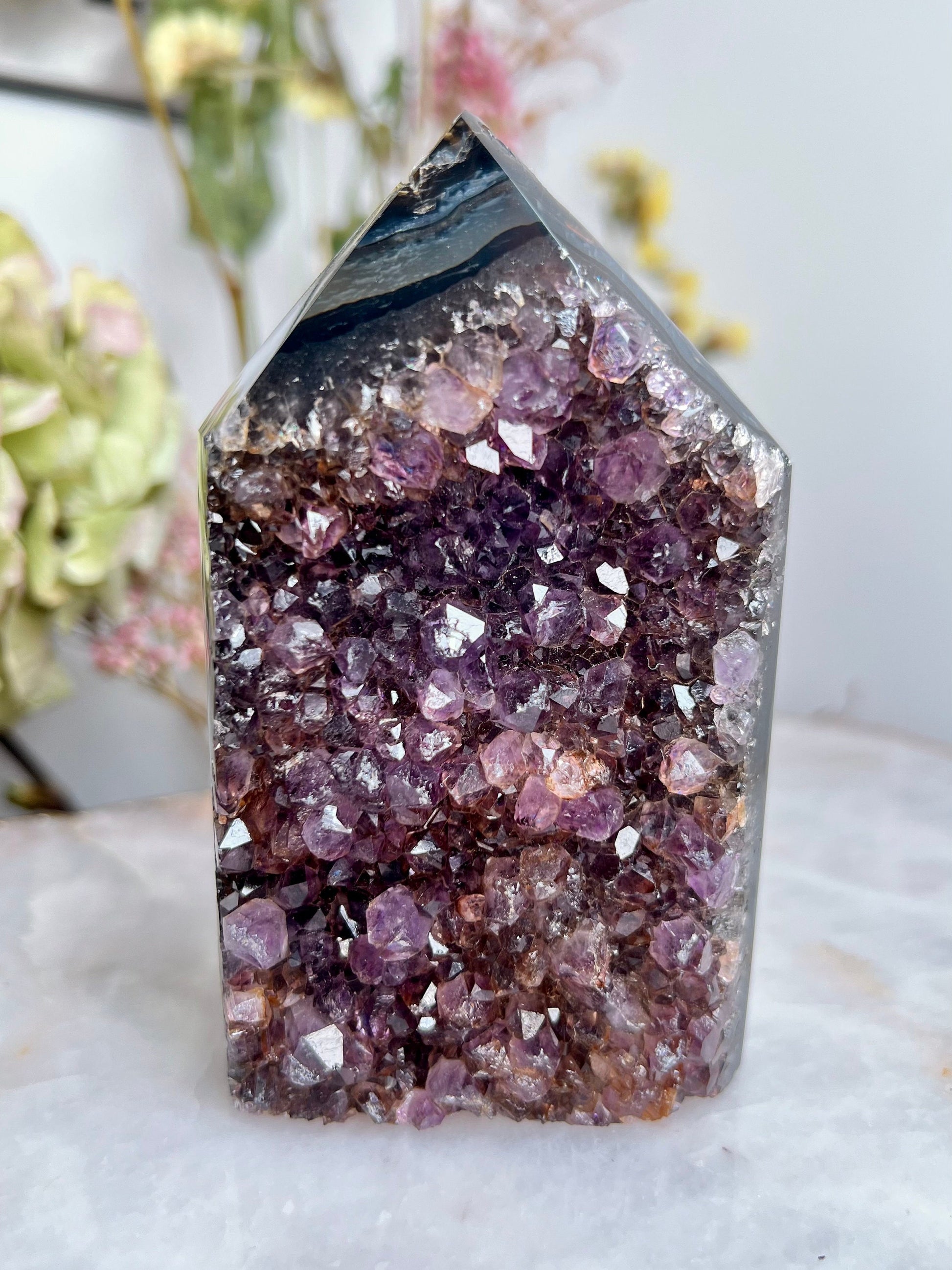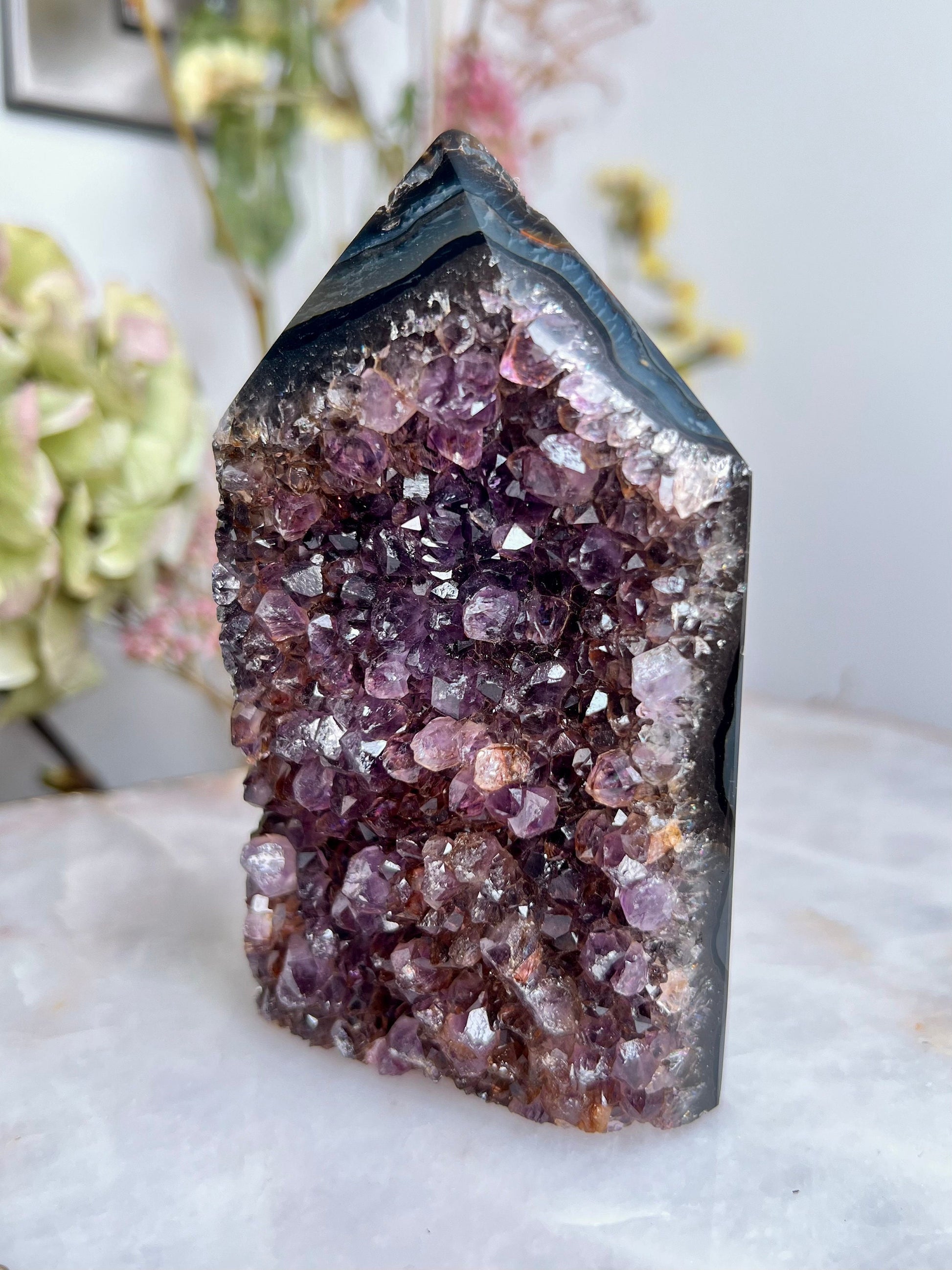 ✨ A Masterpiece of Natural Wonder - Presenting our Grade AAA Brazilian Amethyst Geode Tower, an exquisite embodiment of natural beauty and mystical energy. This tower features a striking agate layer on the back, adding to its uniqueness and elegance.