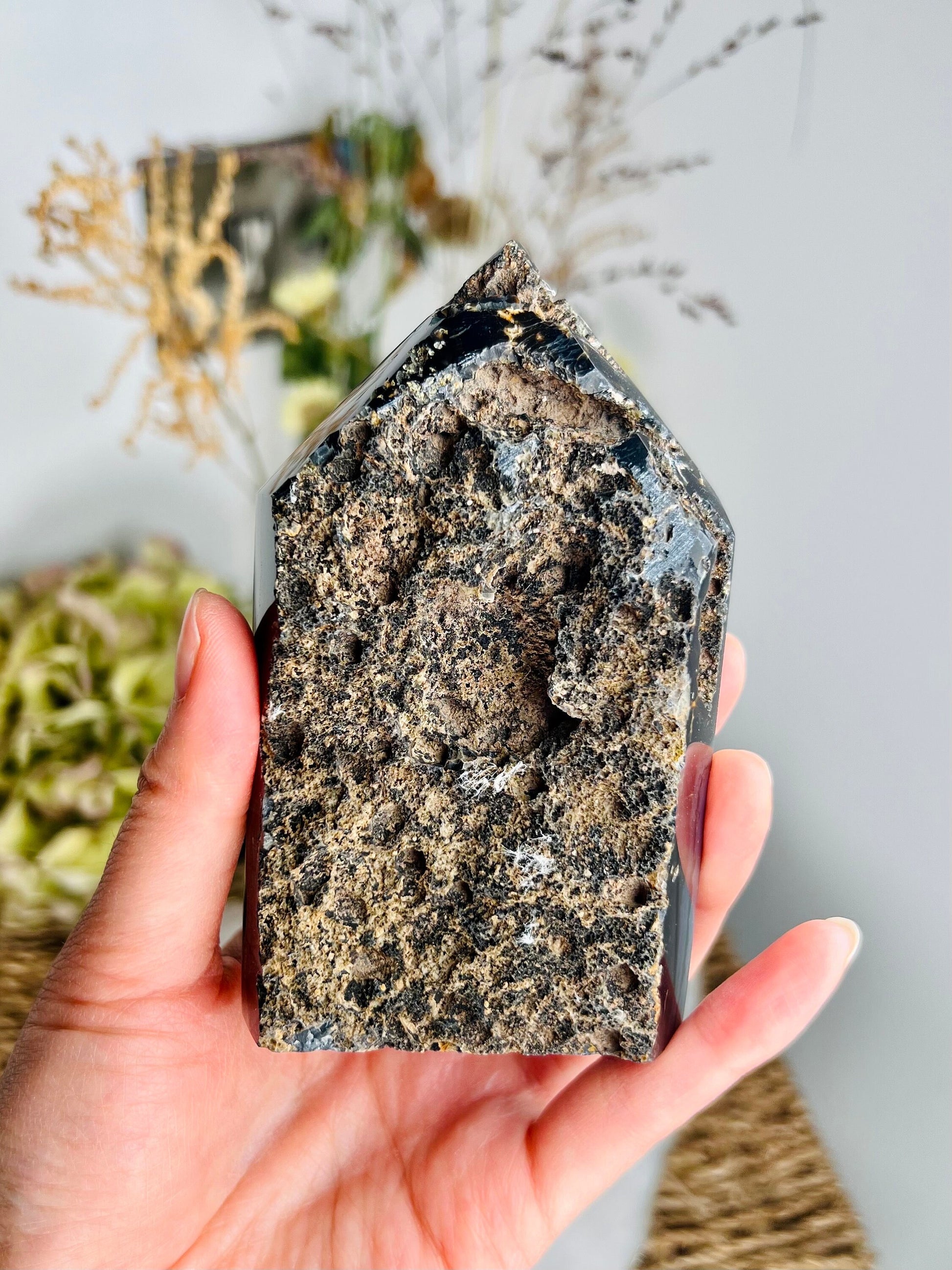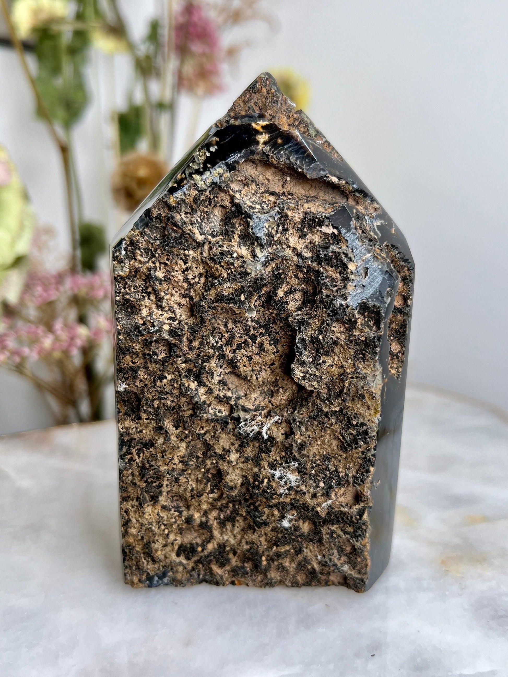 🌿 Agate Back - Stability and Harmony - The agate layer on the back of the tower not only adds a stunning visual contrast but also brings additional grounding and balancing energies, promoting harmony and stability in your environment.