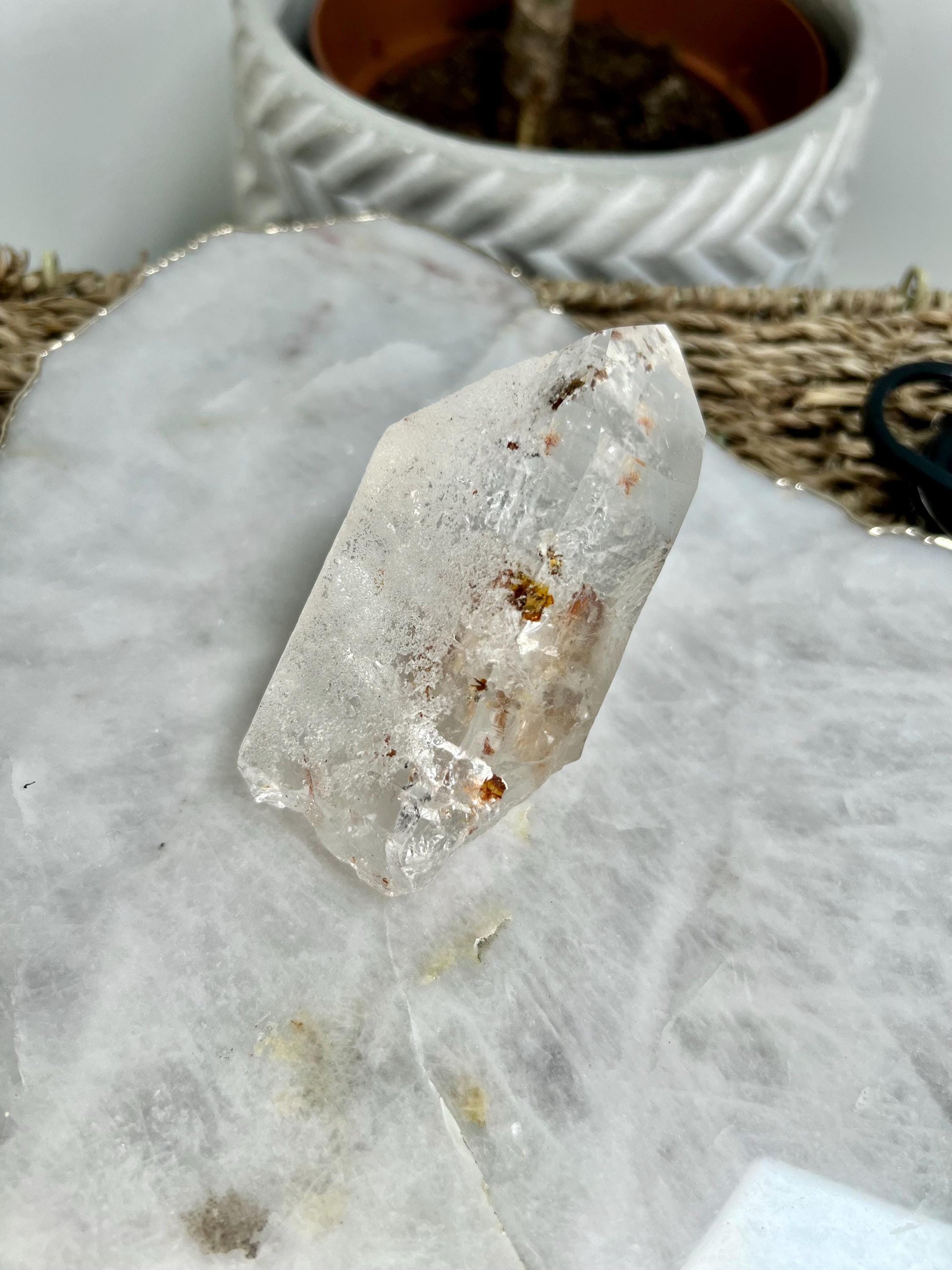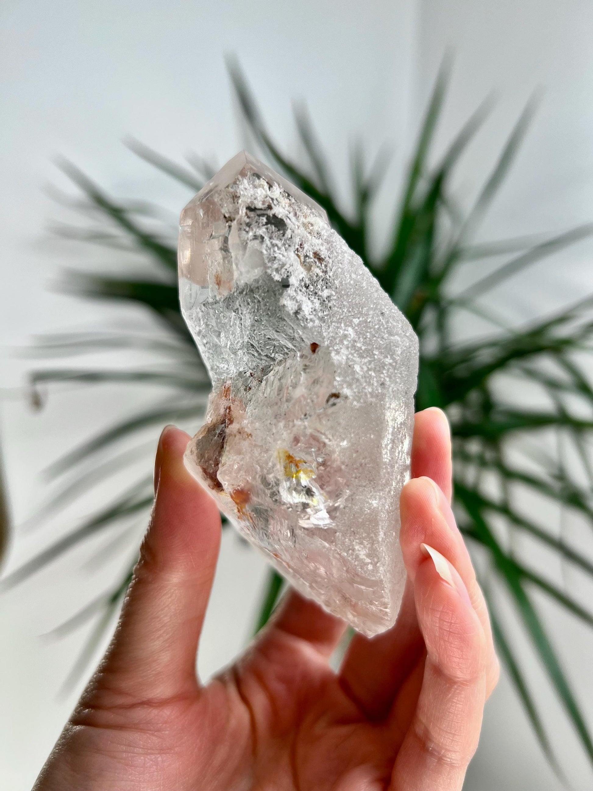 This powerful Cathedral Lemurian Quartz is a masterful combination of ancient wisdom and grounding energy. The Cathedral Formation offers a metaphysical gateway to the Akashic Records, where universal truths and spiritual knowledge are stored. Iron inclusions provide grounding, strength, and emotional resilience, while the self-healed feature symbolizes renewal and recovery, helping you to navigate and overcome challenges.