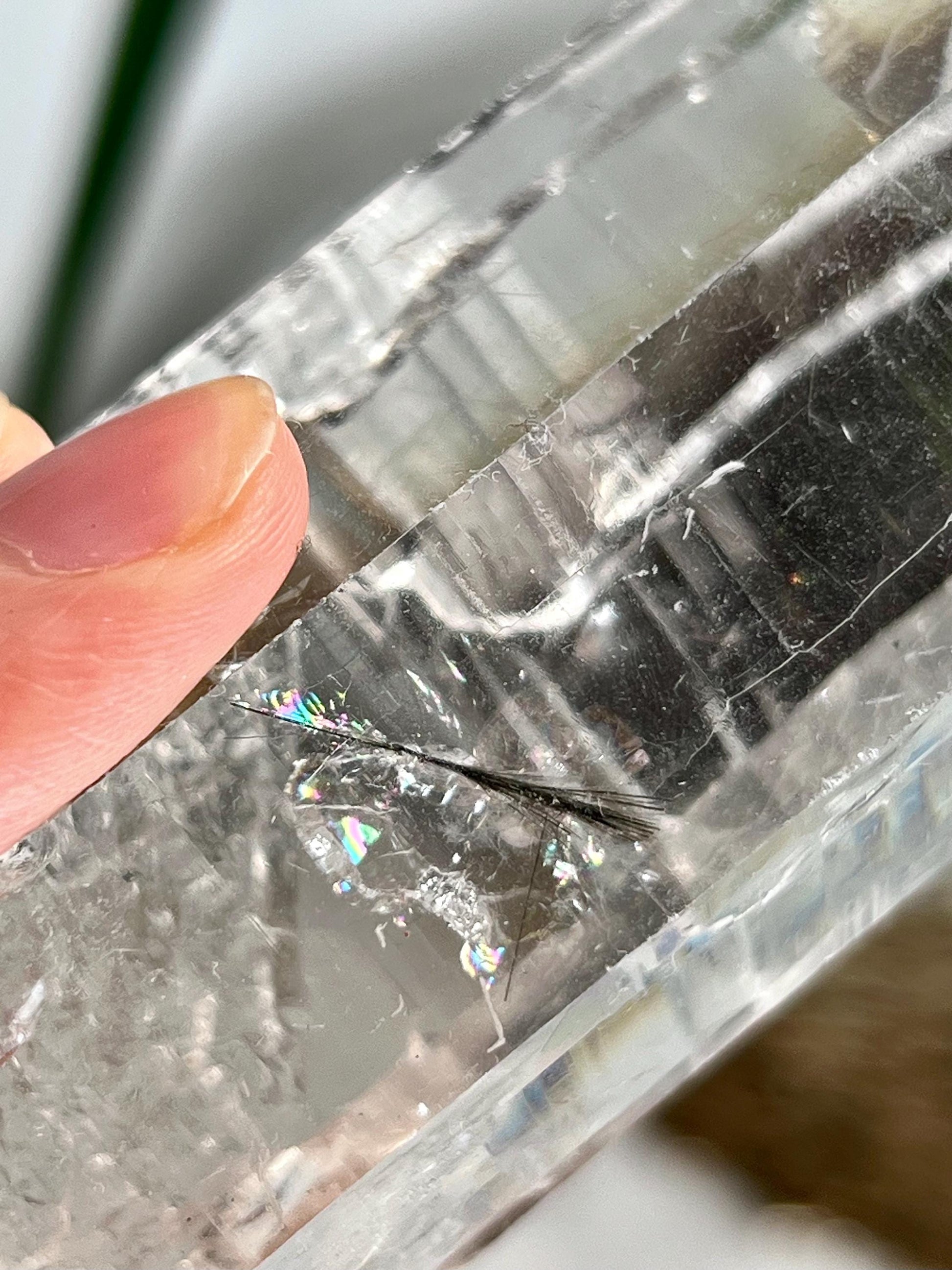 This stunning Cathedral Lemurian Quartz carries the profound energy of divine connection and healing. The Black Rutile inclusions amplify its vibrational power, aiding in clarity, transformation, and manifestation. The radiant rainbows uplift the spirit and bring emotional harmony. Its self-healed formation symbolizes growth through adversity, offering a sense of renewal and resilience.