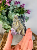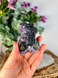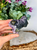 Amethyst Flower Stalactite is a rare and unique formation that combines the soothing, spiritual energy of Amethyst with the high vibration of Stalactite growth. Known for its deep purple hues, Amethyst aligns with the Crown and Third Eye Chakras, promoting spiritual awareness, calmness, and emotional balance. The flower-like pattern in this stalactite formation amplifies the stone's energy, creating a high-frequency crystal that encourages harmony and opens pathways to higher consciousness.