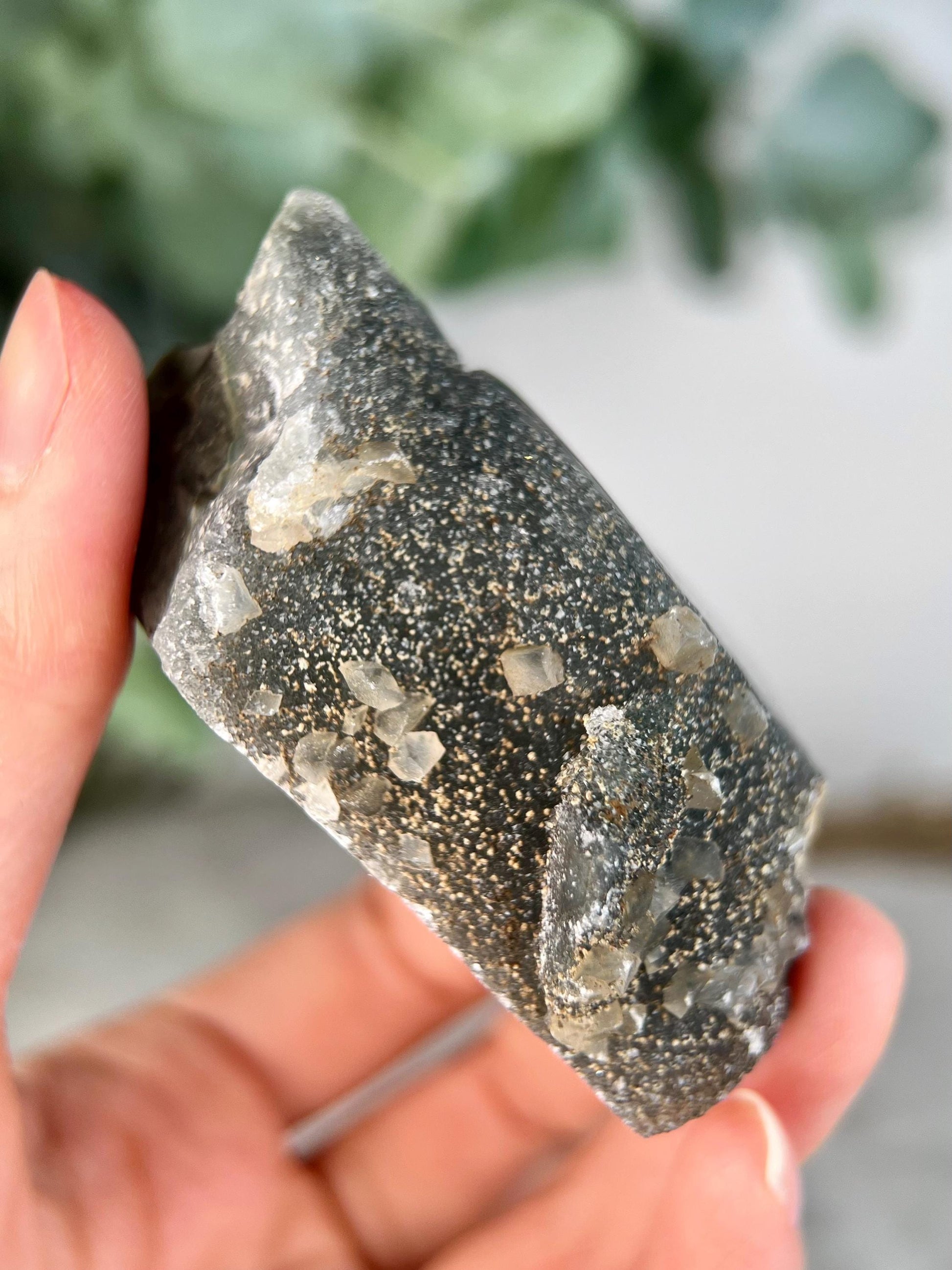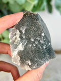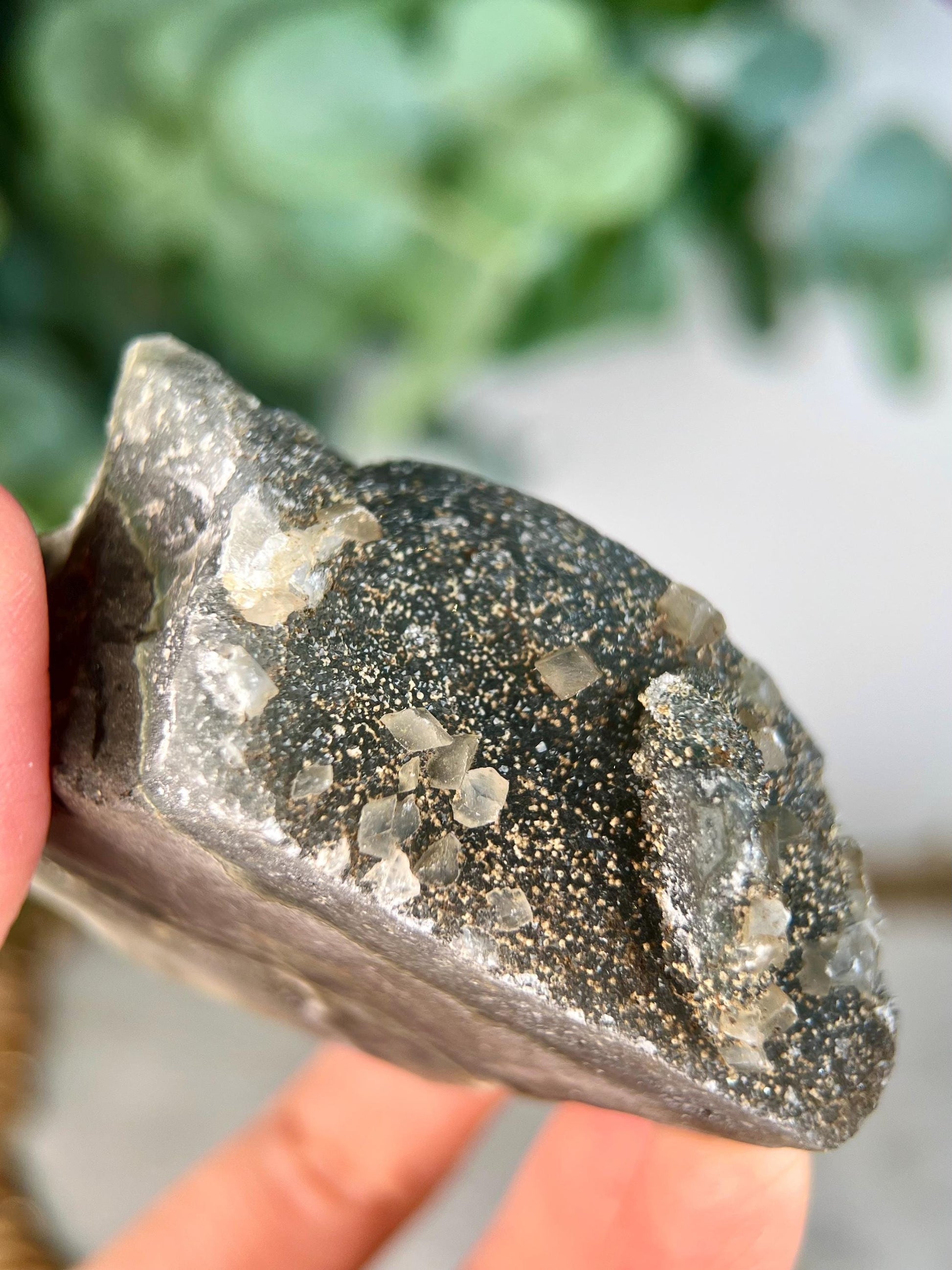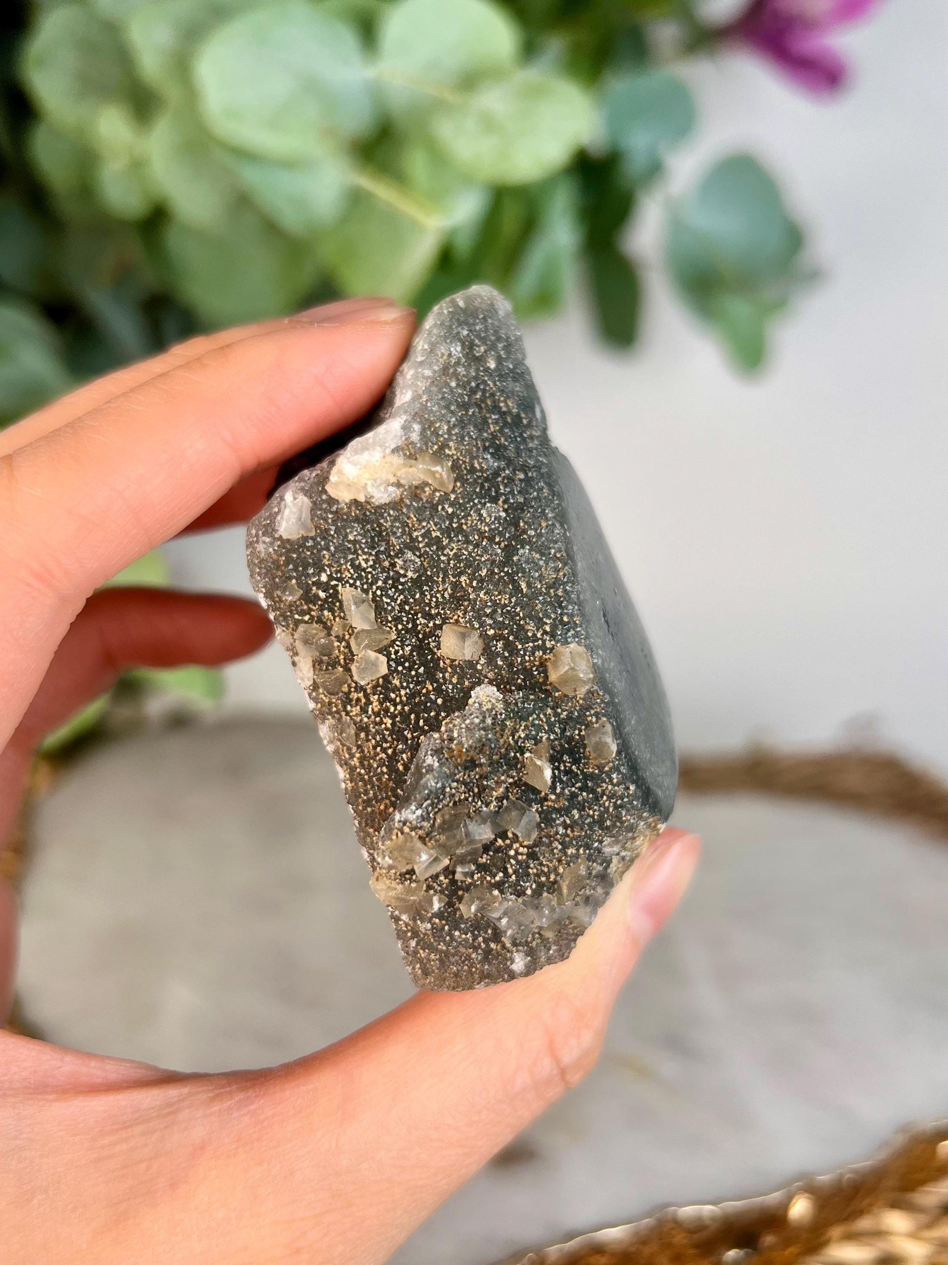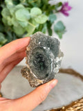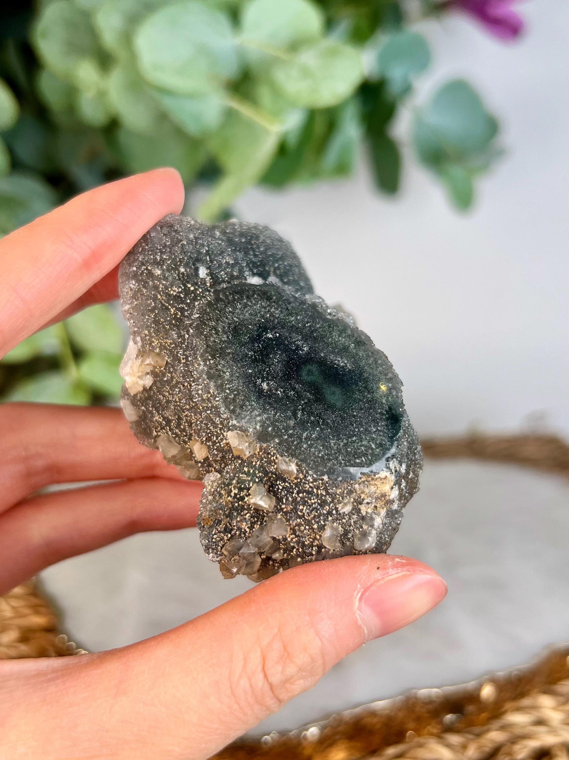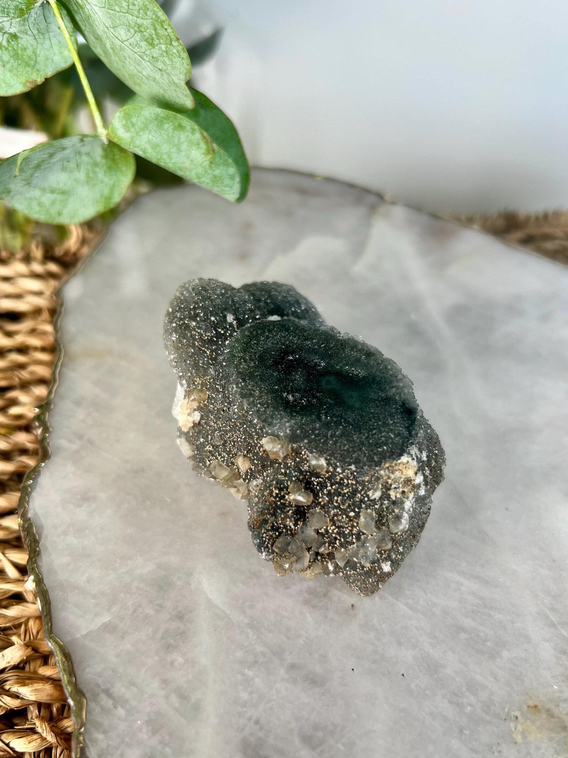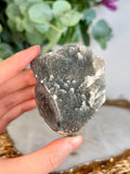 Grade AA Natural Green Jasper Grey Druzy Stalactite Eye with Calcite Cubes from Uruguay – Rainbow Amethyst, Heart Chakra, US114, 136g