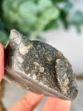 This Green Jasper Druzy Stalactite, also known as Rainbow Amethyst, is a rare and mesmerizing crystal formation. Combining the grounding and nurturing energy of Green Jasper with the high-vibration healing properties of Amethyst, this crystal bridges the physical and spiritual realms. The druzy texture enhances the crystal's natural energy amplification, making it a powerful tool for healing, grounding, and connecting with the heart chakra.