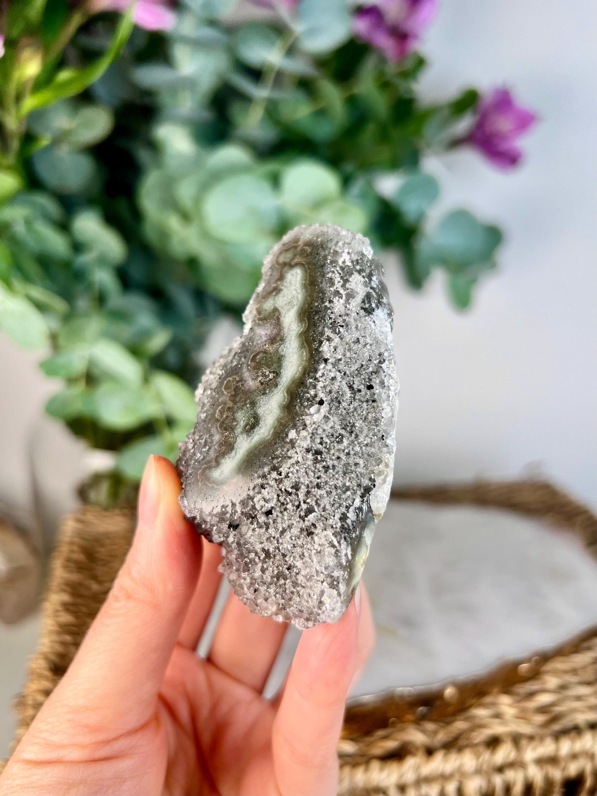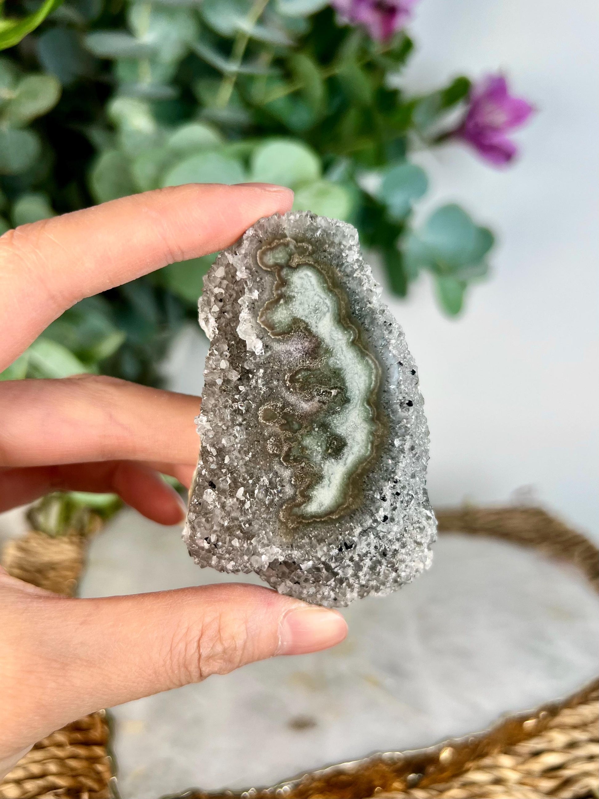 🌍 Origin: Sourced from Uruguay, this crystal combines the region's iconic deep green jasper hues with druzy amethyst formations, creating a one-of-a-kind natural masterpiece.