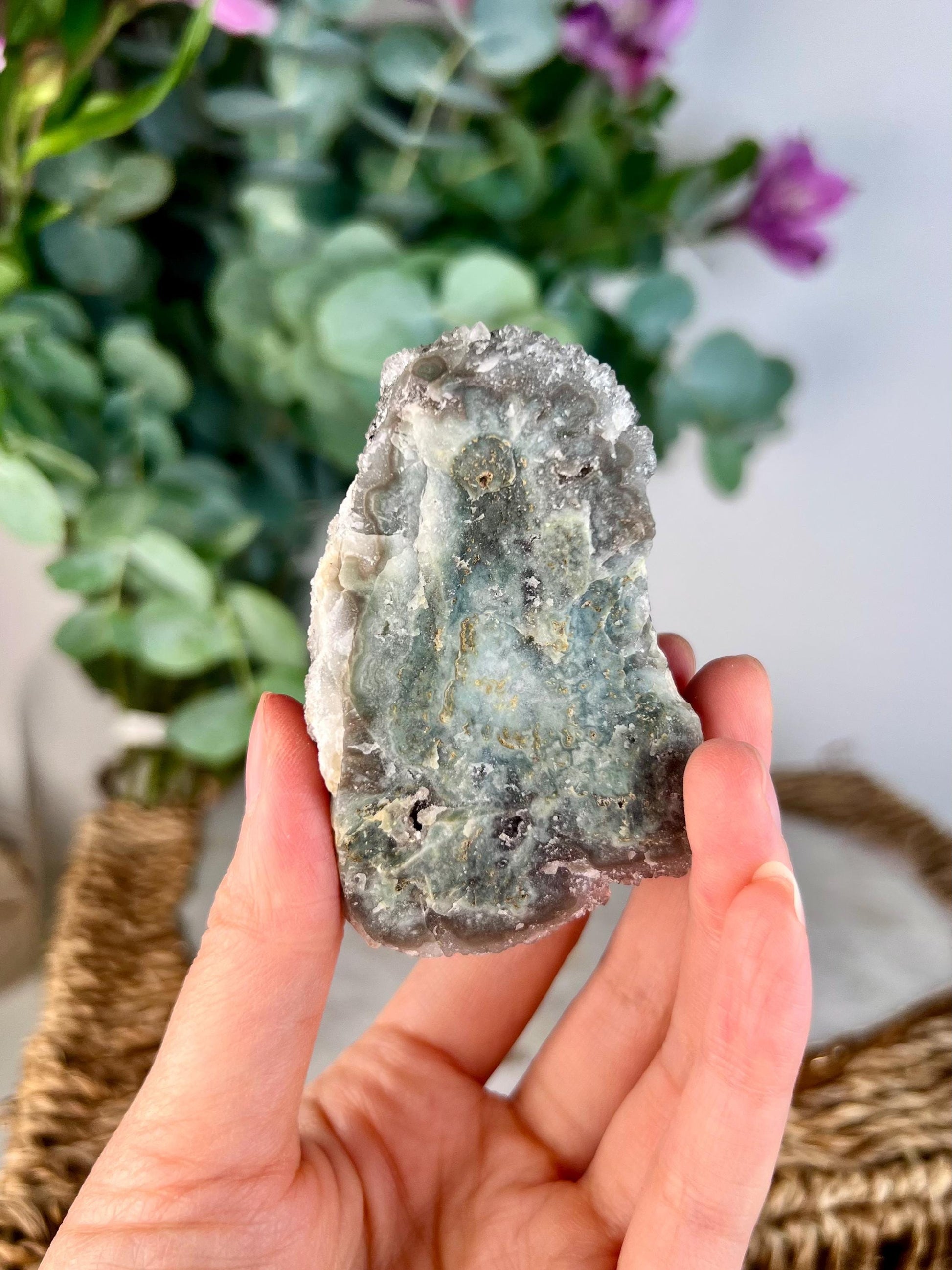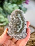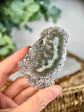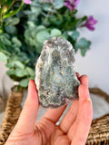 This Green Jasper Druzy Stalactite, also known as Rainbow Amethyst, is a rare and mesmerizing crystal formation. Combining the grounding and nurturing energy of Green Jasper with the high-vibration healing properties of Amethyst, this crystal bridges the physical and spiritual realms. The druzy texture enhances the crystal's natural energy amplification, making it a powerful tool for healing, grounding, and connecting with the heart chakra.