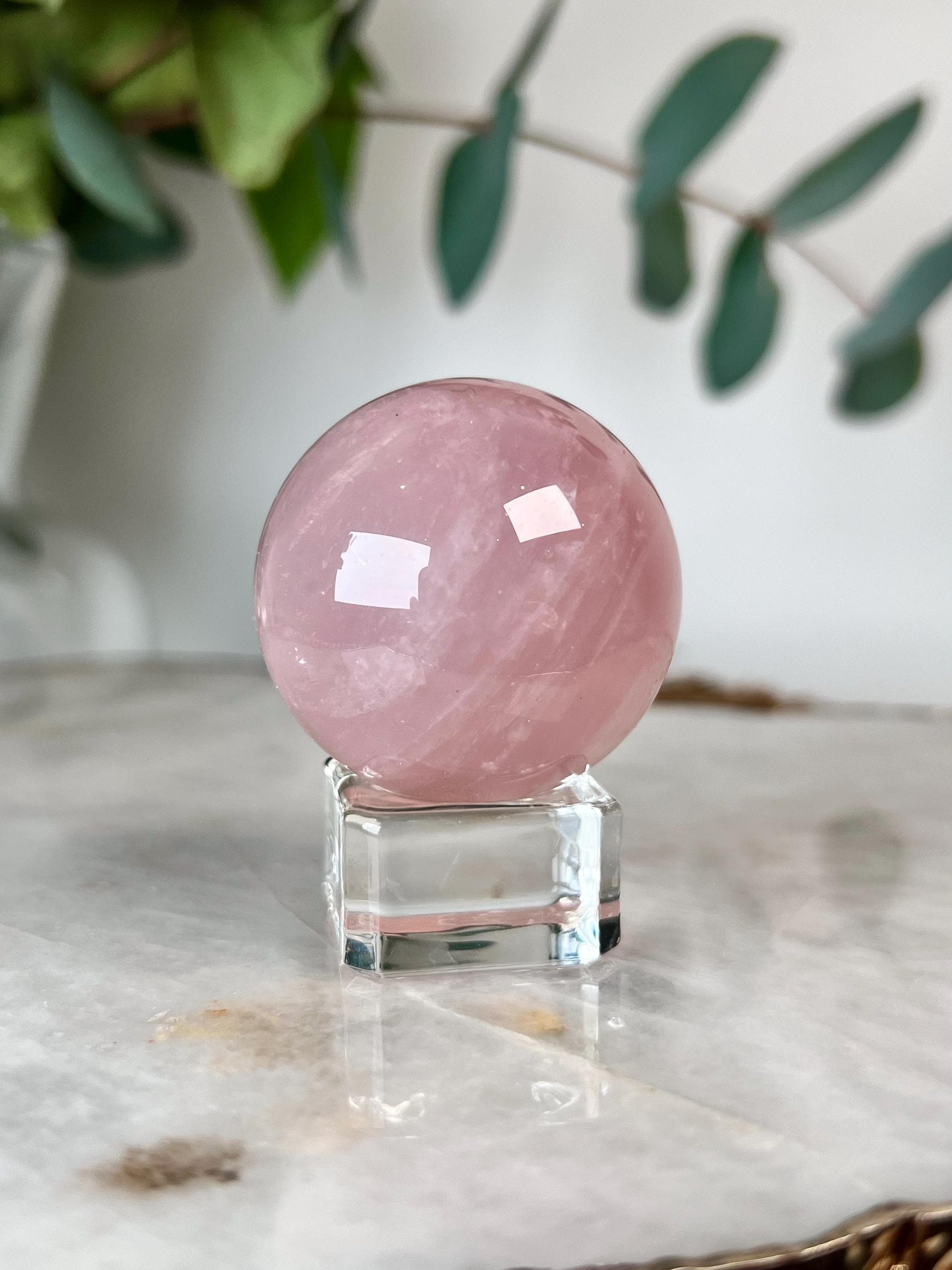 The sphere shape emits energy evenly in all directions, making it ideal for creating a peaceful, loving atmosphere in any space. With its natural sparkle and perfect symmetry, this Rose Quartz sphere is not just a healing tool-it's a heart-centered work of art.