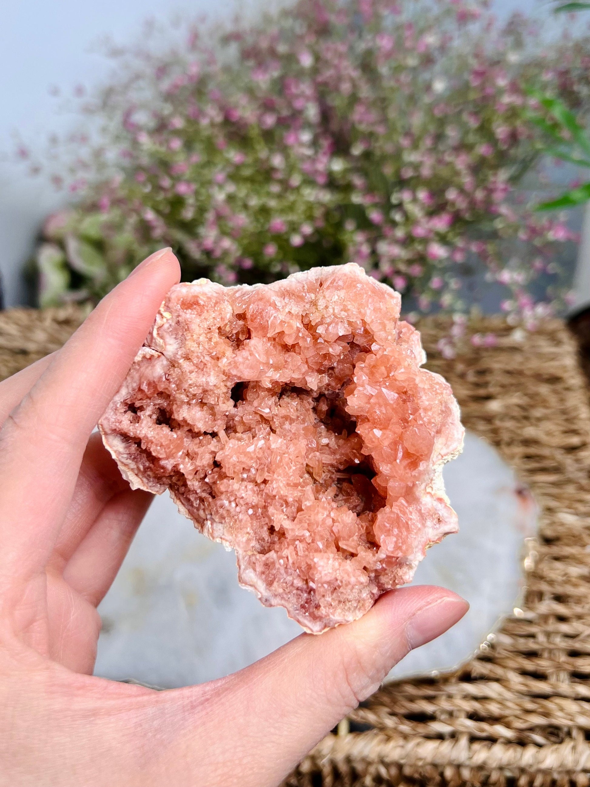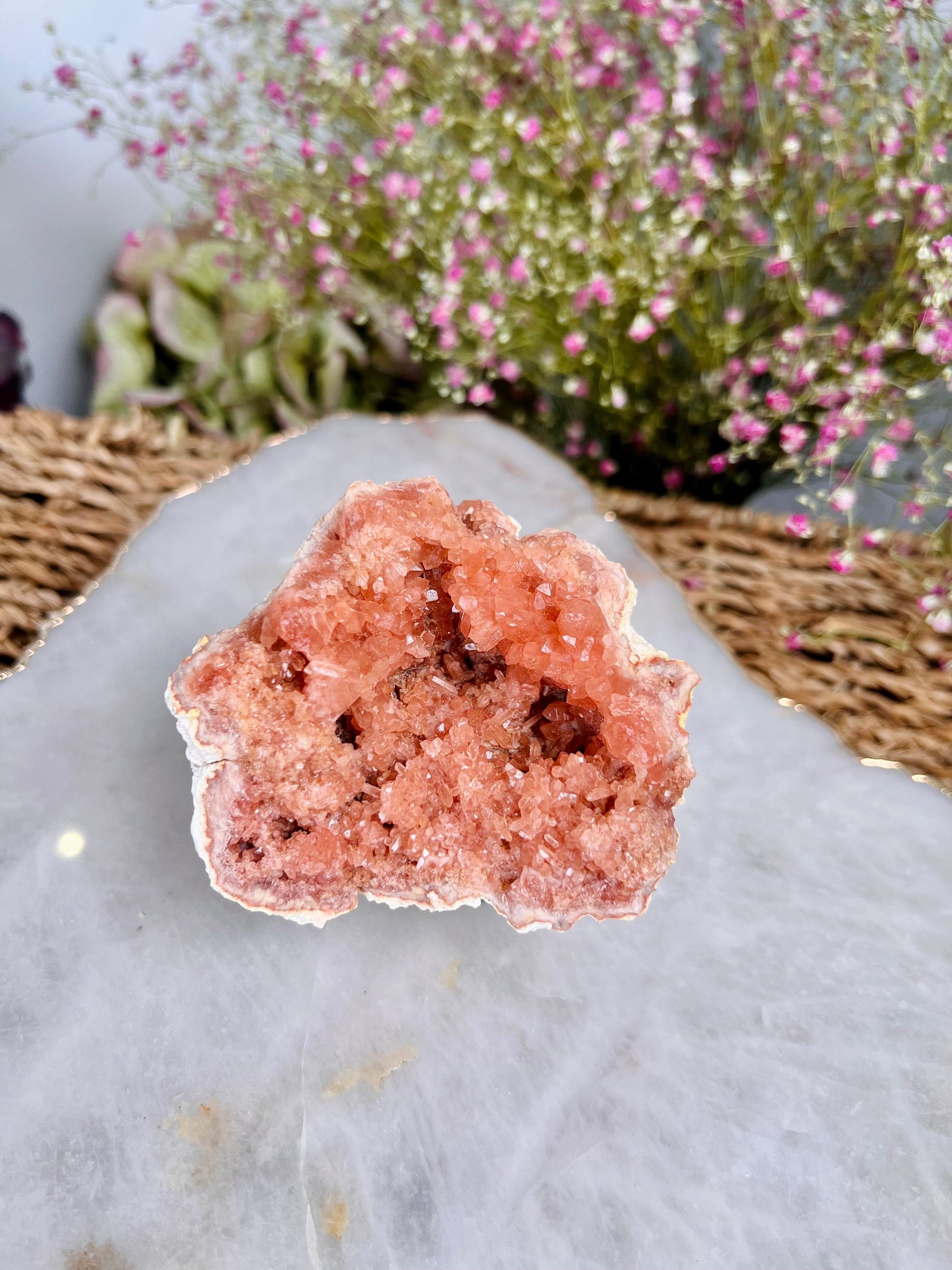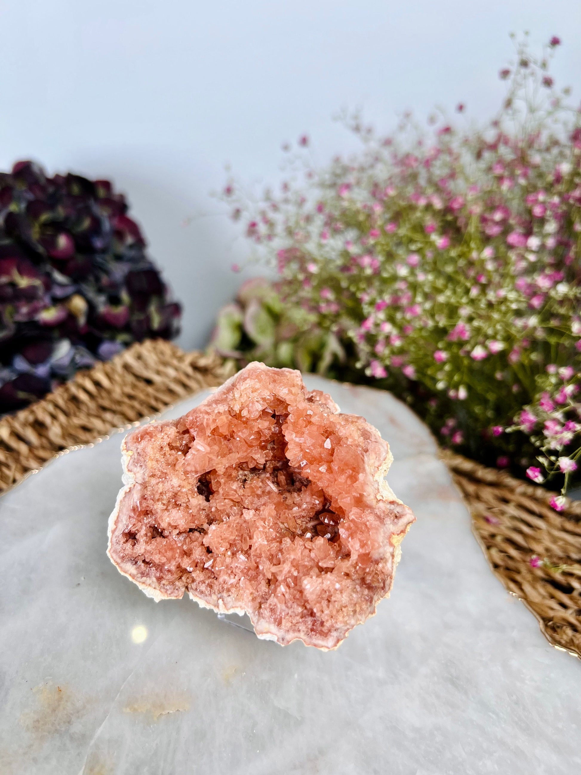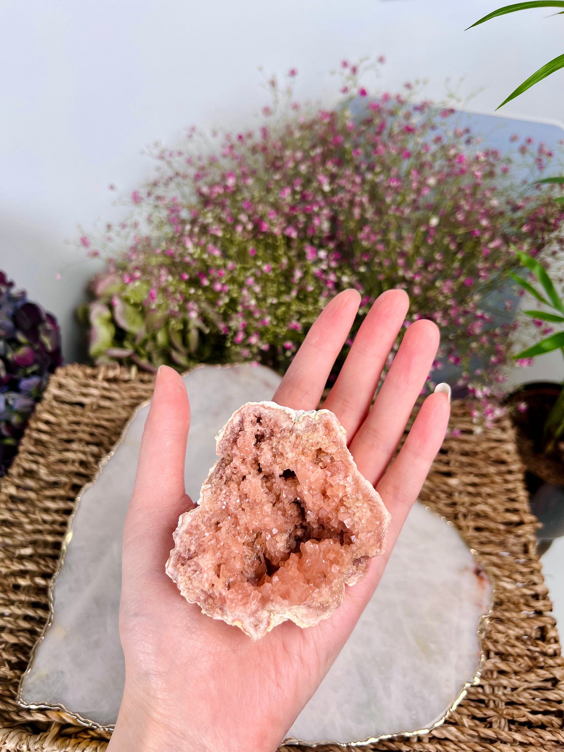 PROPERTIES | Pink Amethyst, also known as Lavender Amethyst or Rose Amethyst, is a high-vibrational crystal with many of the same energies as the traditional Amethyst but includes additional properties that will surround you with sweet, loving energy. The energy of these pink amethyst is so uplifting and the vibrations are incredible. Pink Amethyst is believed to assist in finding relief from overwhelming situations and feelings of victimization. It is said to protect from negative vibes arising from lack of patience and induce calmness from betrayals. These Pink Amethyst geodes are everything you need to set a soft, soothing mood for your space. Pink Amethyst crystals may have a delicate shade and light energy, but they are actually a high-vibrational stone with the power to help you conquer your negativity. Bring ease to your mind with the comforting and relaxing energy of these Pink Amethyst geodes. A Pink Amethyst crystal in the bedroom, and particularly on the nightstand so that it is close to you while you sleep, will usher you into a restful night's sleep. By connecting with the third eye and heart chakras, the Pink Amethyst properties cleanse the mind of anxieties that keep you up at night. At the same time, its pink hue fills your spirit and your space with comfort and support.