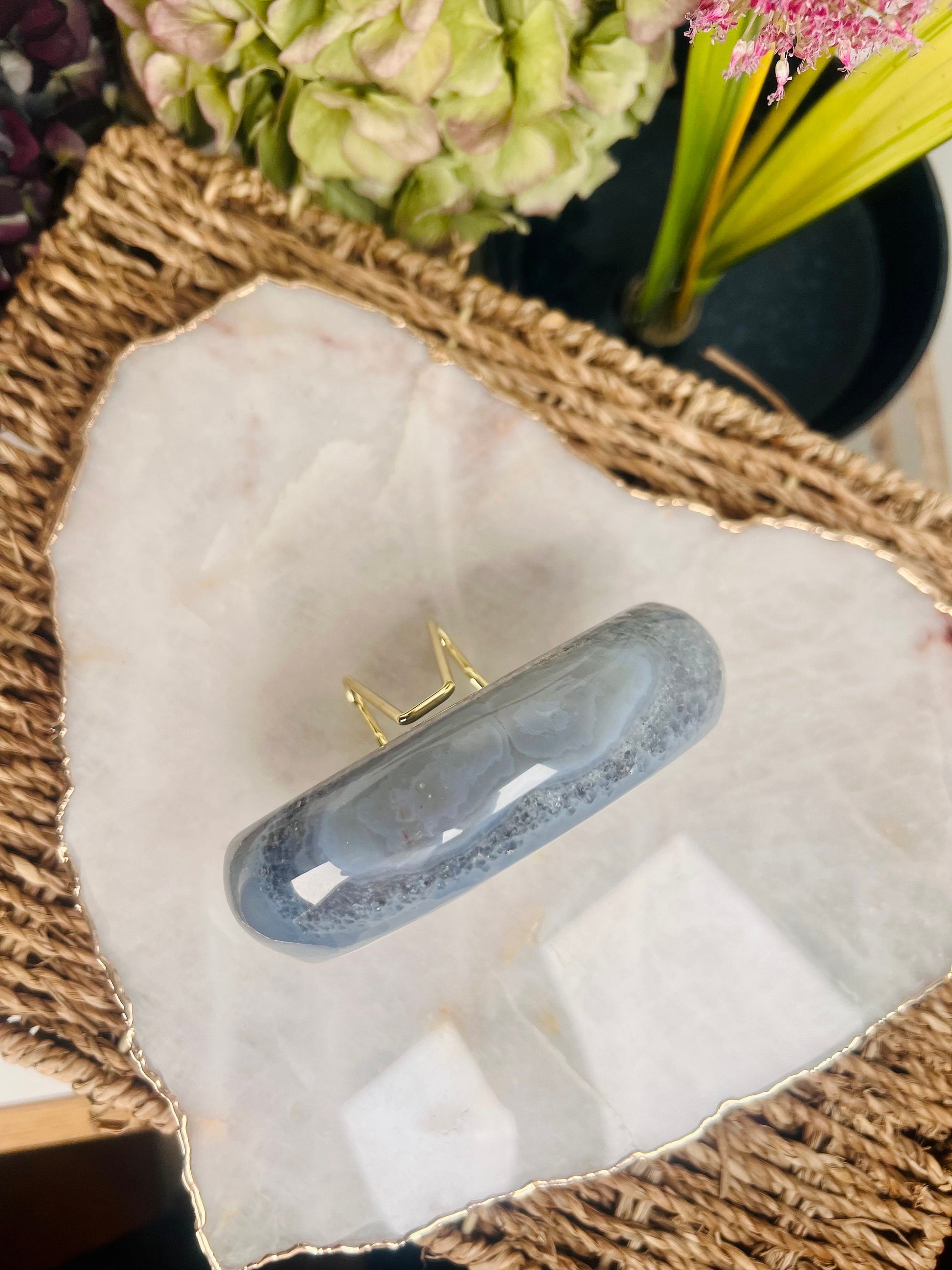 It has a natural combination of Clear Quartz and Agate with druzy (Known as " Angel Kisses" in Brazil). Sometimes you may even find other natural mineral inclusions for extra healing properties 😍