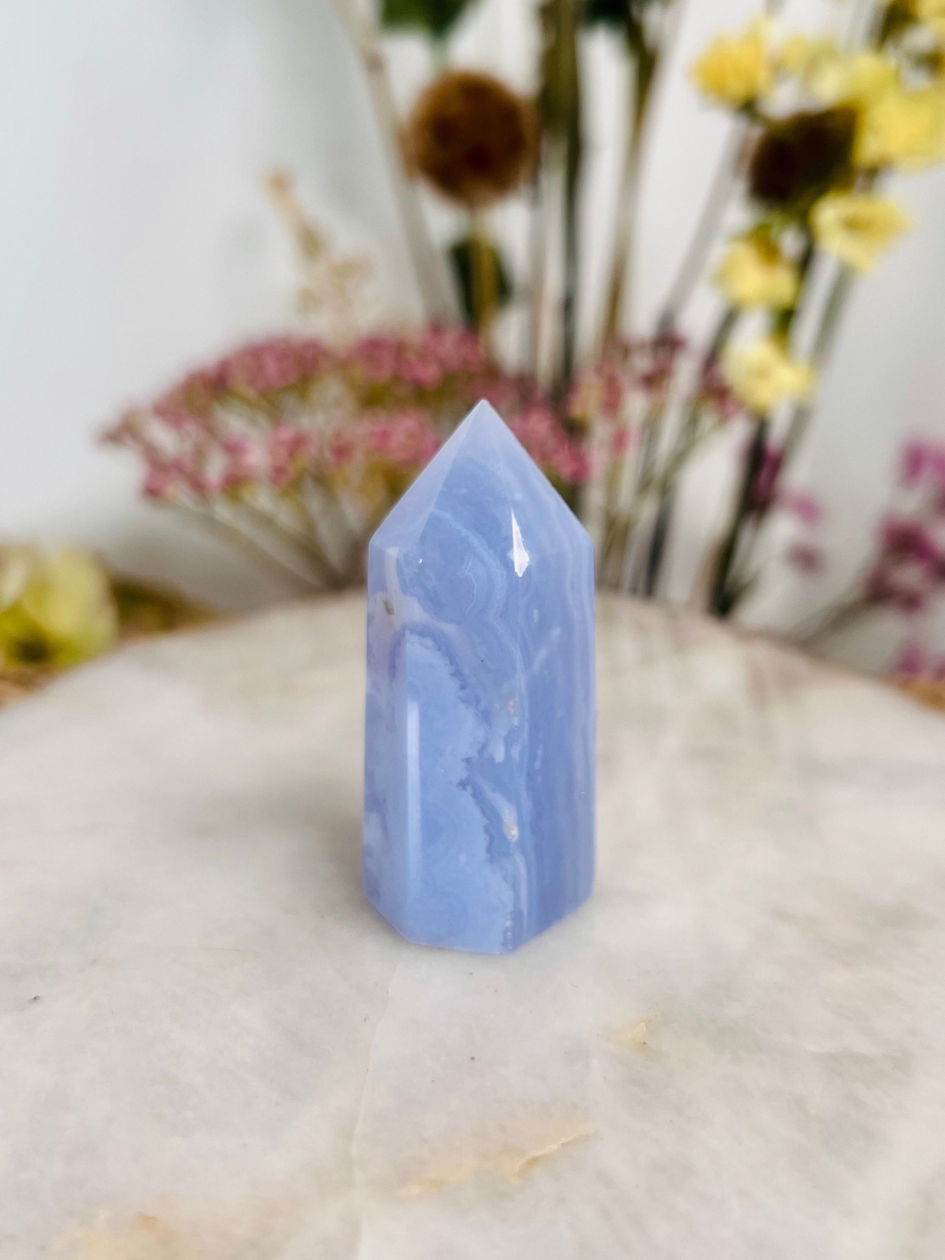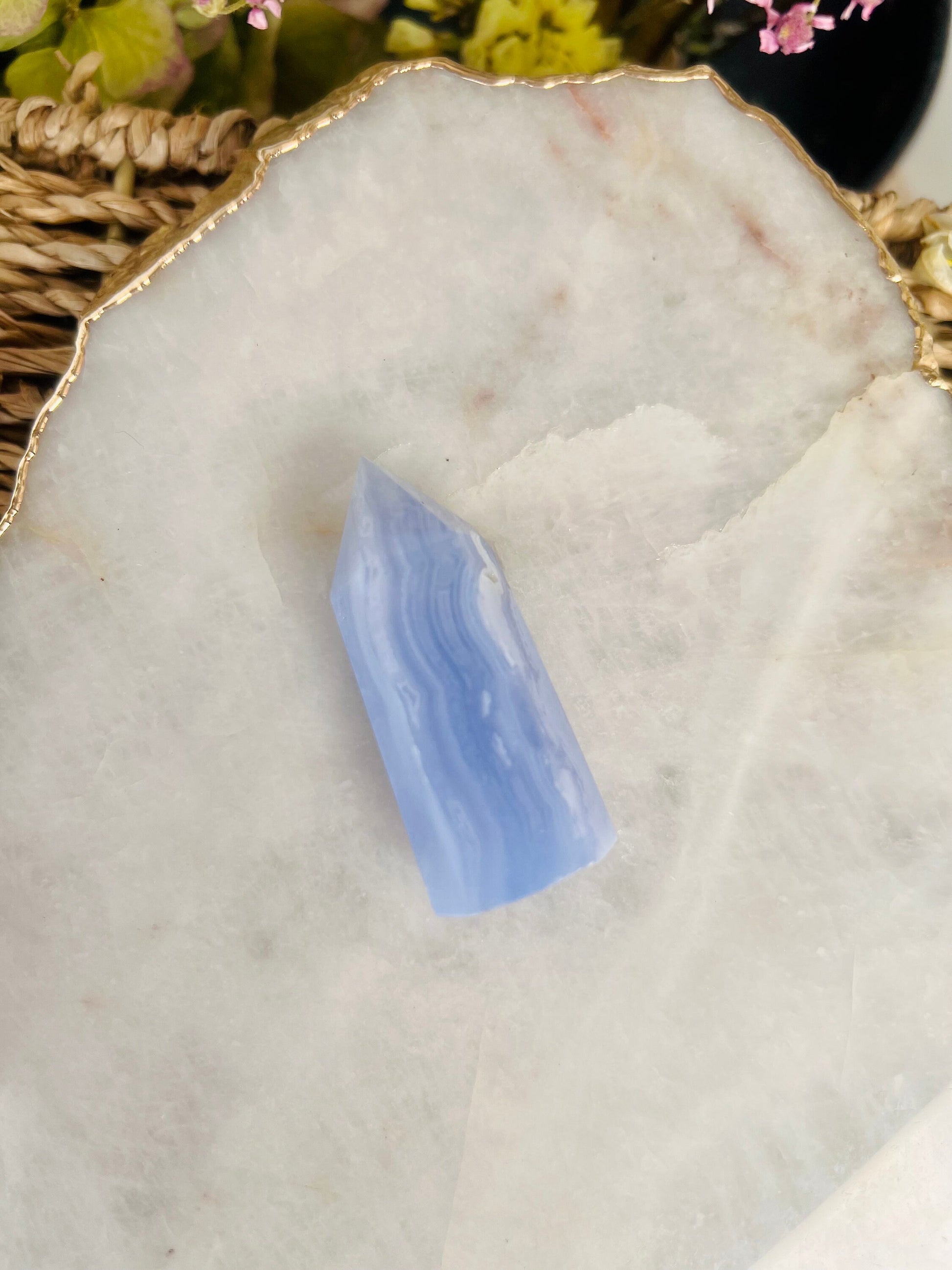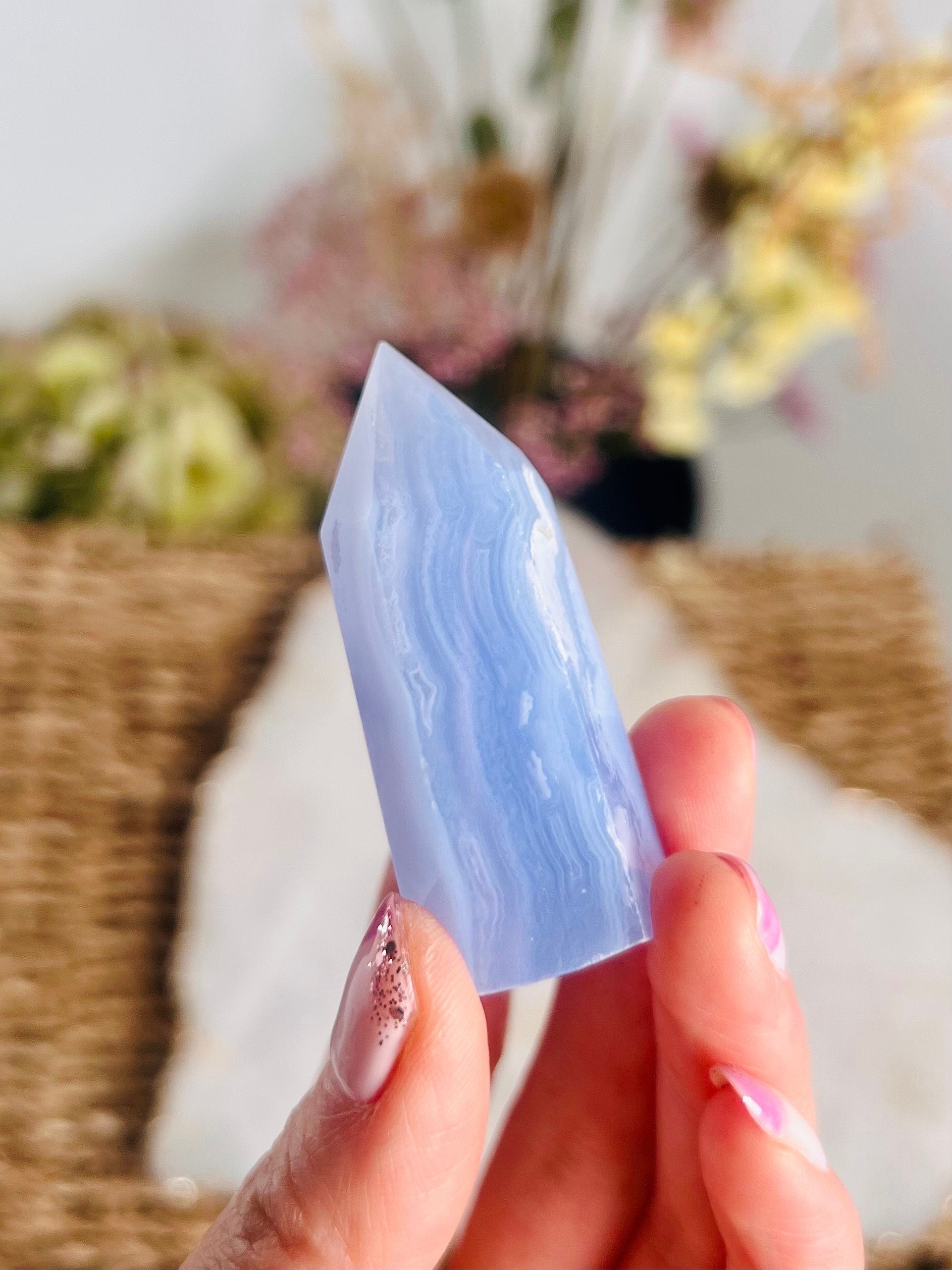Grade AAA Natural Blue Lace Agate Tower from Namibia, Healing Crystal Home Decor 37g, Banded Chalcedony, Heart & Throat Chakra BLA17