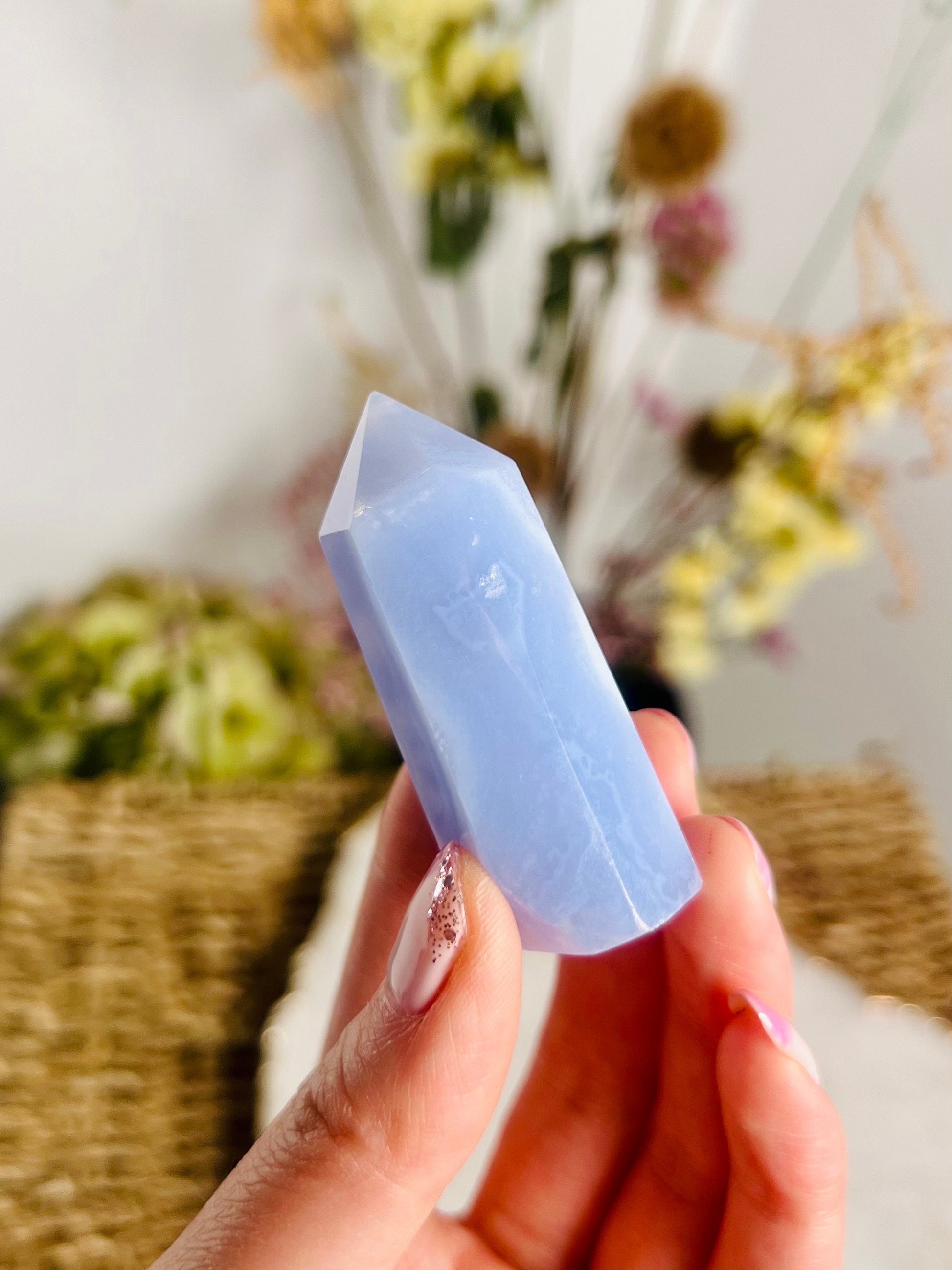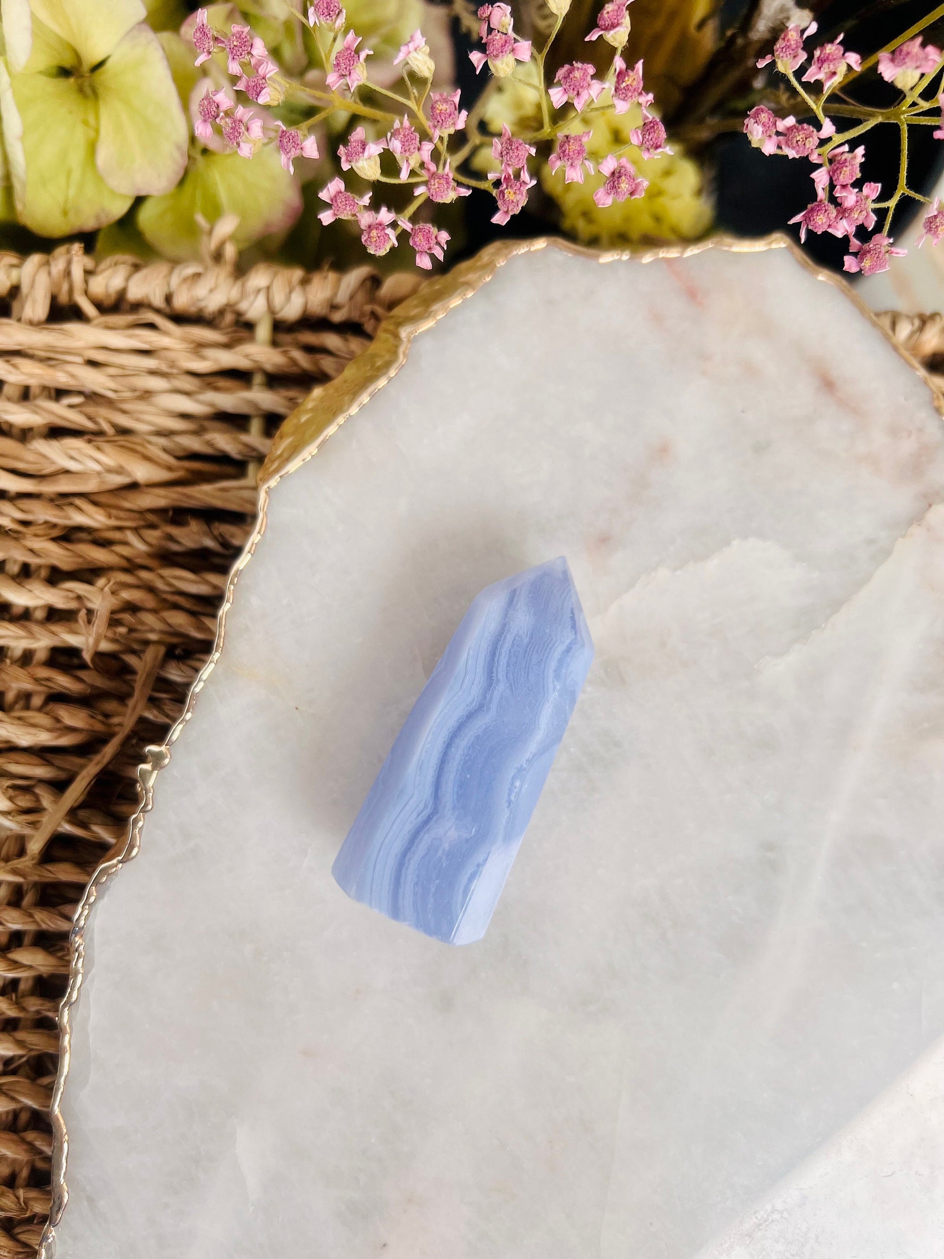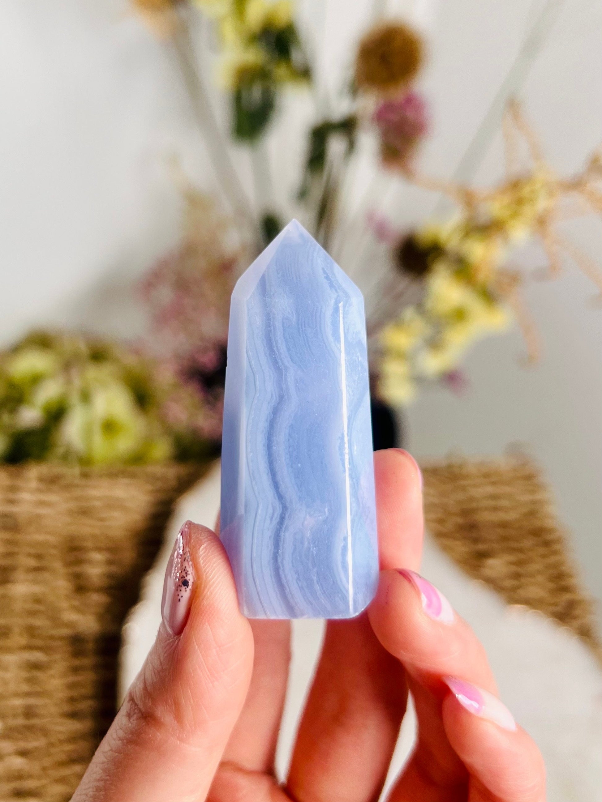 Grade AAA Natural Blue Lace Agate Tower from Namibia, Healing Crystal Home Decor 39g, Banded Chalcedony, Heart & Throat Chakra BLA18