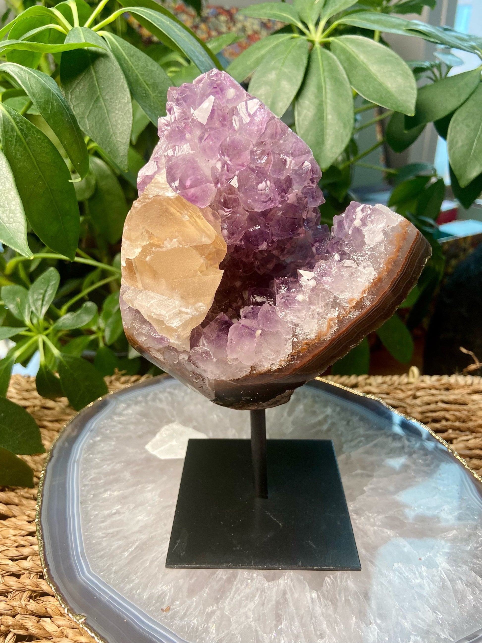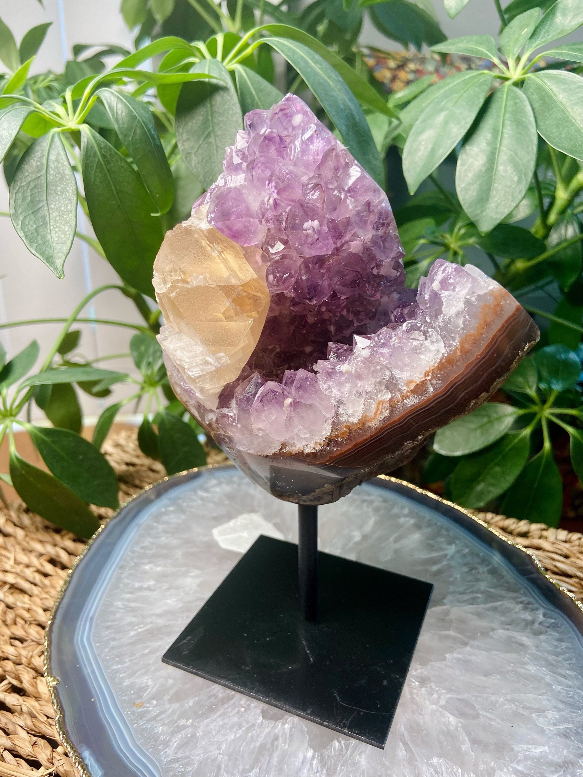 Grade AAA Natural Brazil Amethyst Geode with Calcite and Agate, Crystal Healing Home Decor 835g
