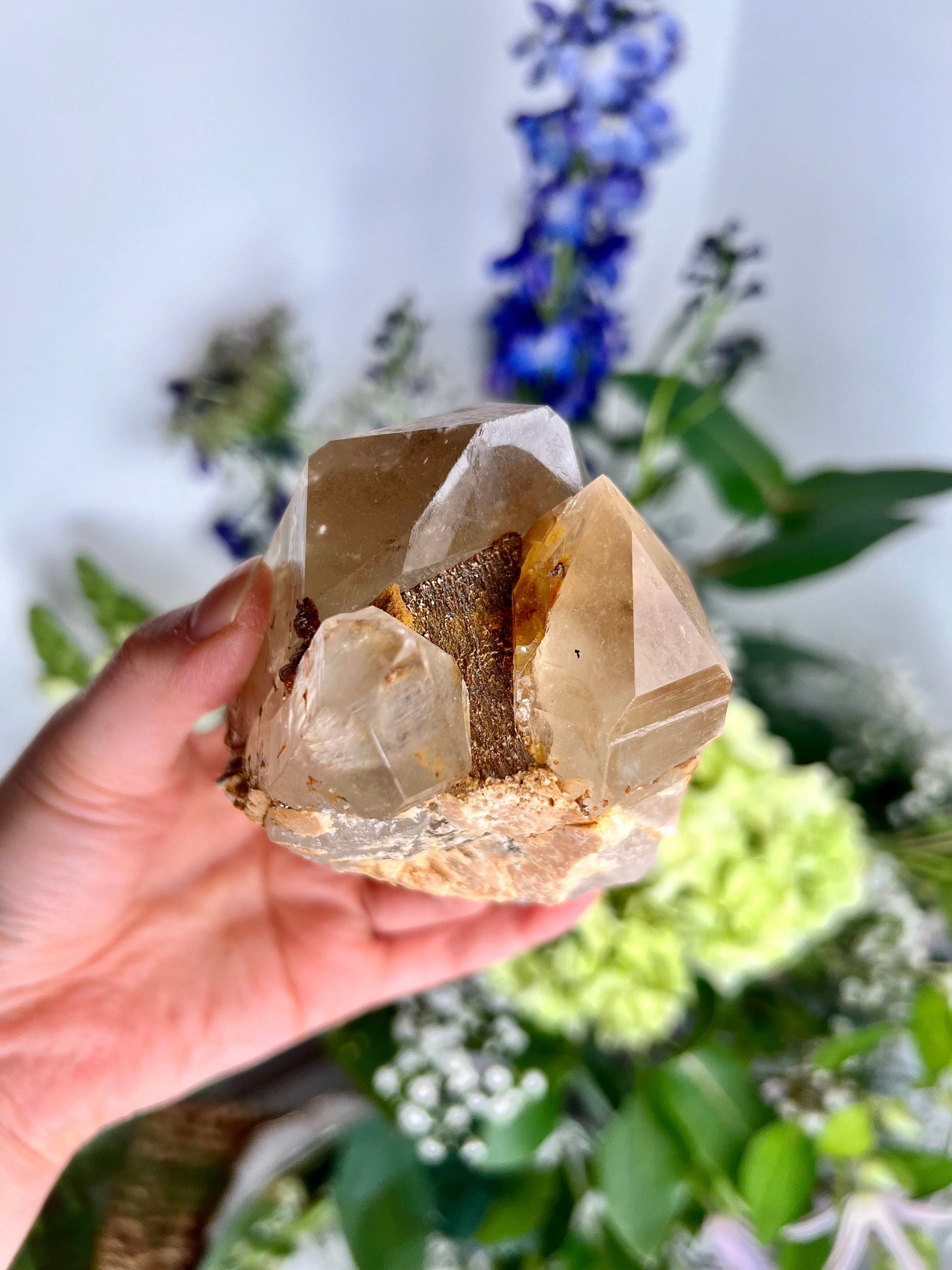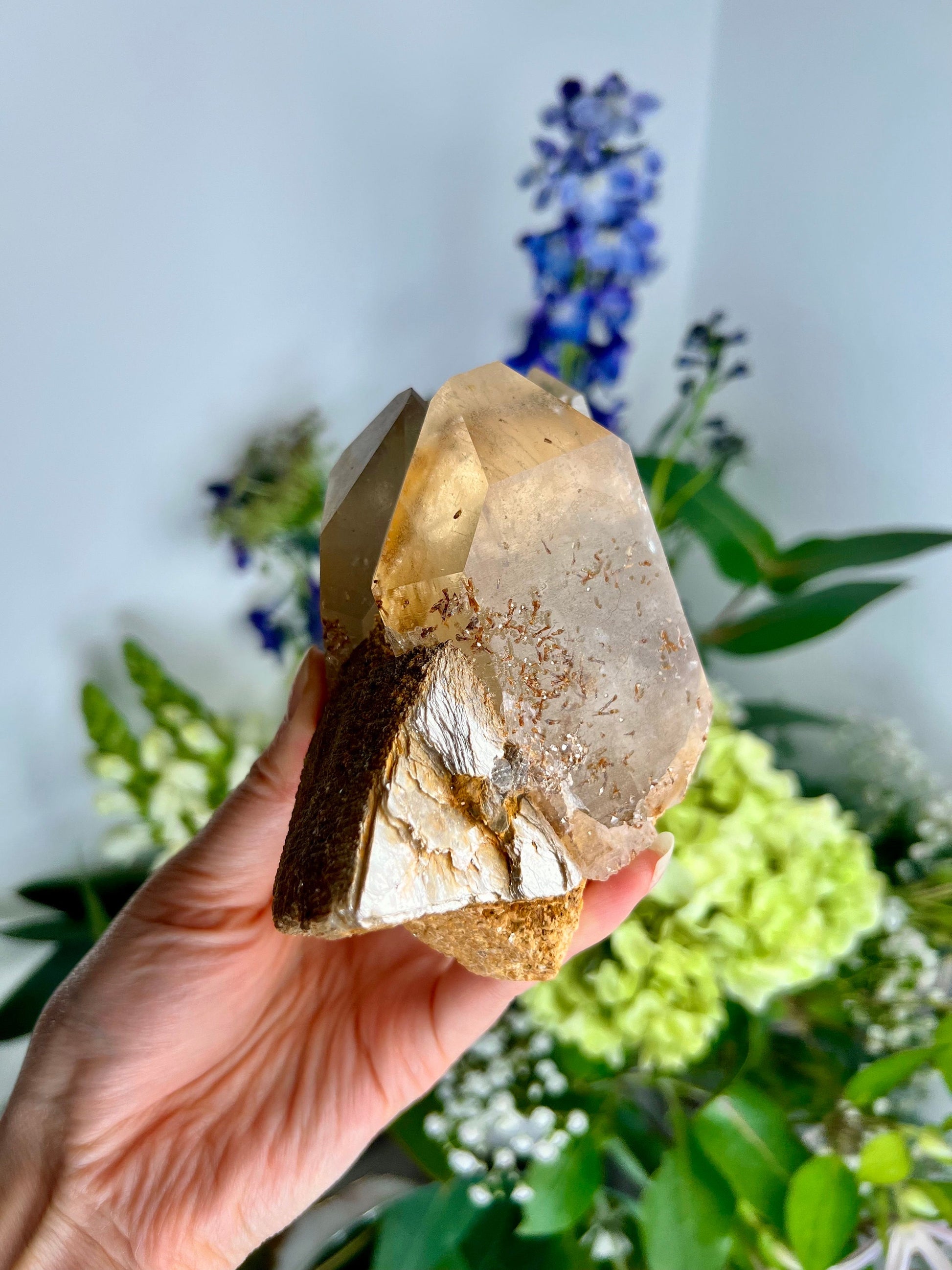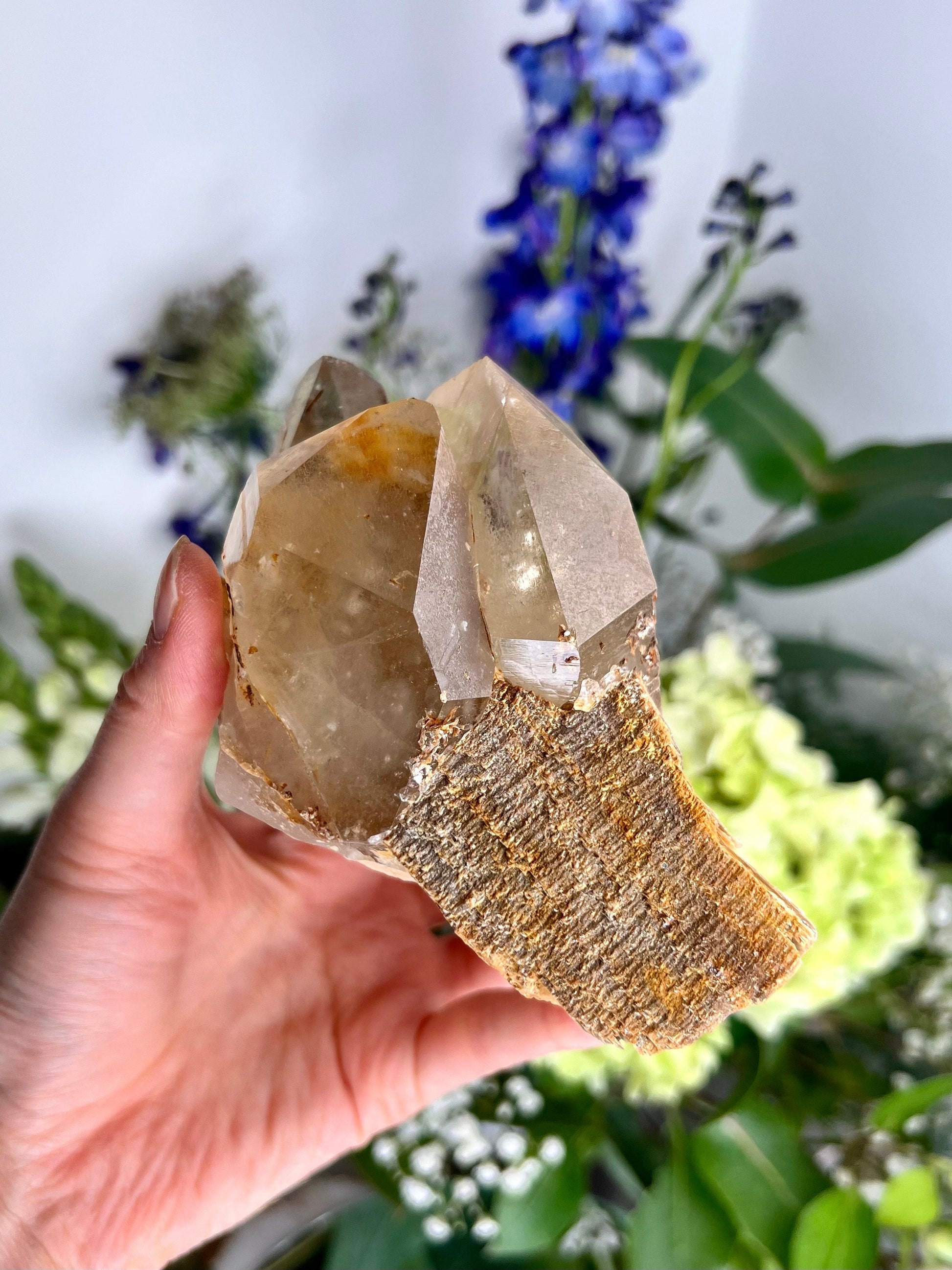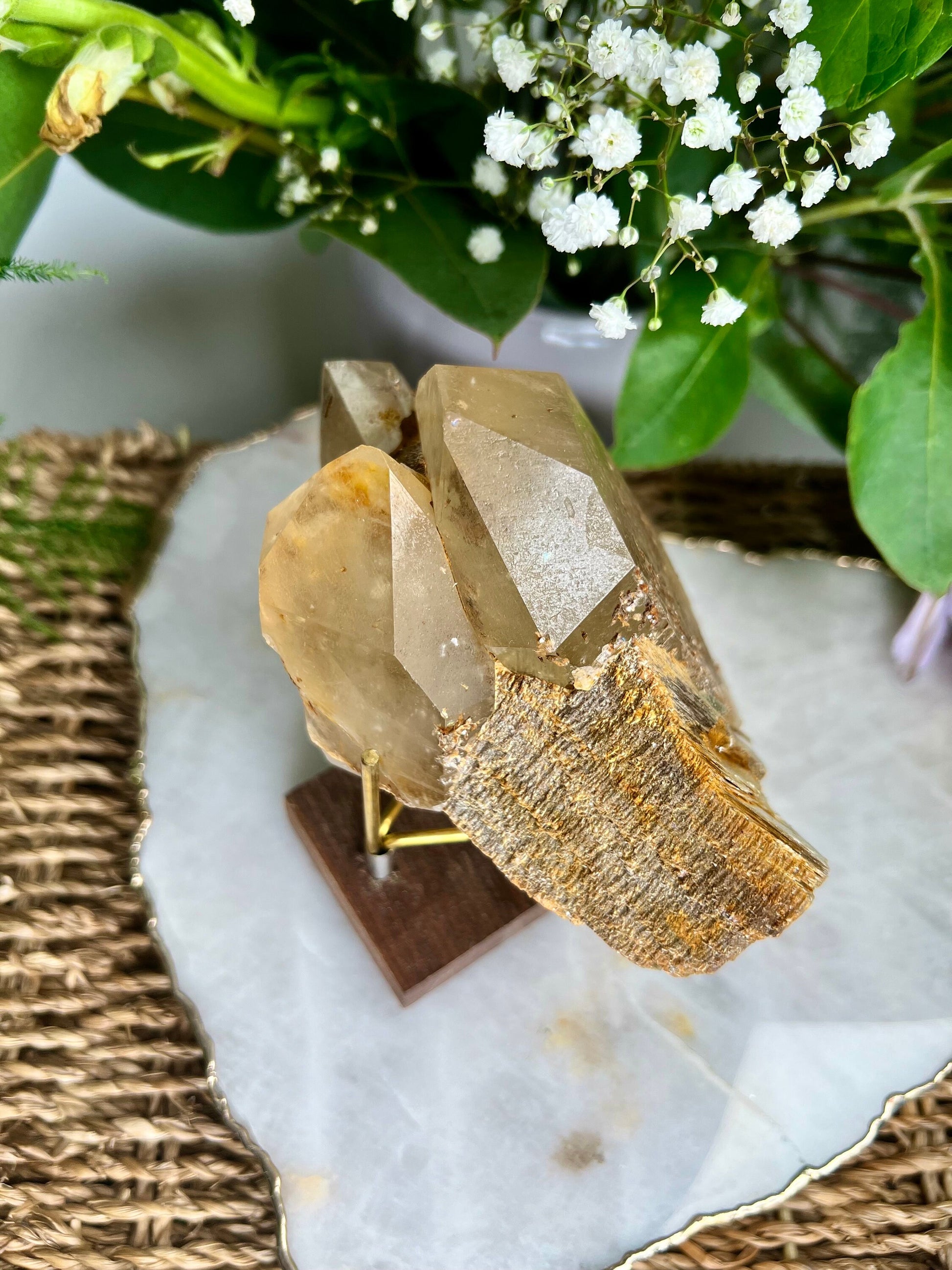 🏔 Feldspar's Earthly Foundation - Feldspar, the most abundant mineral group on Earth, contributes to the Citrine Cathedrals' grounding energy. It forms in a variety of environments, including igneous, metamorphic, and sedimentary rocks, and provides a stabilizing base for the Citrine's growth. Its presence symbolizes endurance, stability, and the Earth's solid foundation.