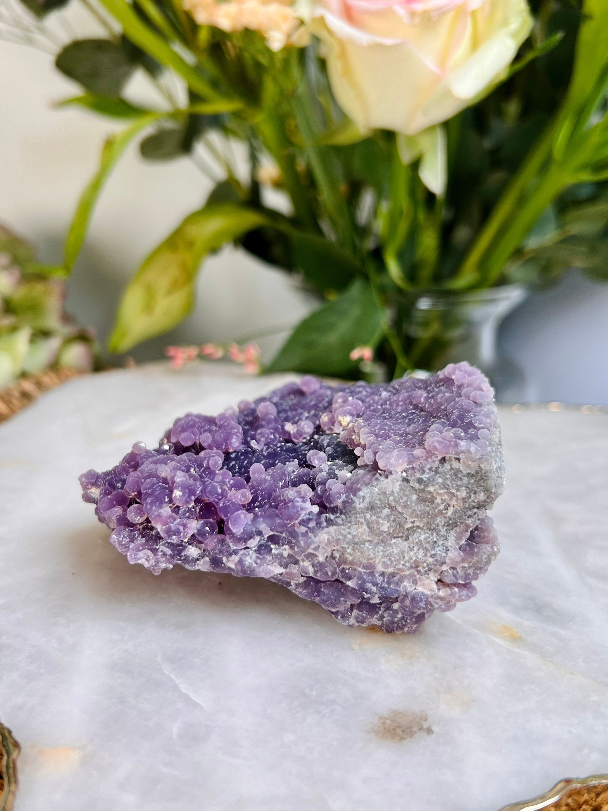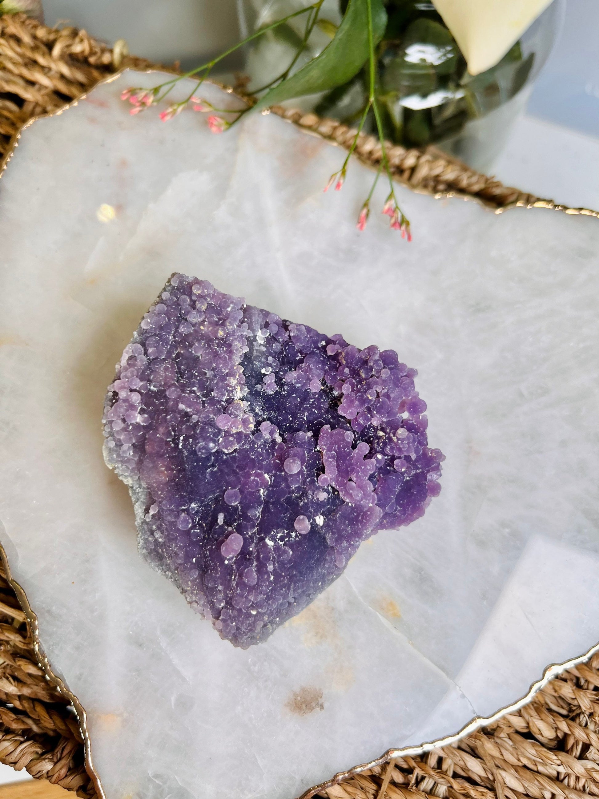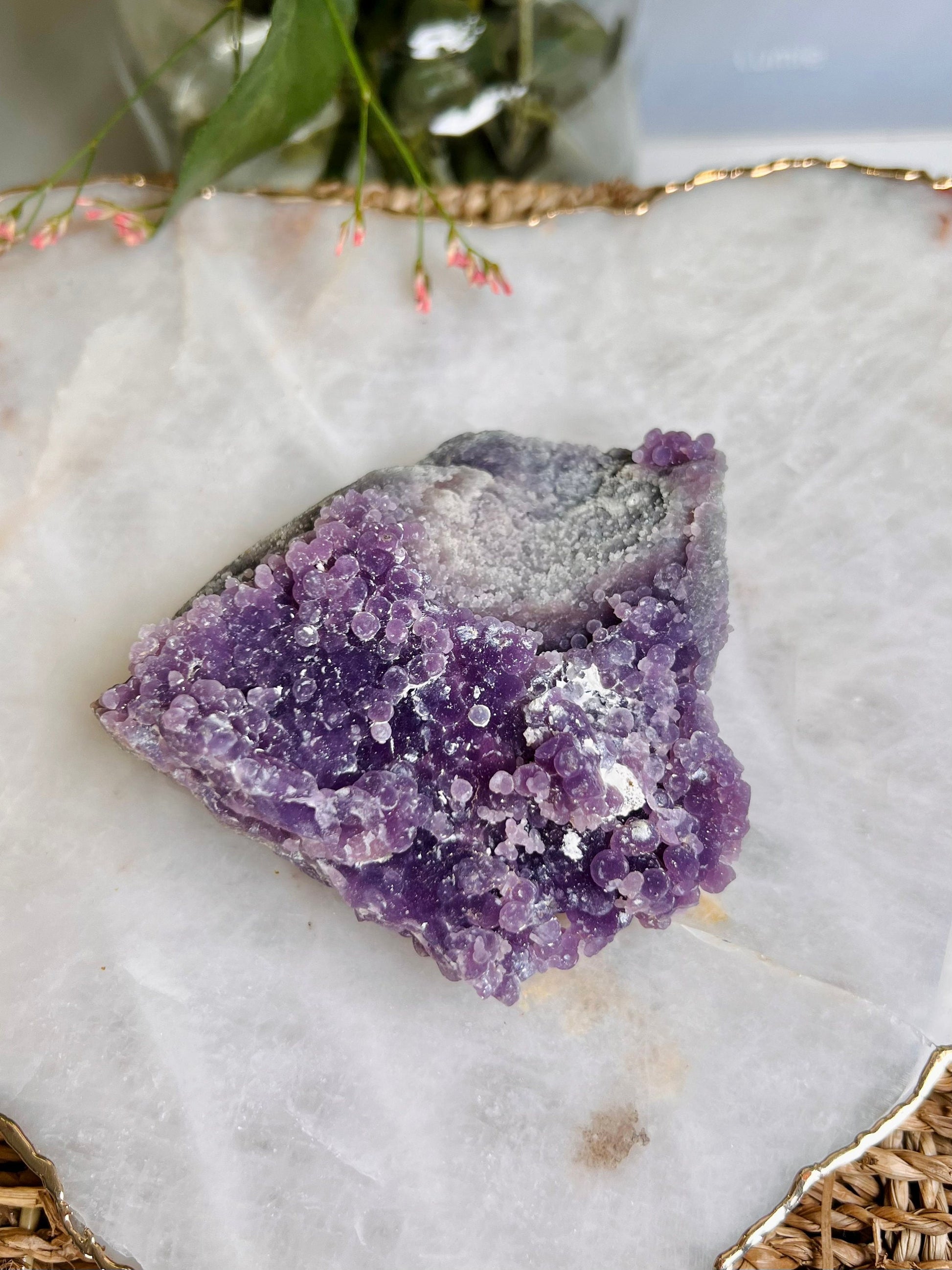 Grape Agate is a powerful intuitive stone that activates and links the crown and third eye chakras together.