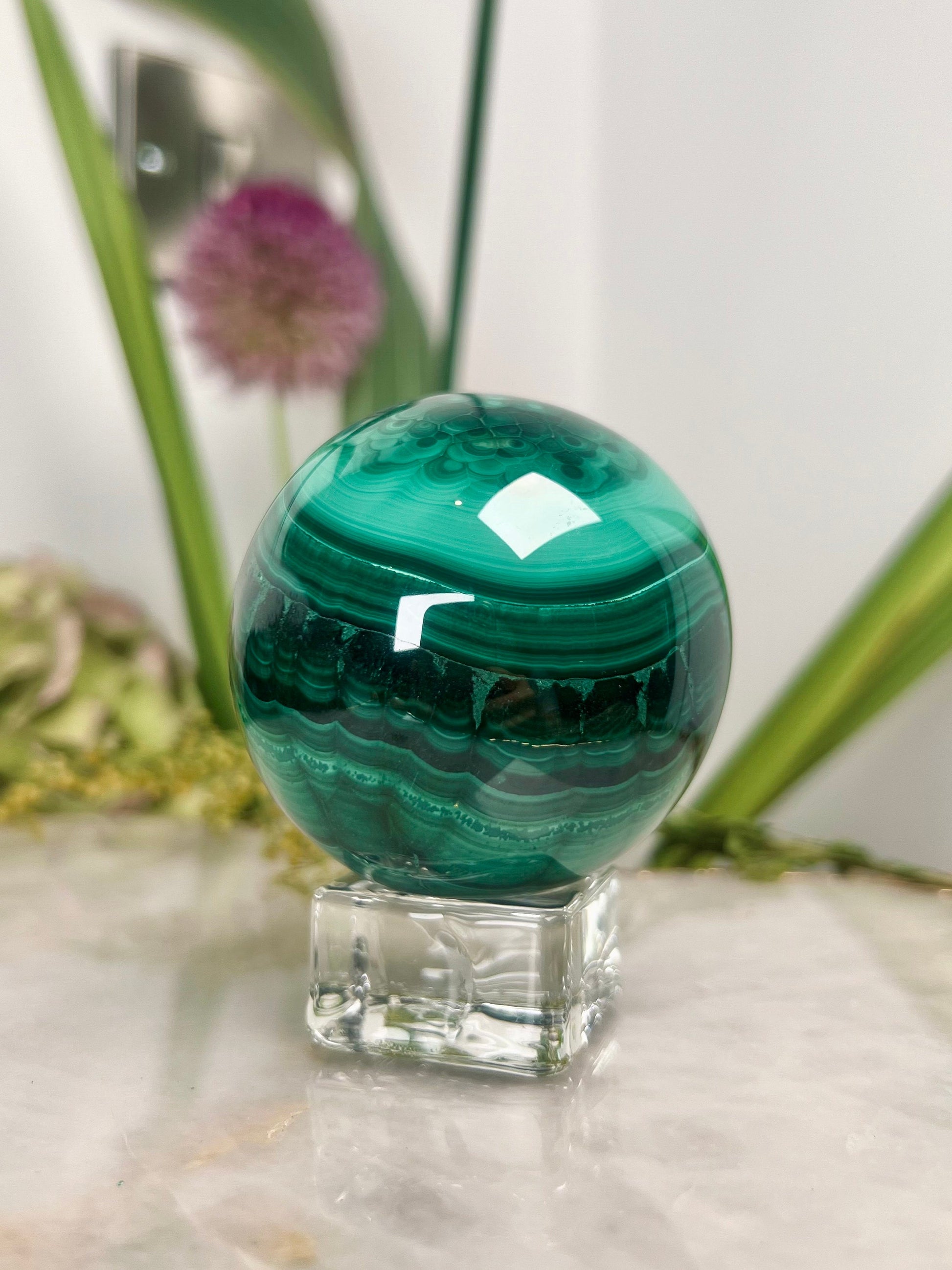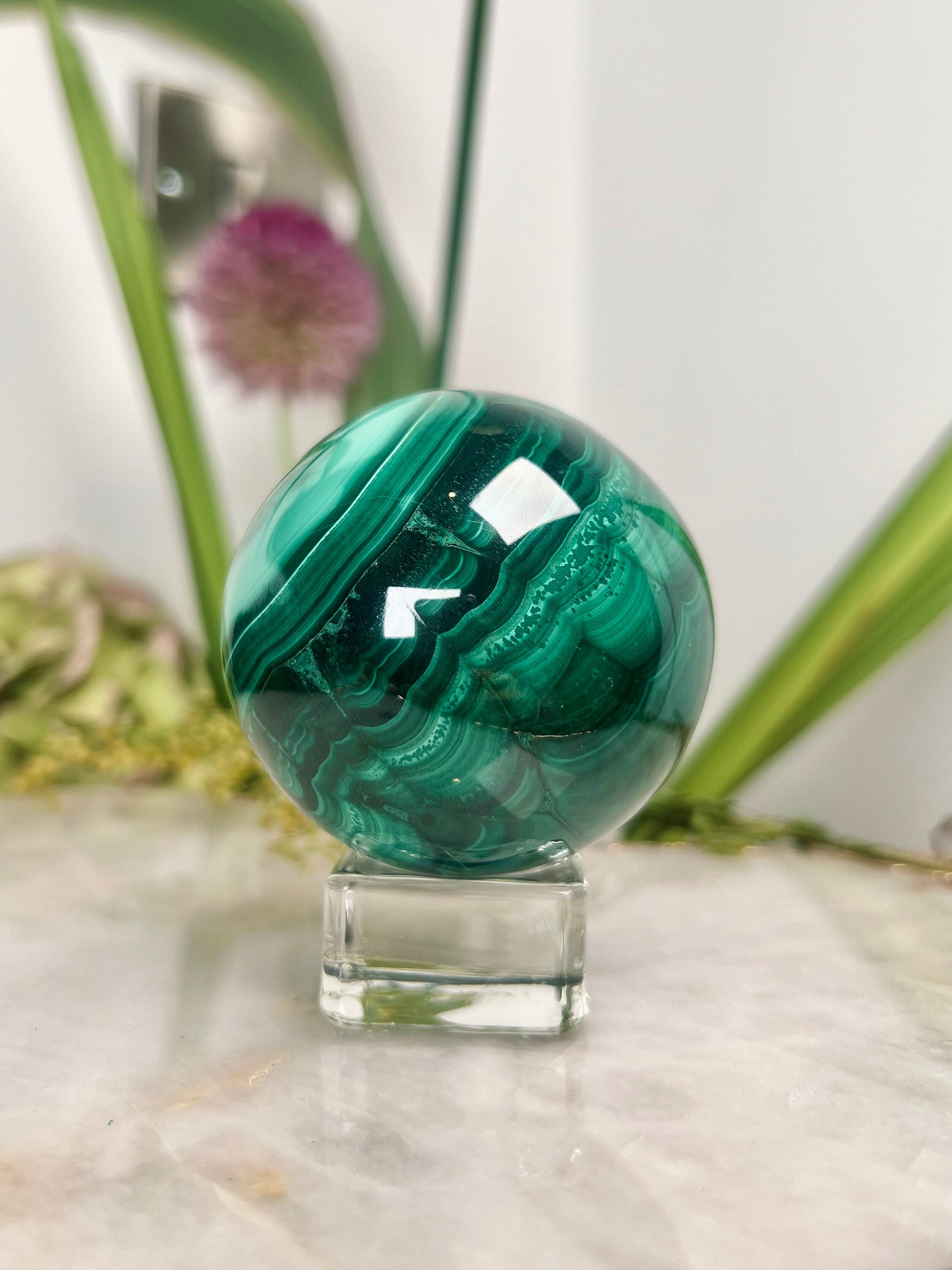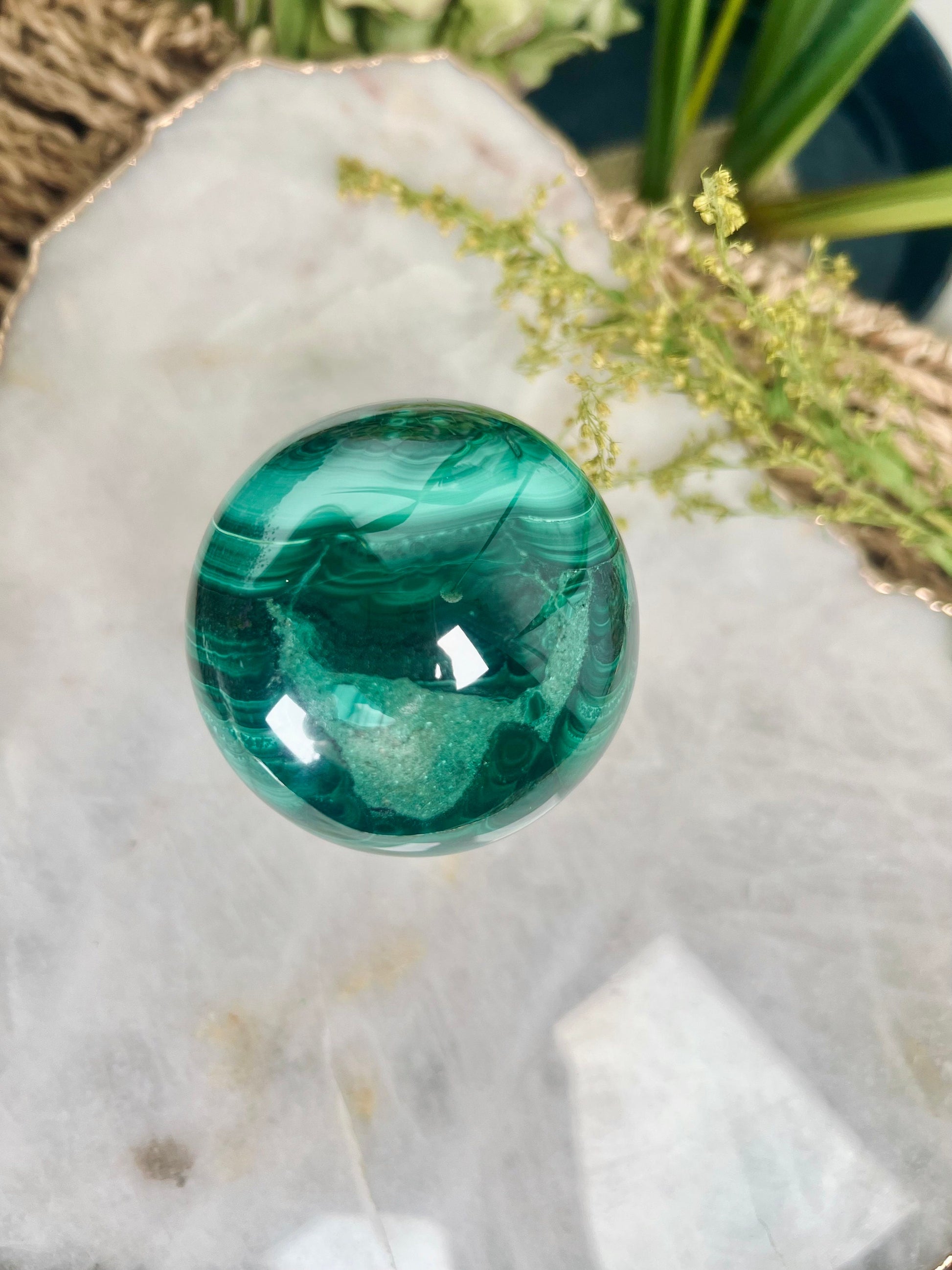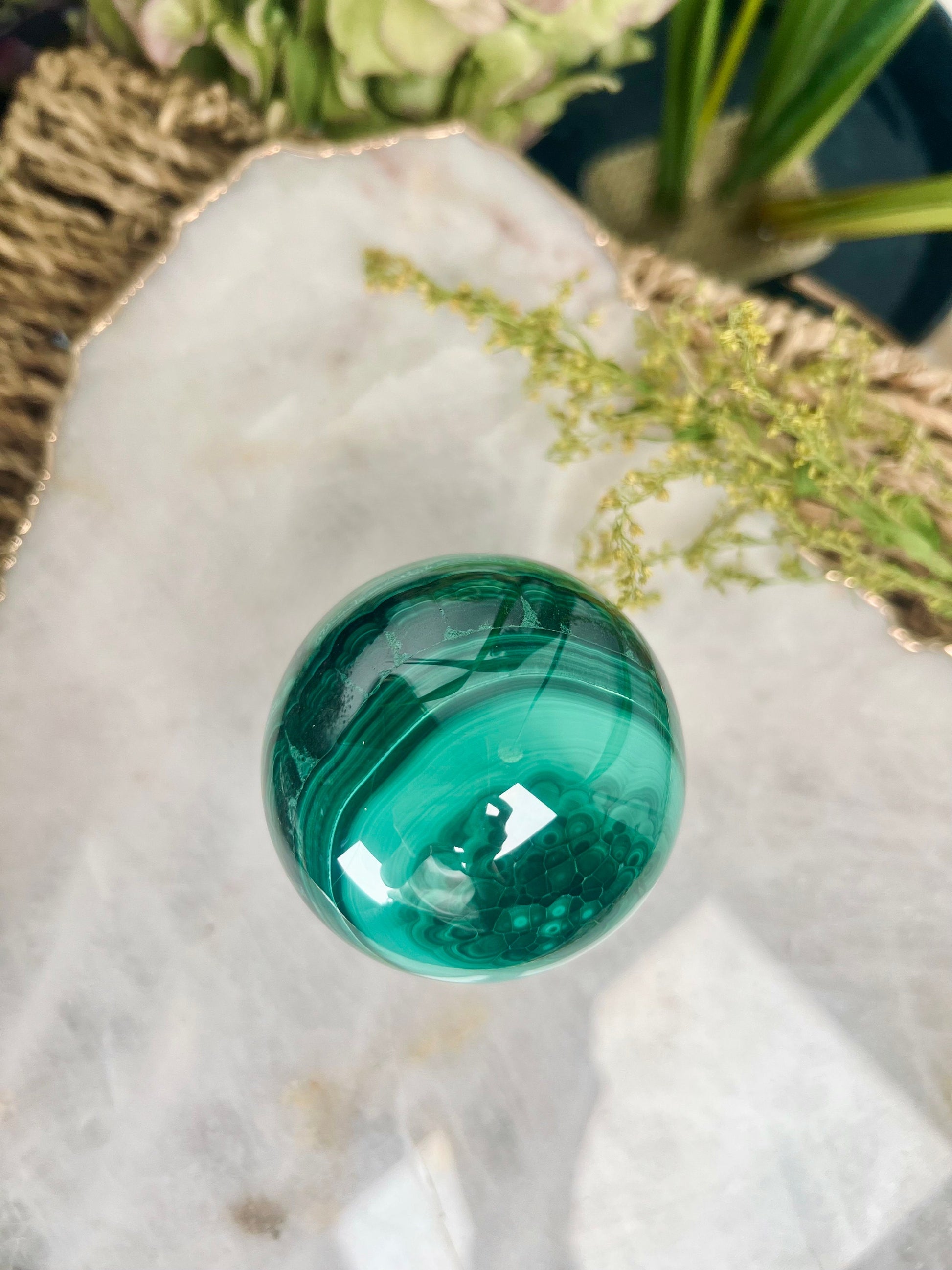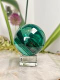 Grade AAA Natural Malachite Sphere on Stand, Manifestation Crystal,Energy Clearing, Good Fortune, Stone for New Beginnings, 426g - MS06