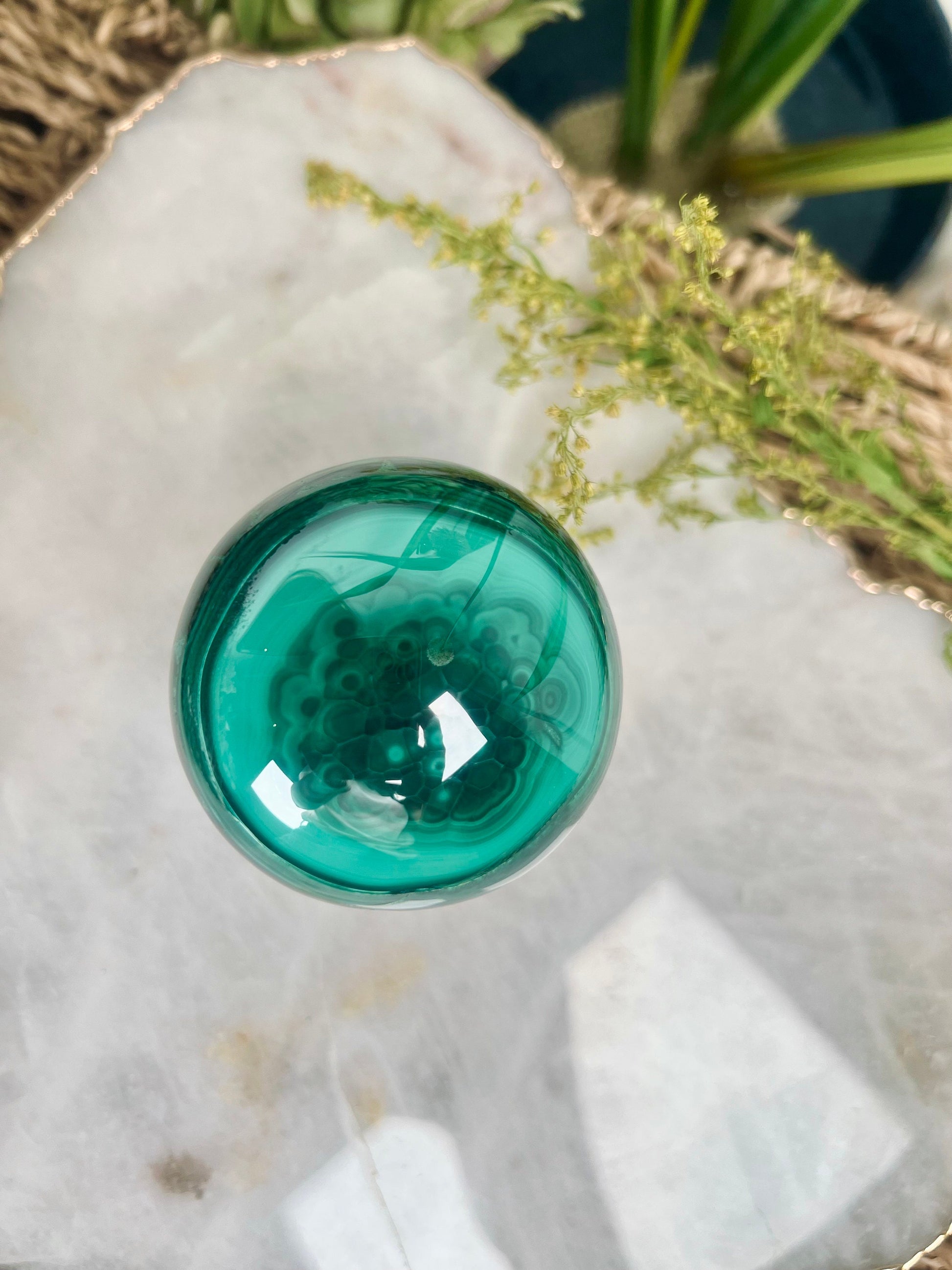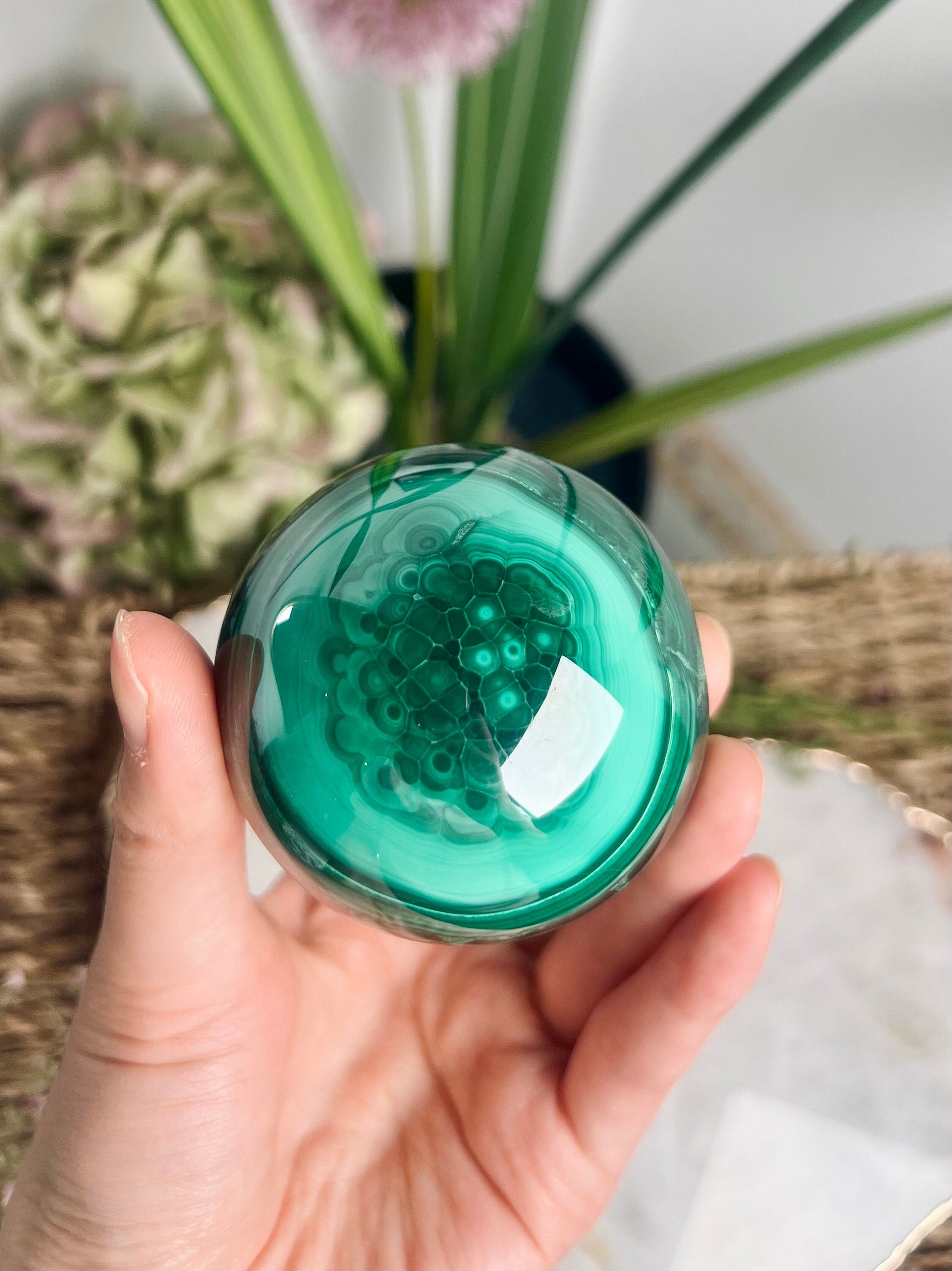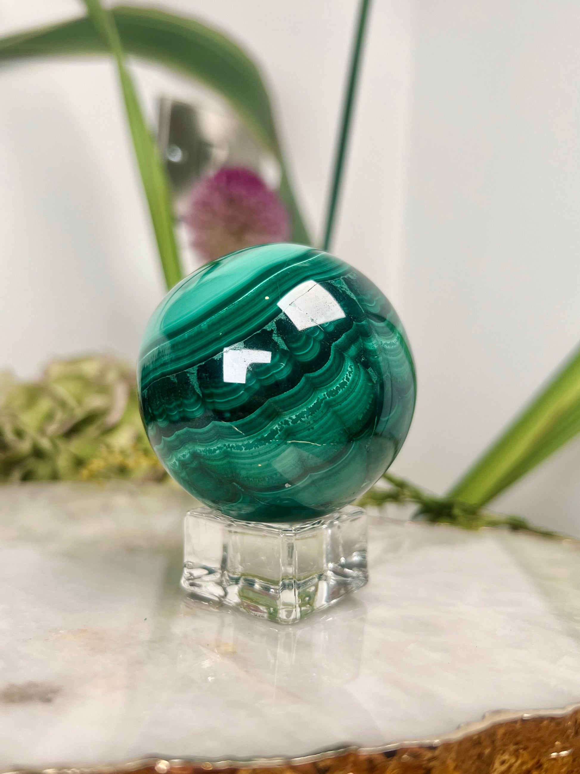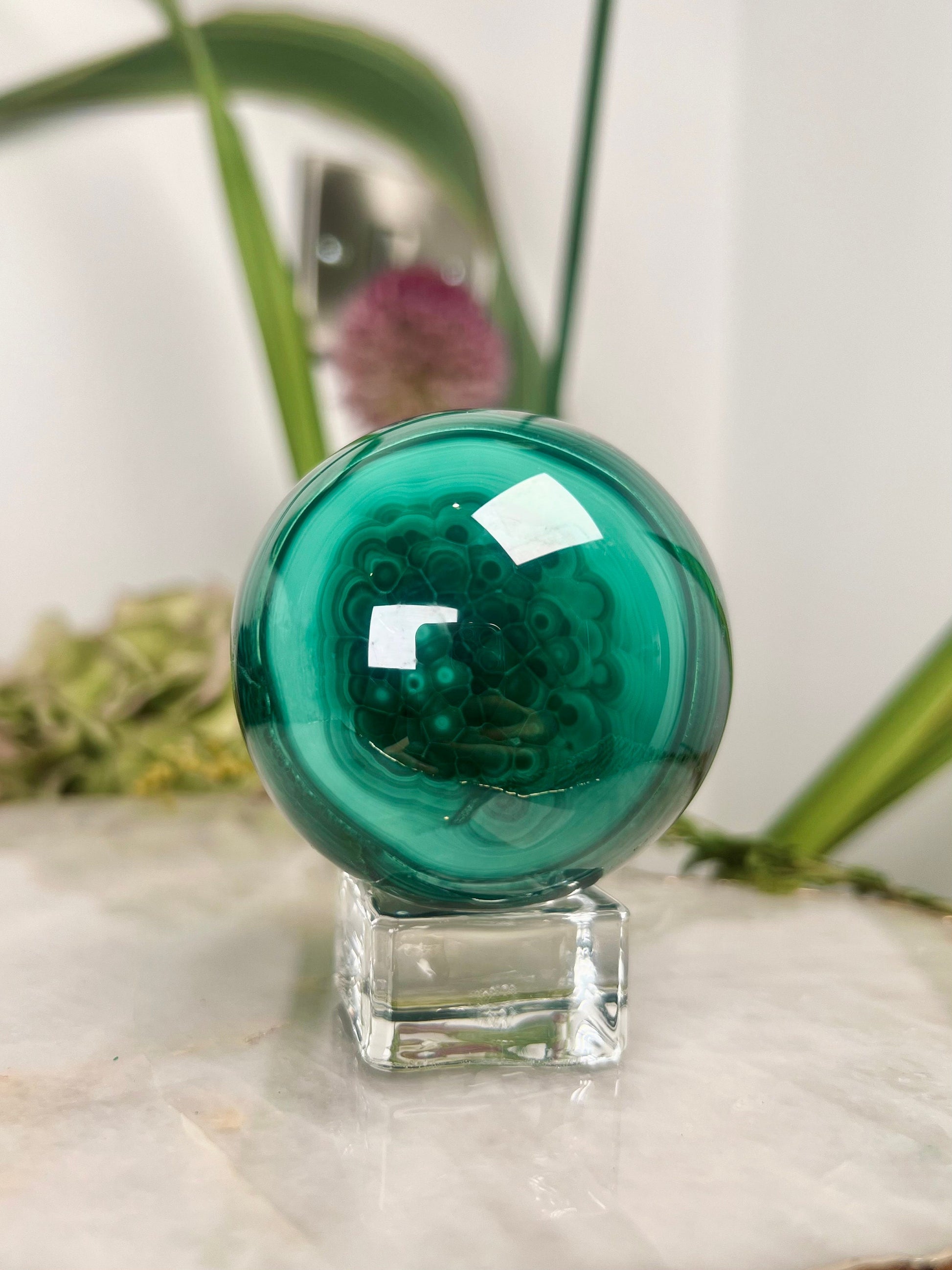 Grade AAA Natural Malachite Sphere on Stand, Manifestation Crystal,Energy Clearing, Good Fortune, Stone for New Beginnings, 426g - MS06