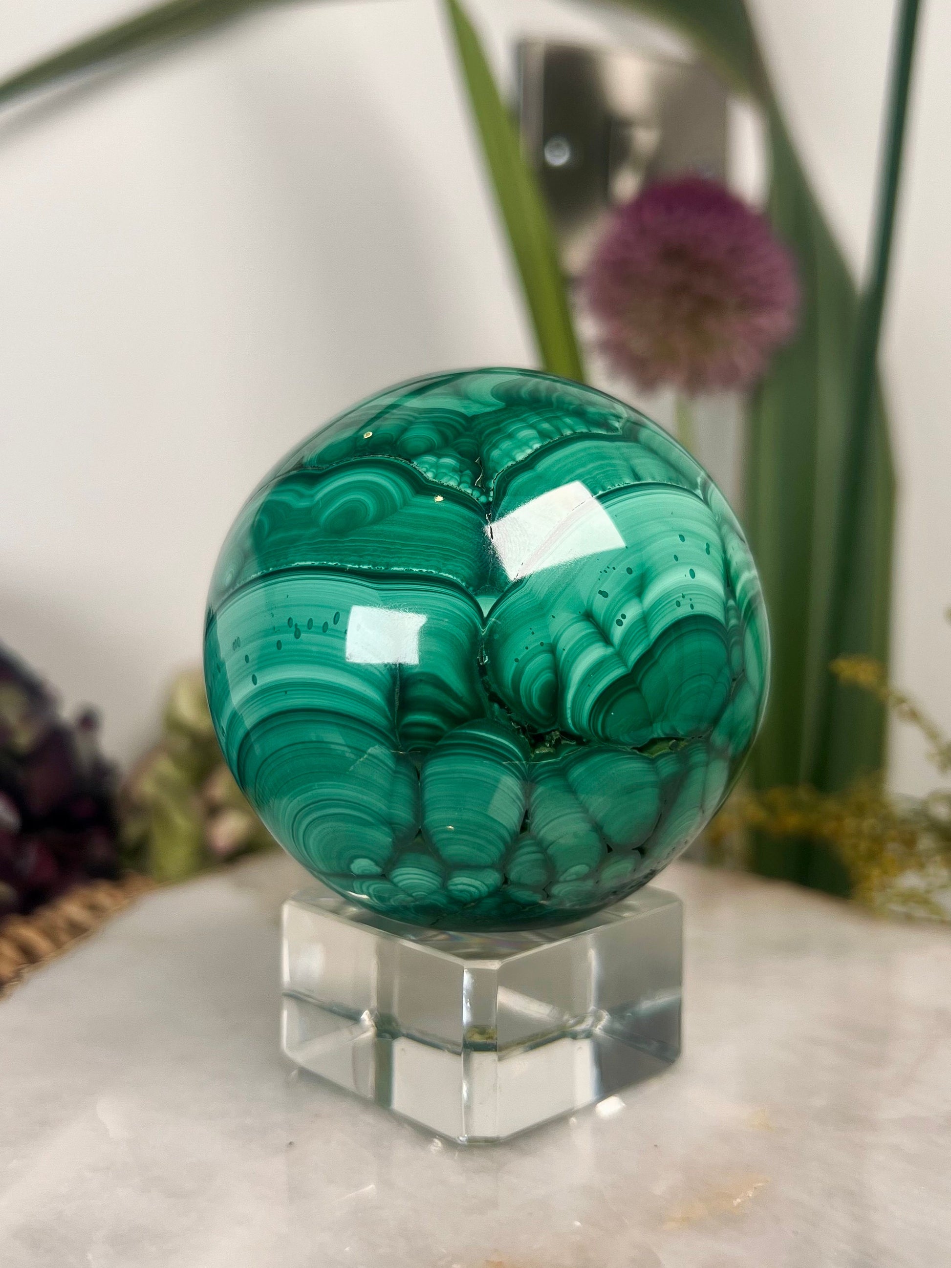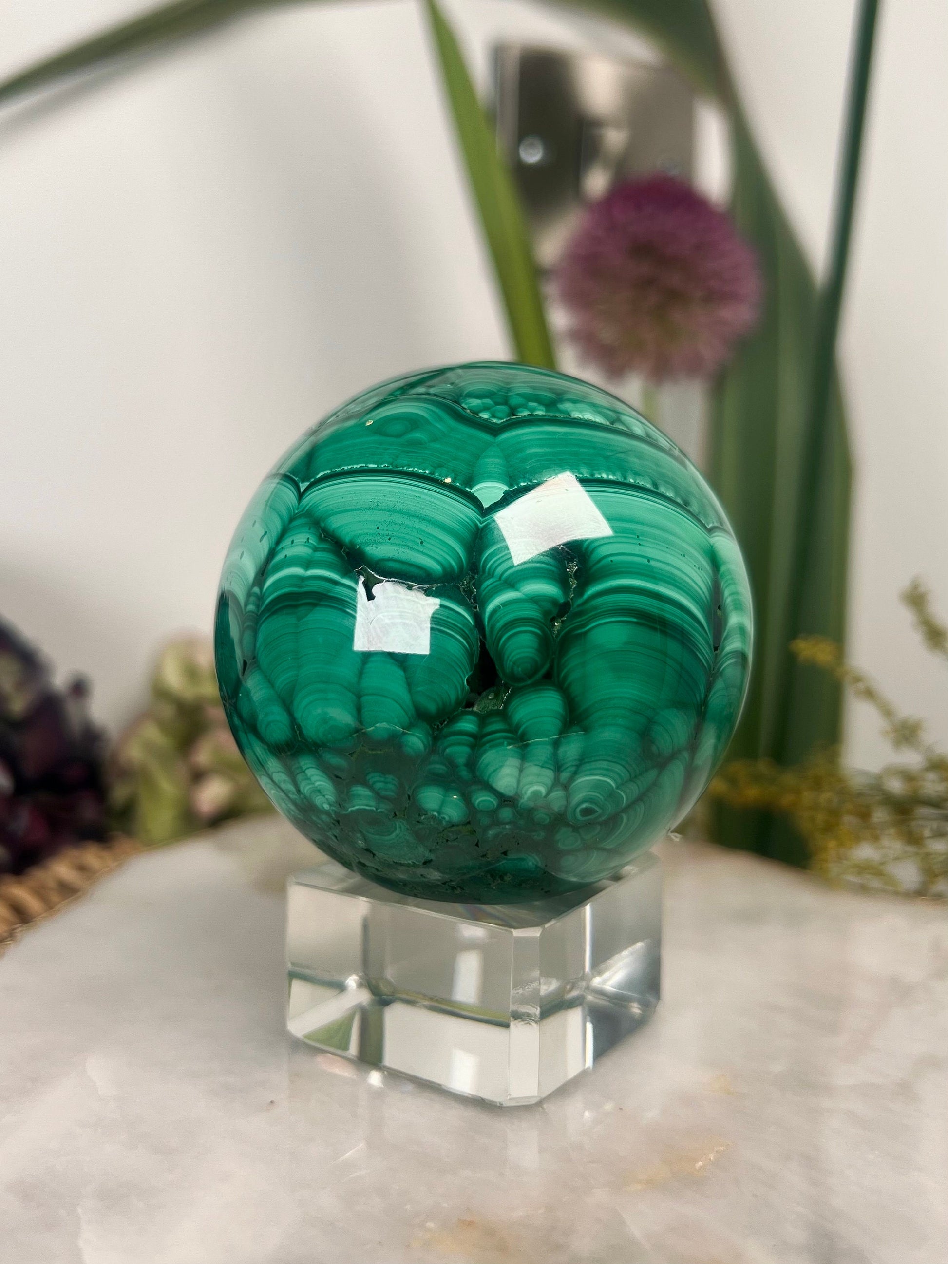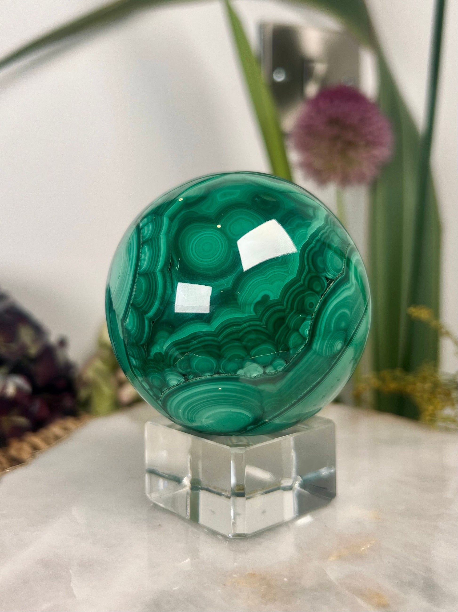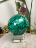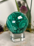 Grade AAA Natural Malachite Sphere on Stand, Manifestation Crystal,Energy Clearing, Good Fortune, Stone for New Beginnings, 718g MS01