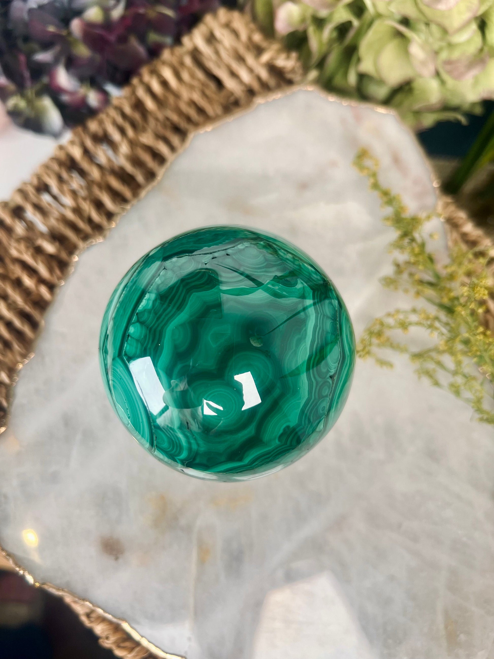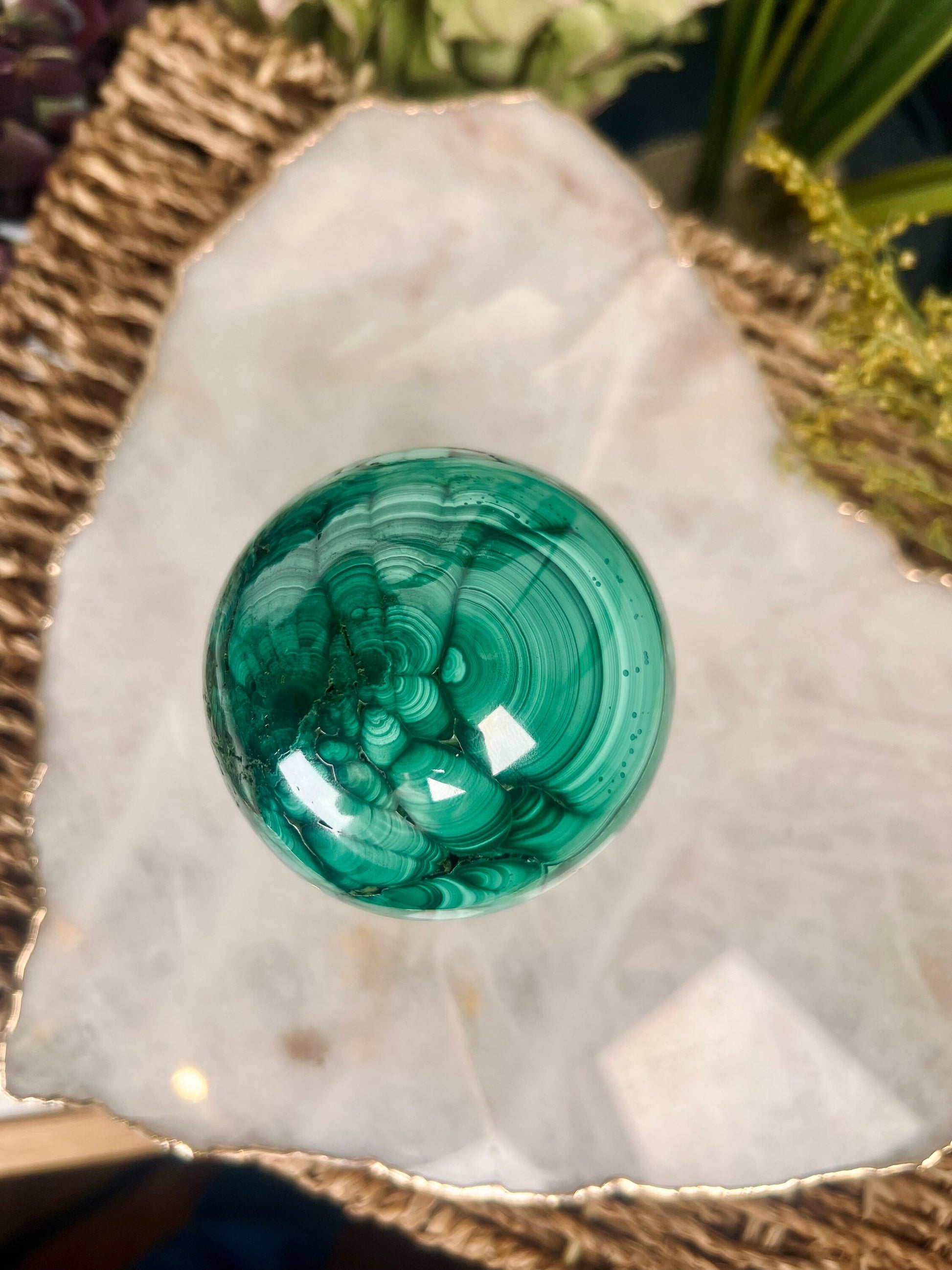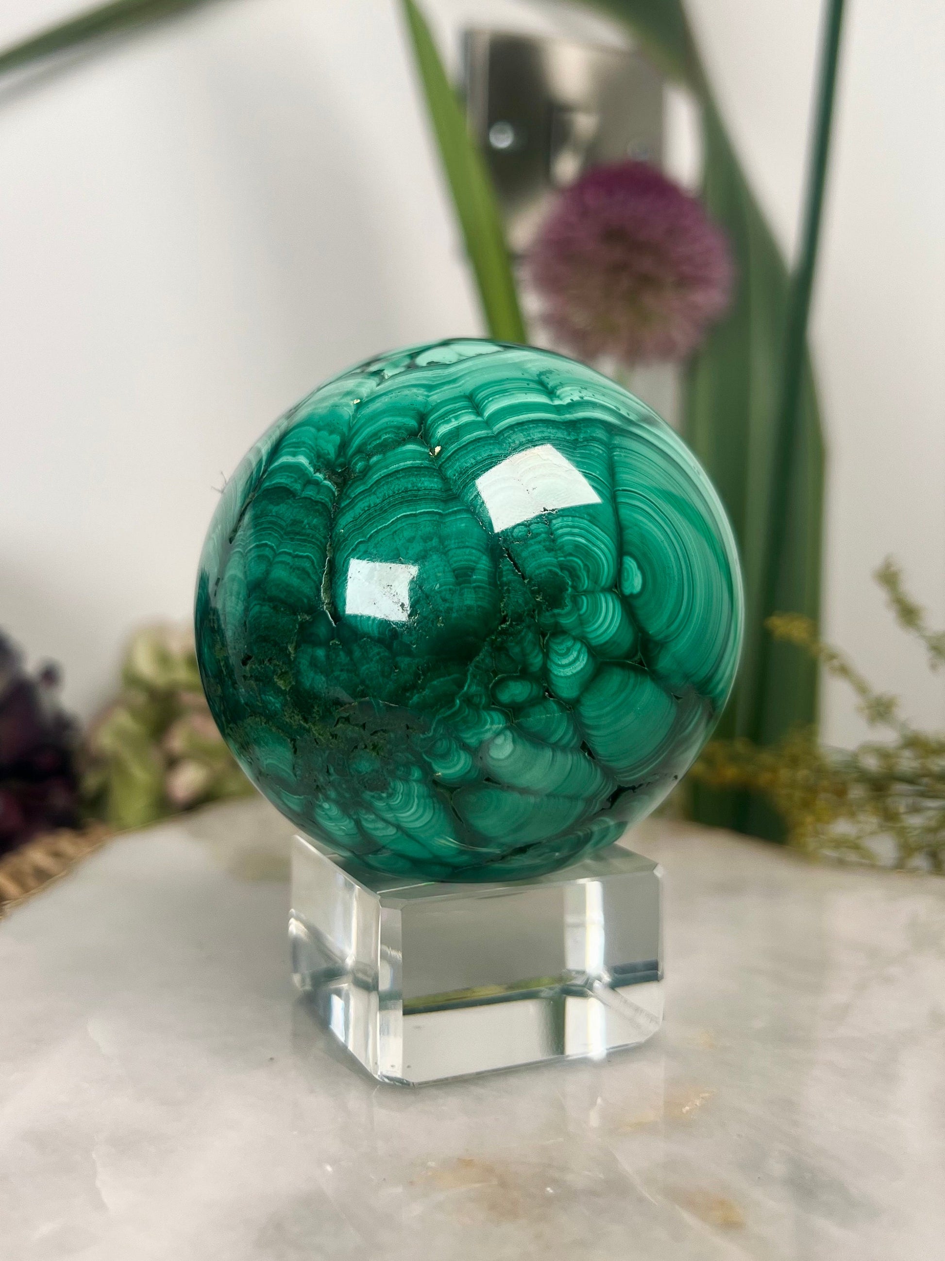 Grade AAA Natural Malachite Sphere on Stand, Manifestation Crystal,Energy Clearing, Good Fortune, Stone for New Beginnings, 718g MS01