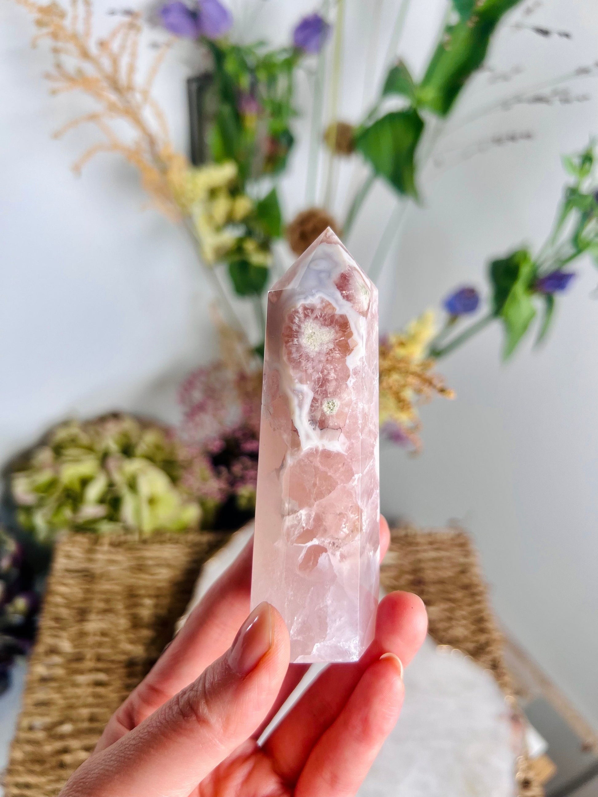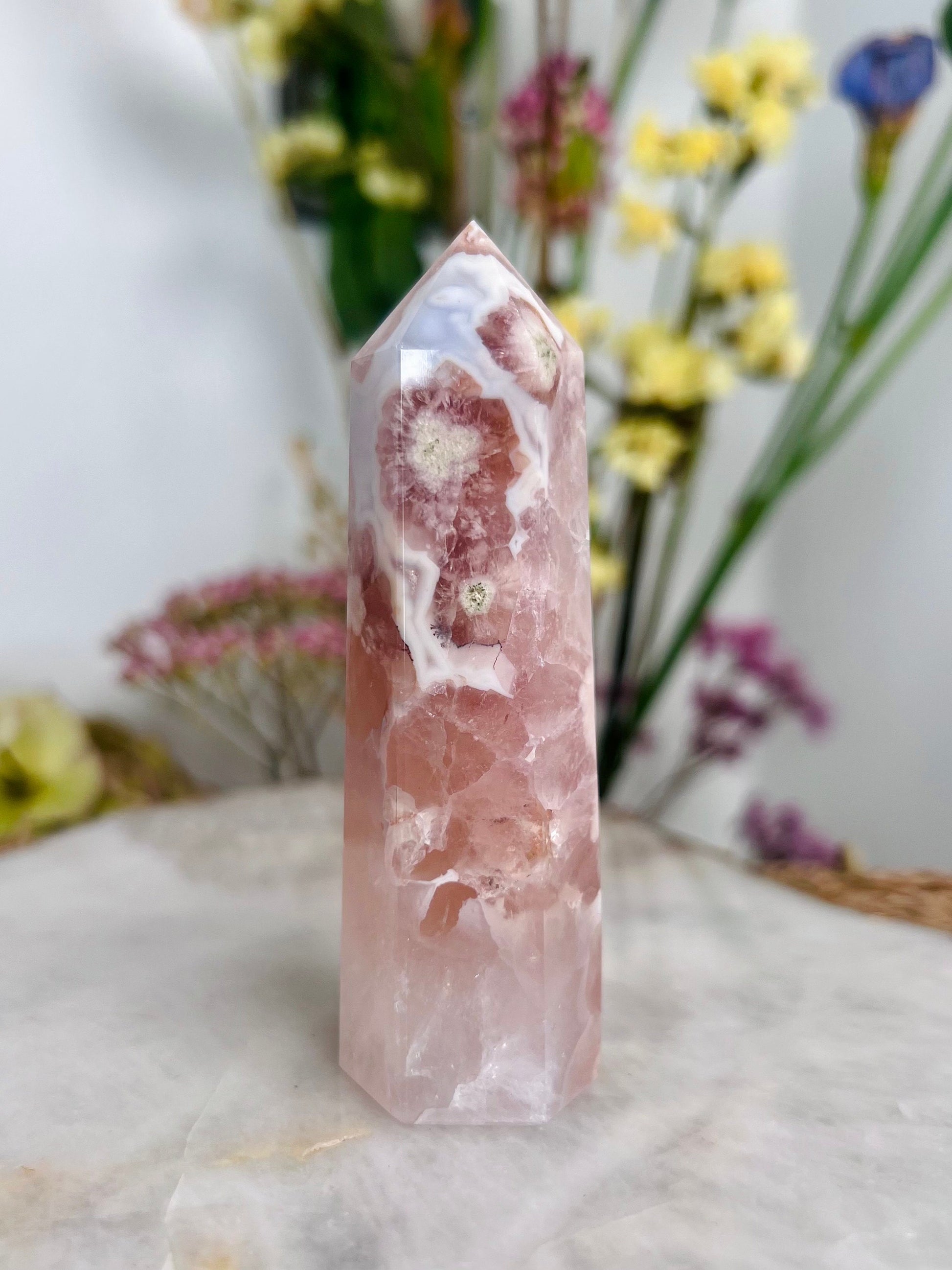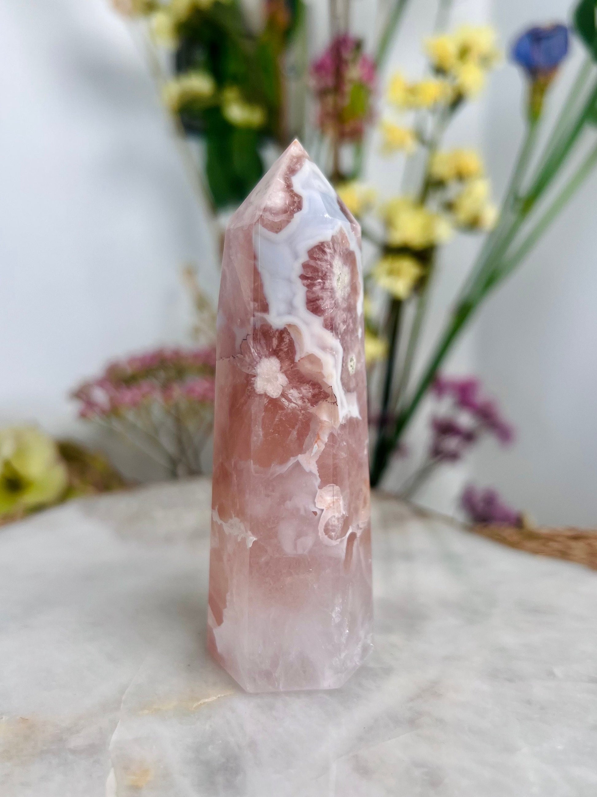 Grade AAA Natural Pink Flower Agate and Quartz Tower from Madagascar, Crystal Healing home decor, Manifestation Crystal 109g FAT01
