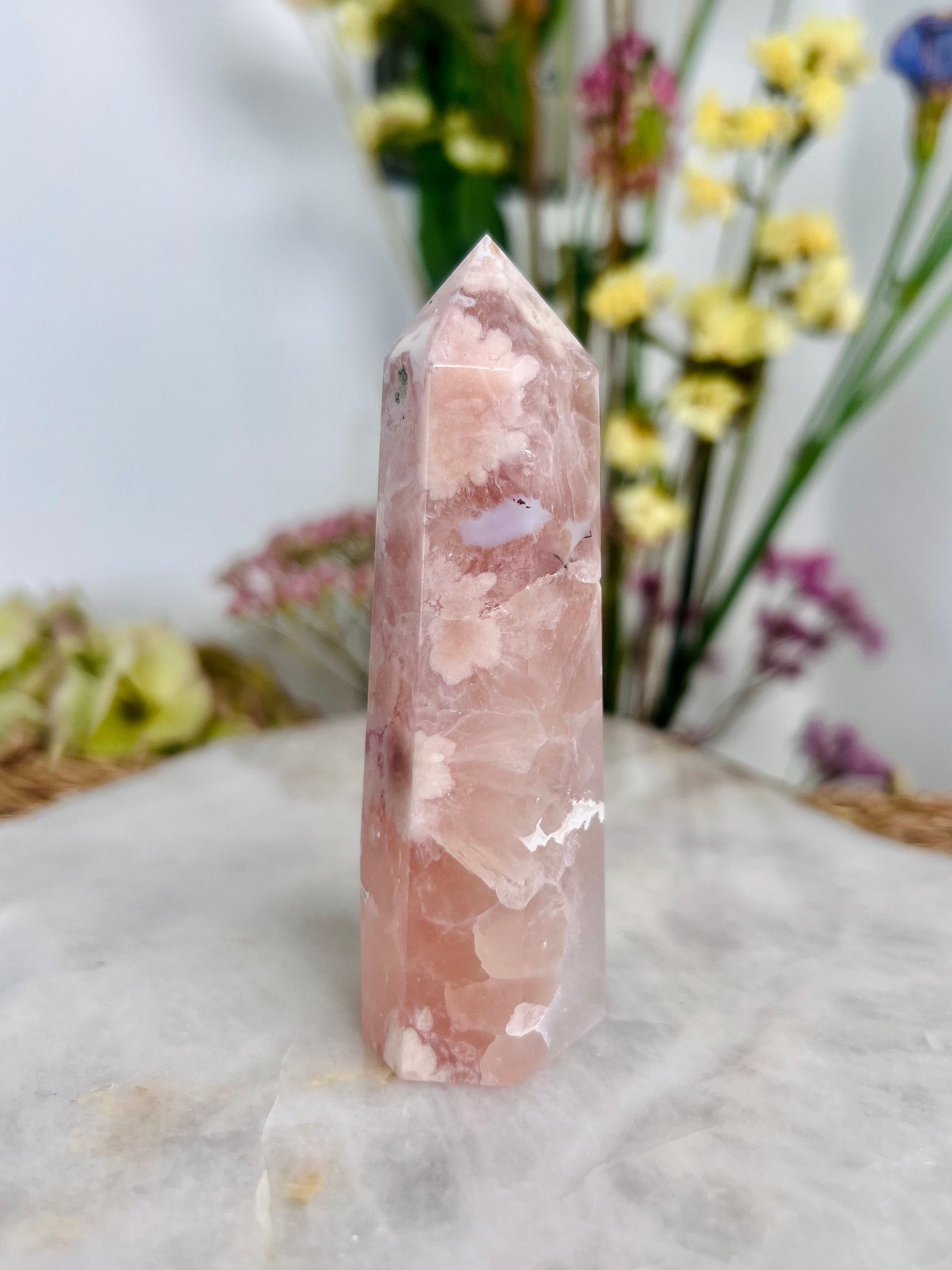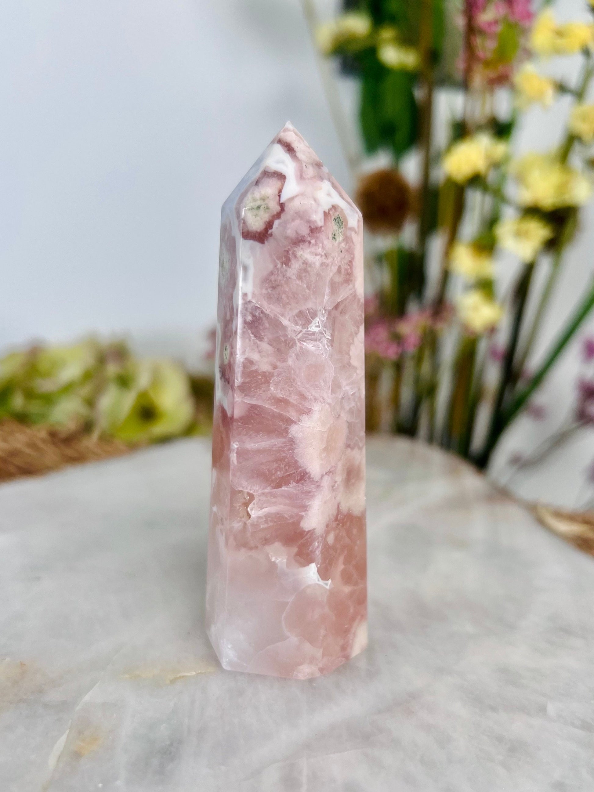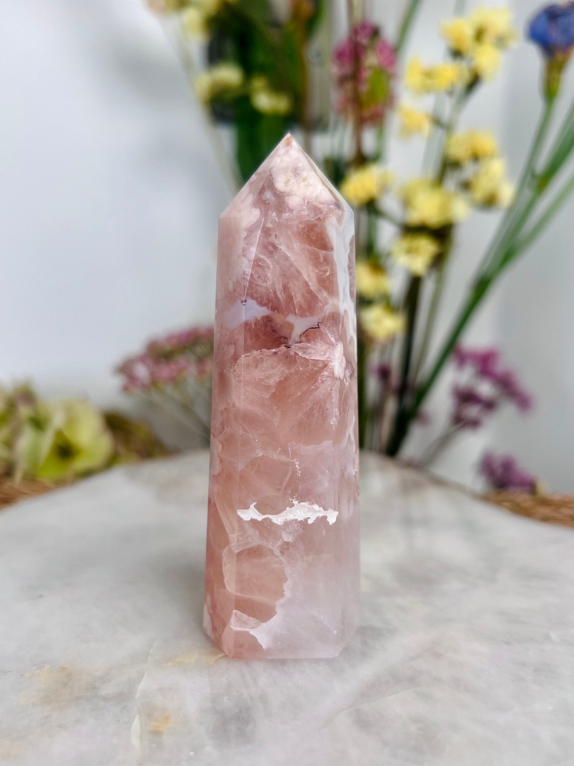 Grade AAA Natural Pink Flower Agate and Quartz Tower from Madagascar, Crystal Healing home decor, Manifestation Crystal 109g FAT01