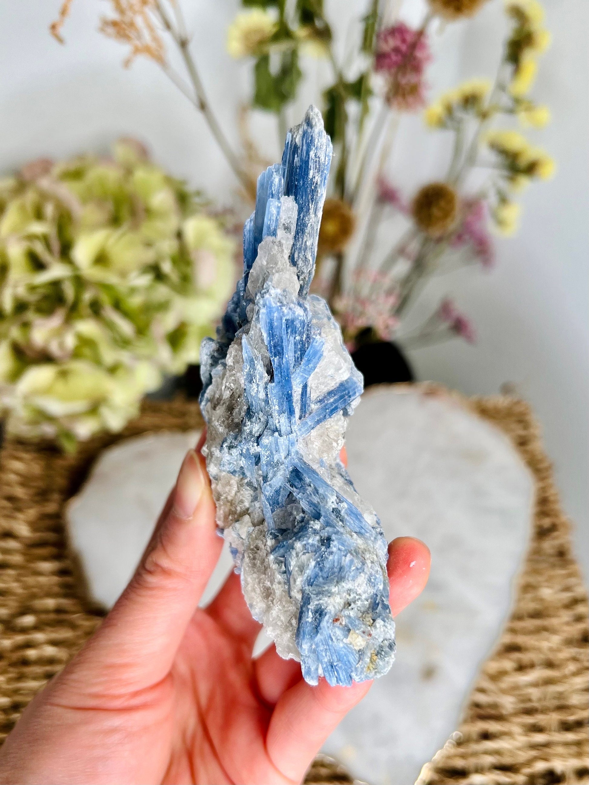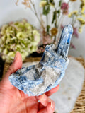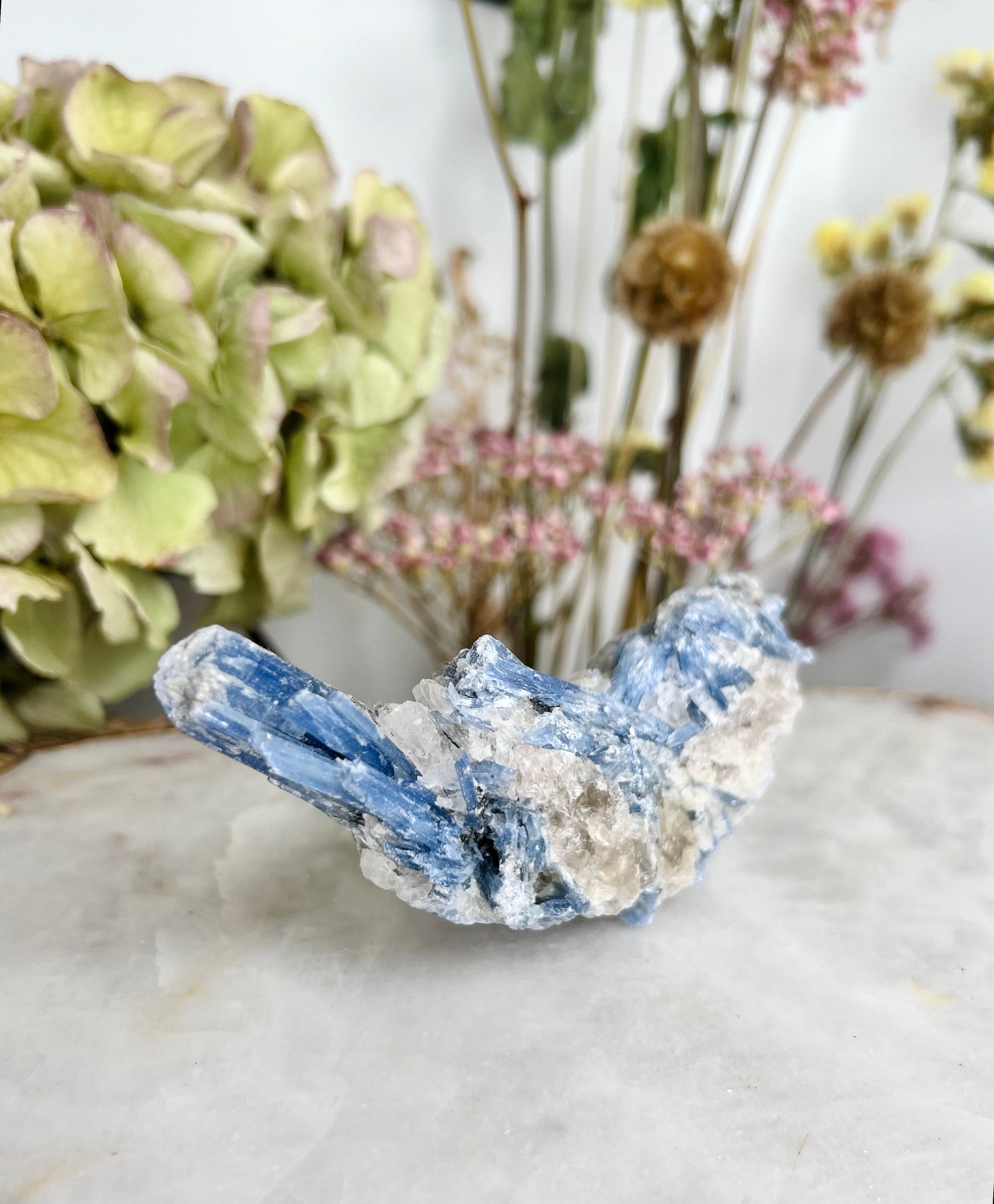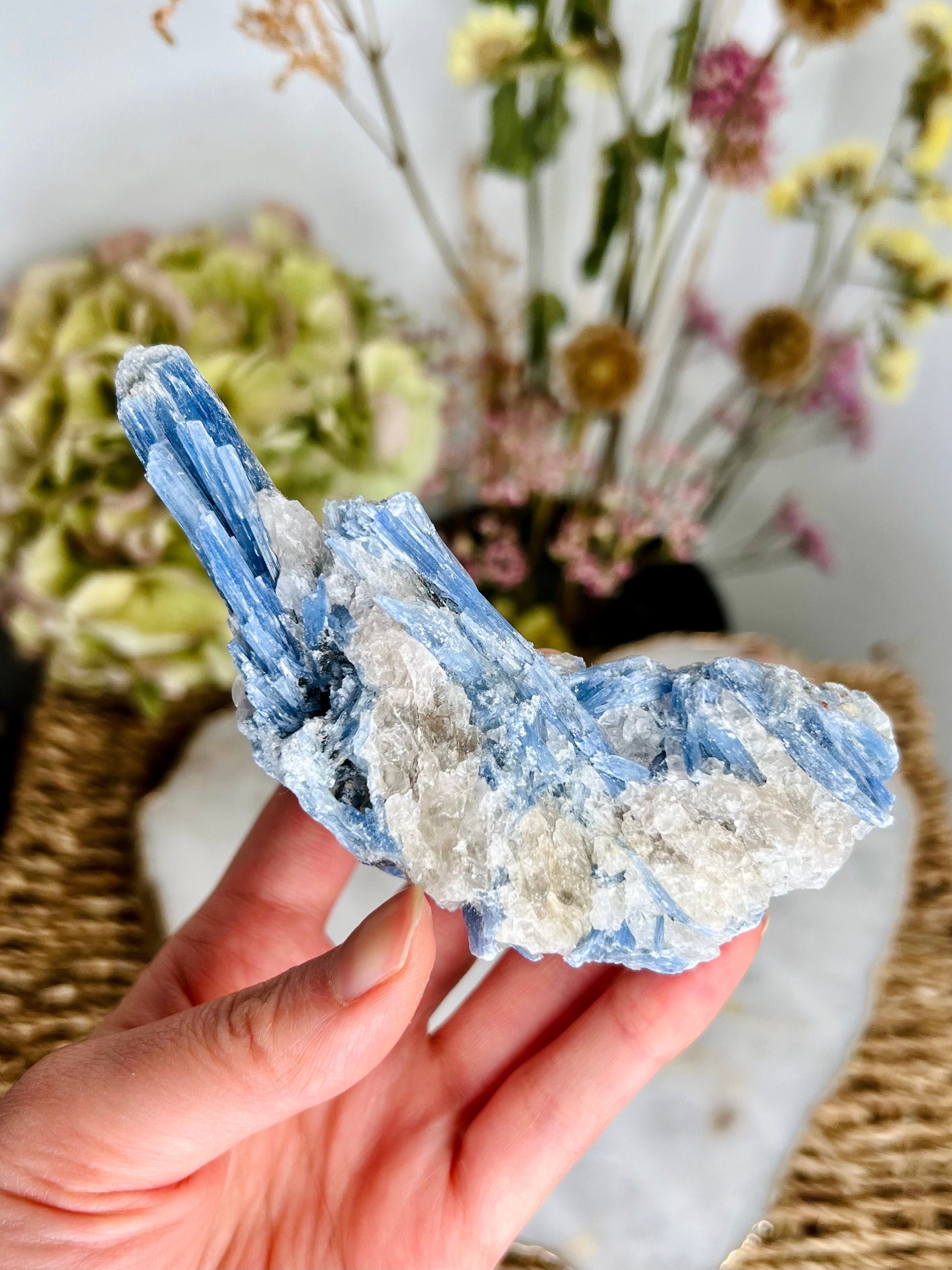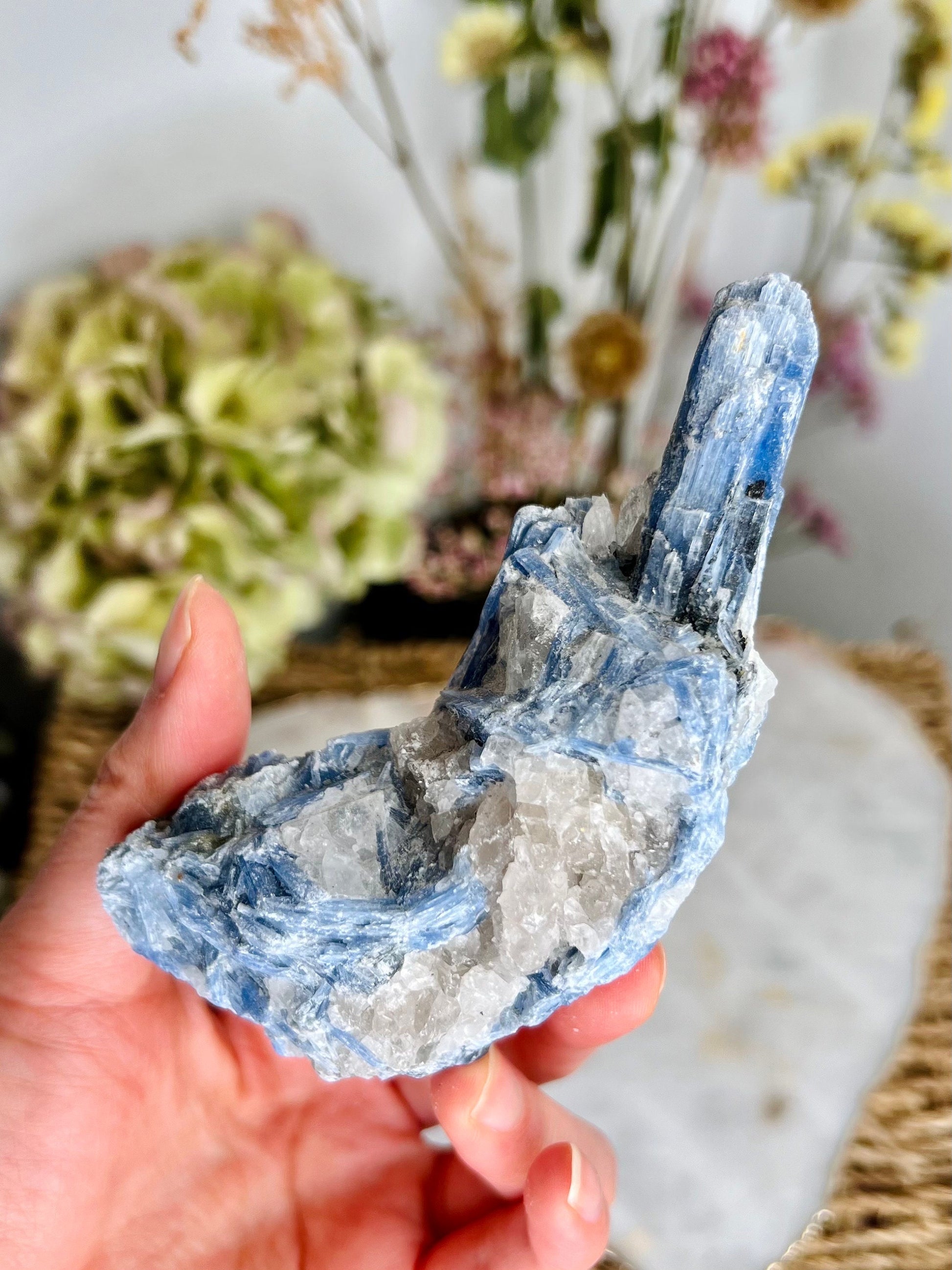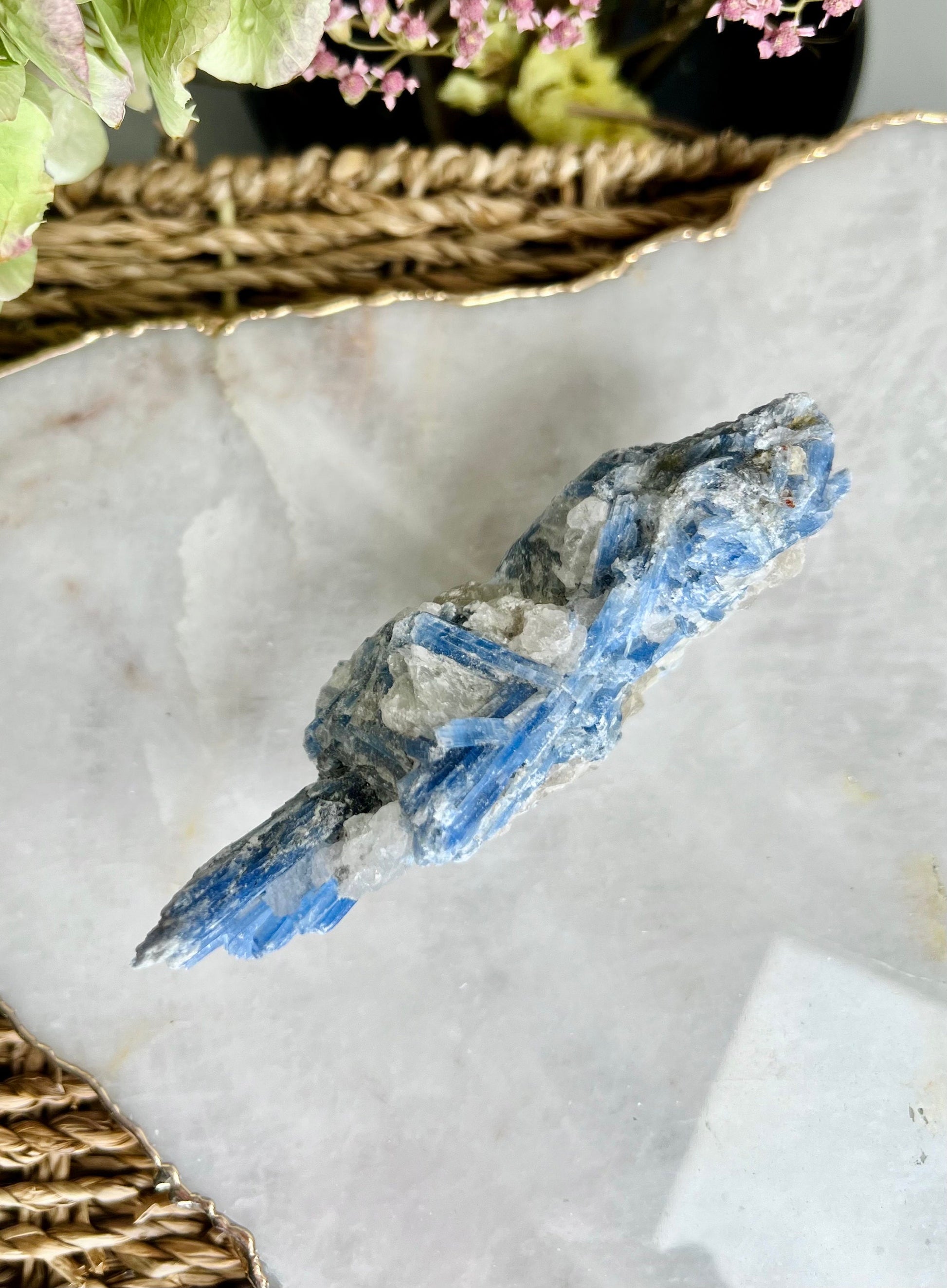 🔮 Blue Kyanite & Quartz - A Symphony of Healing and Clarity - Blue Kyanite, known as the "Blue Sapphire" of the crystal world, offers a direct path to mental clarity, psychic development, and effective communication. The Quartz inclusion enhances these properties, serving as a magnifier for Kyanite's potent vibrations.