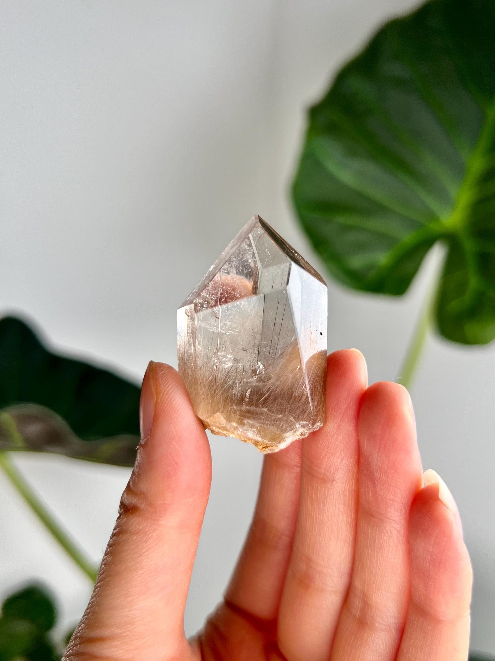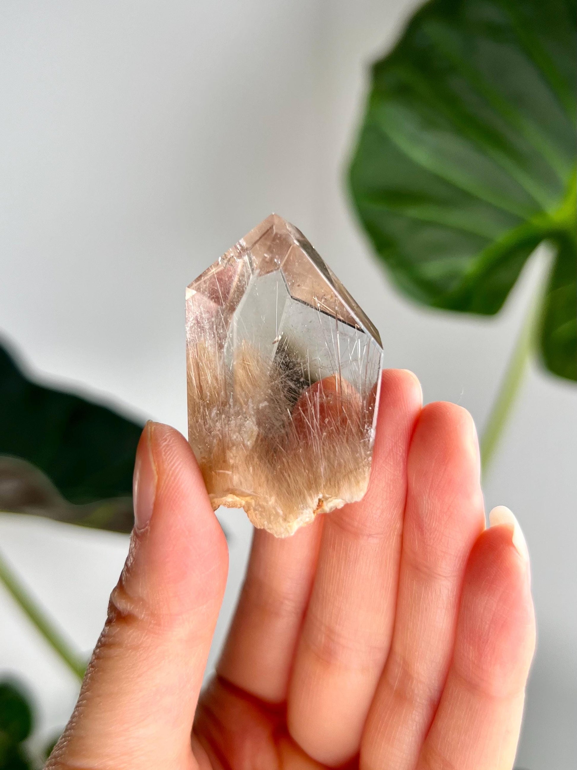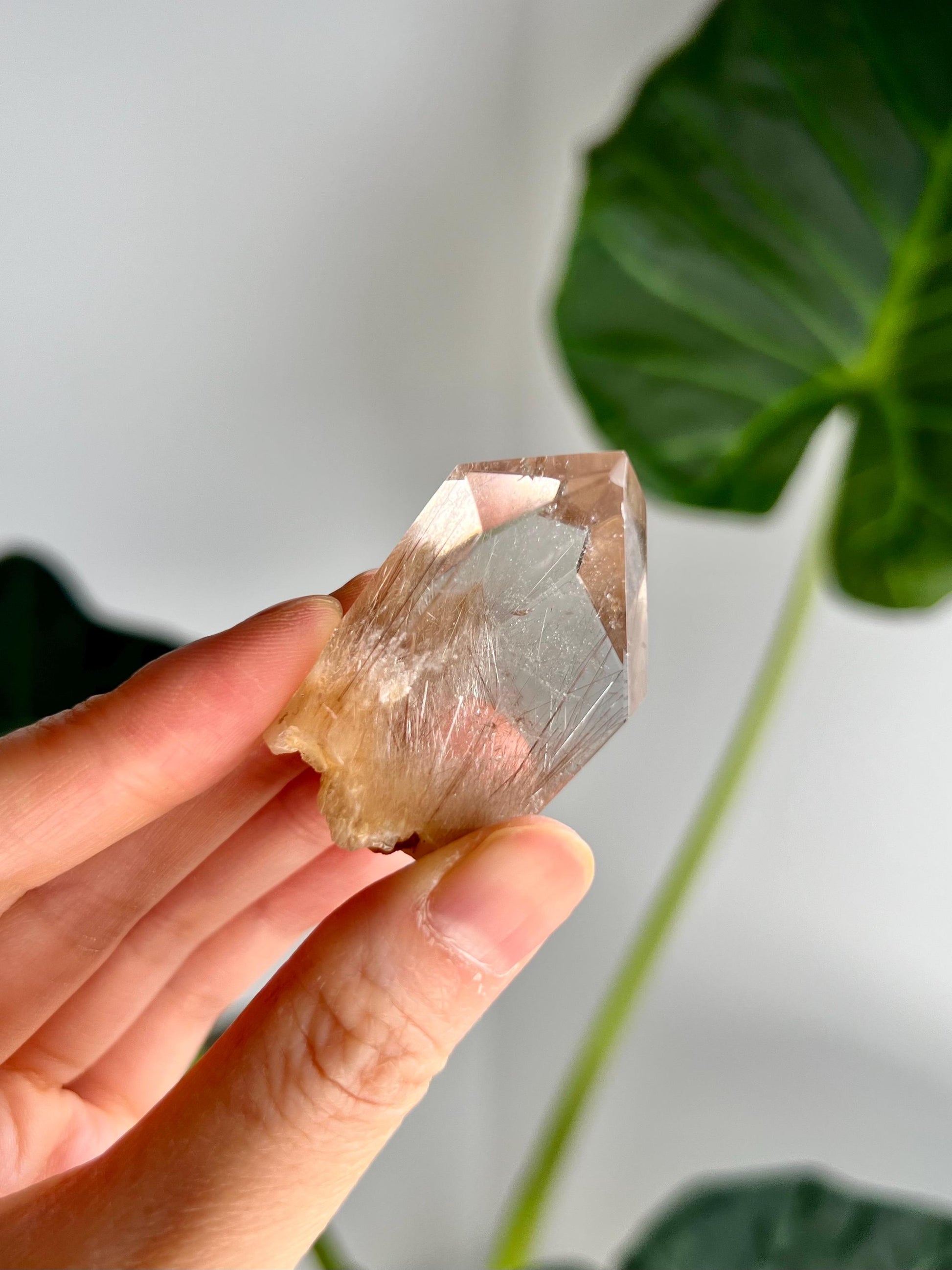 Amphibole Quartz, often referred to as Angel Phantom Quartz, is known for its angelic appearance and high vibrational energy. The presence of inclusions such as pink, golden, and silver amphibole, as well as fine hair-like rutile, enhances the crystal's ability to connect with higher realms and angelic guidance. The combination of these colours, especially the elegant peach hue formed by golden and pink amphibole together, adds a unique aesthetic and energy to each piece.
