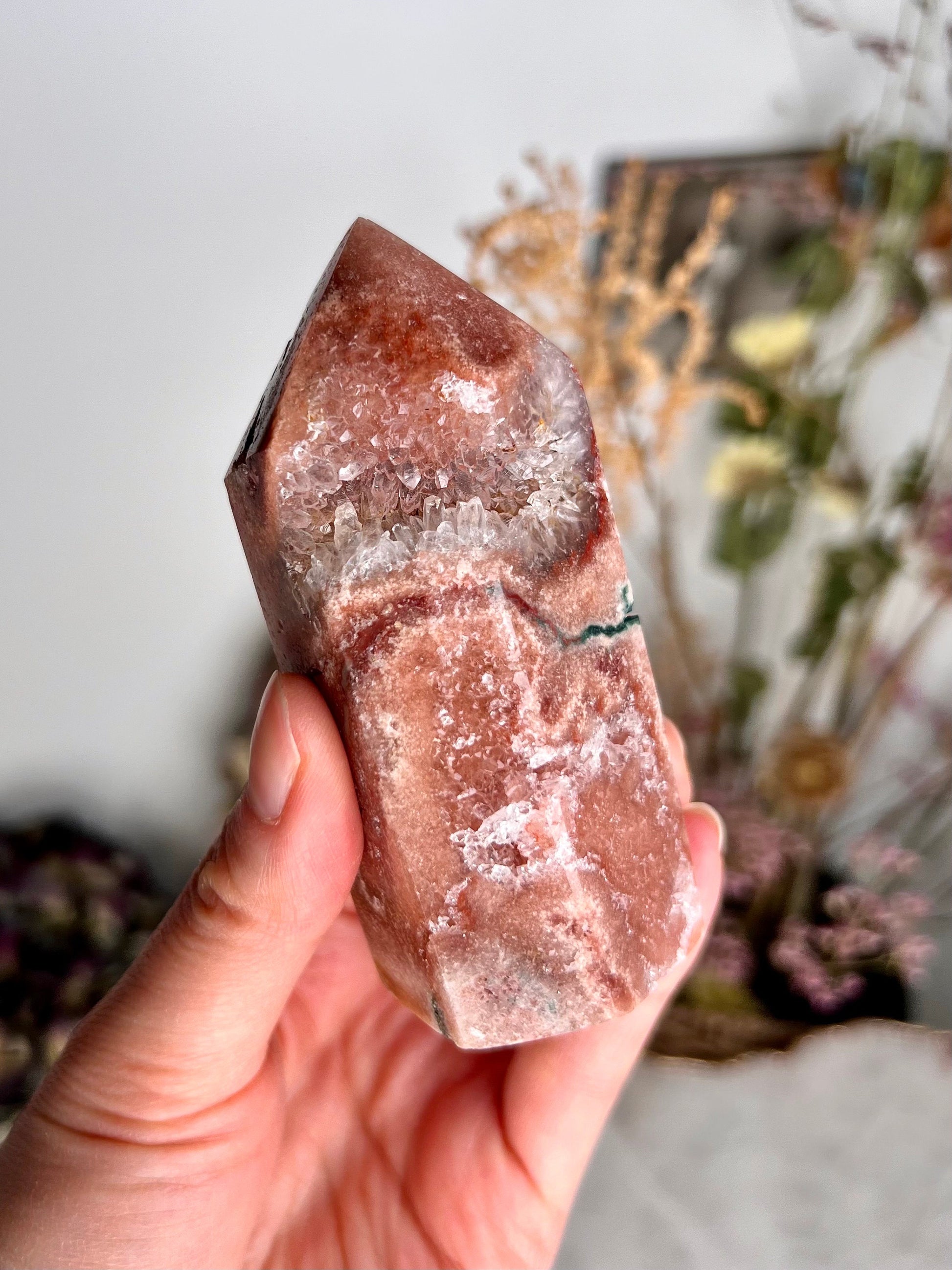 ✨ Embrace Serenity and Feminine Energy - Experience the unique combination of beauty and tranquility with our Grade AAA Pink Amethyst Tower, featuring a sparkling druzy crystal geode. Revered for its connection to the Third Eye and Heart Chakras, this exquisite crystal is not just a visual marvel but also a potent source of calming and healing energies.