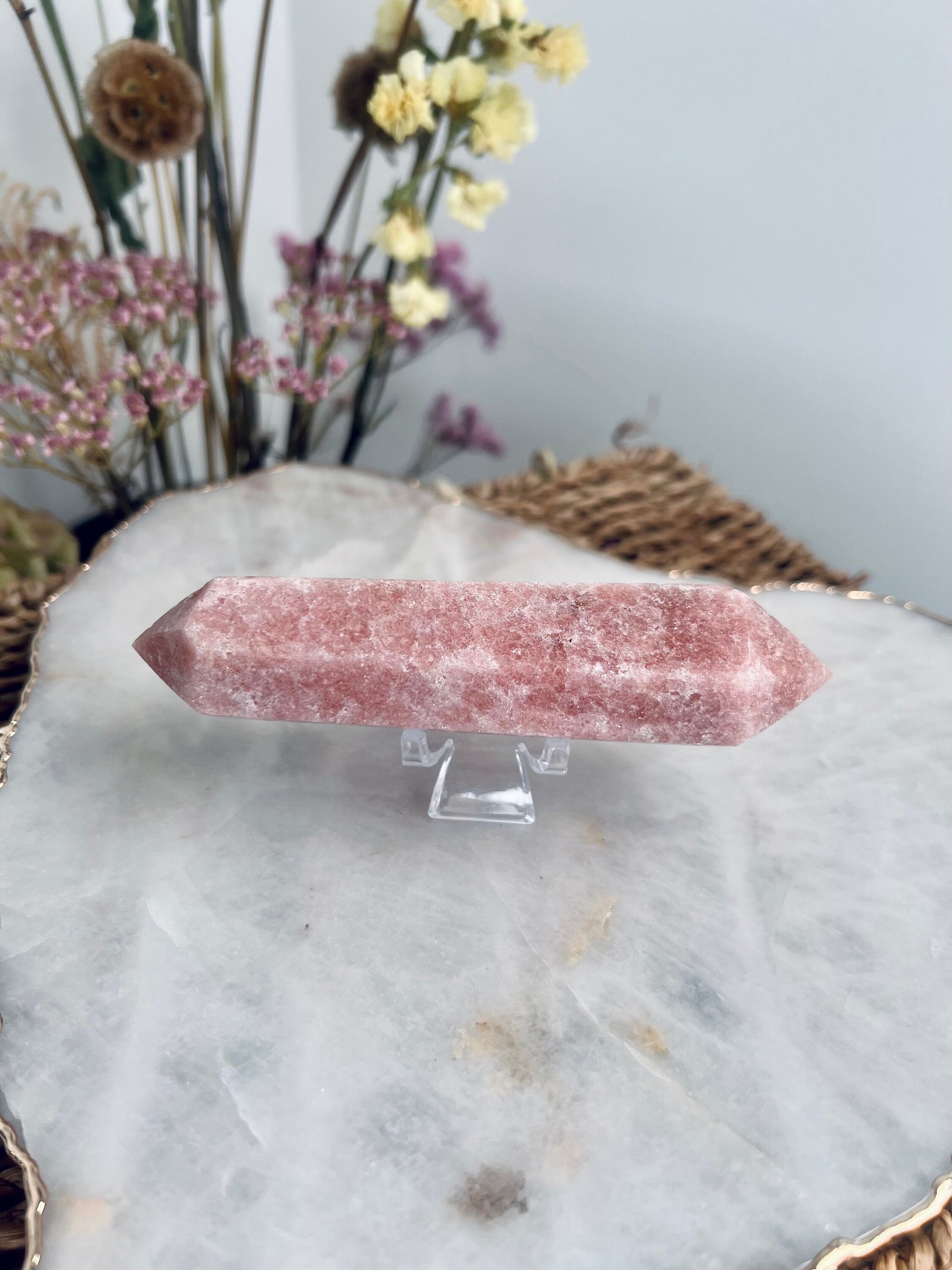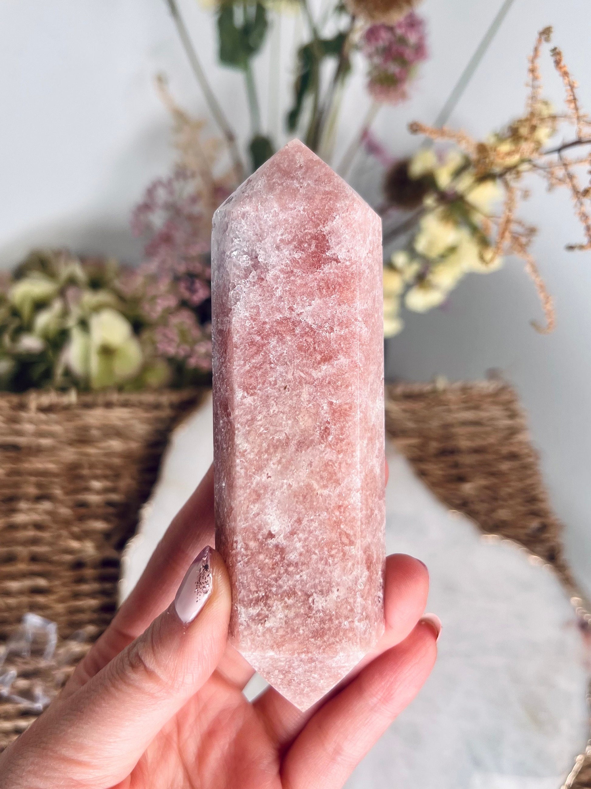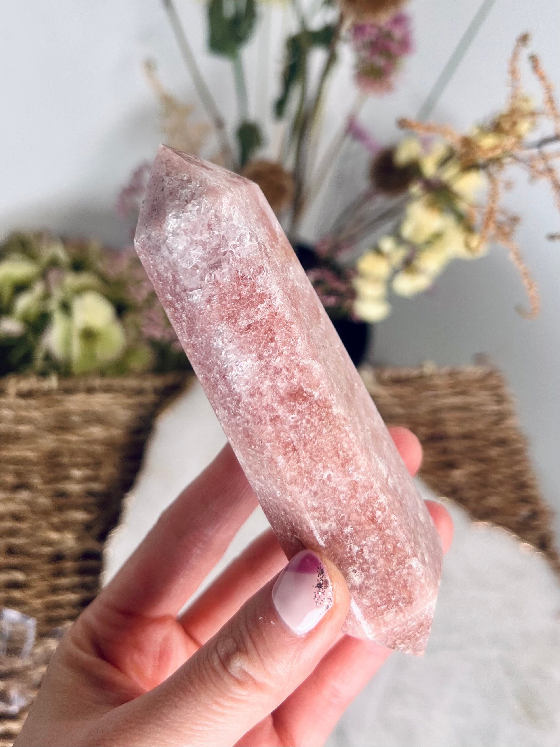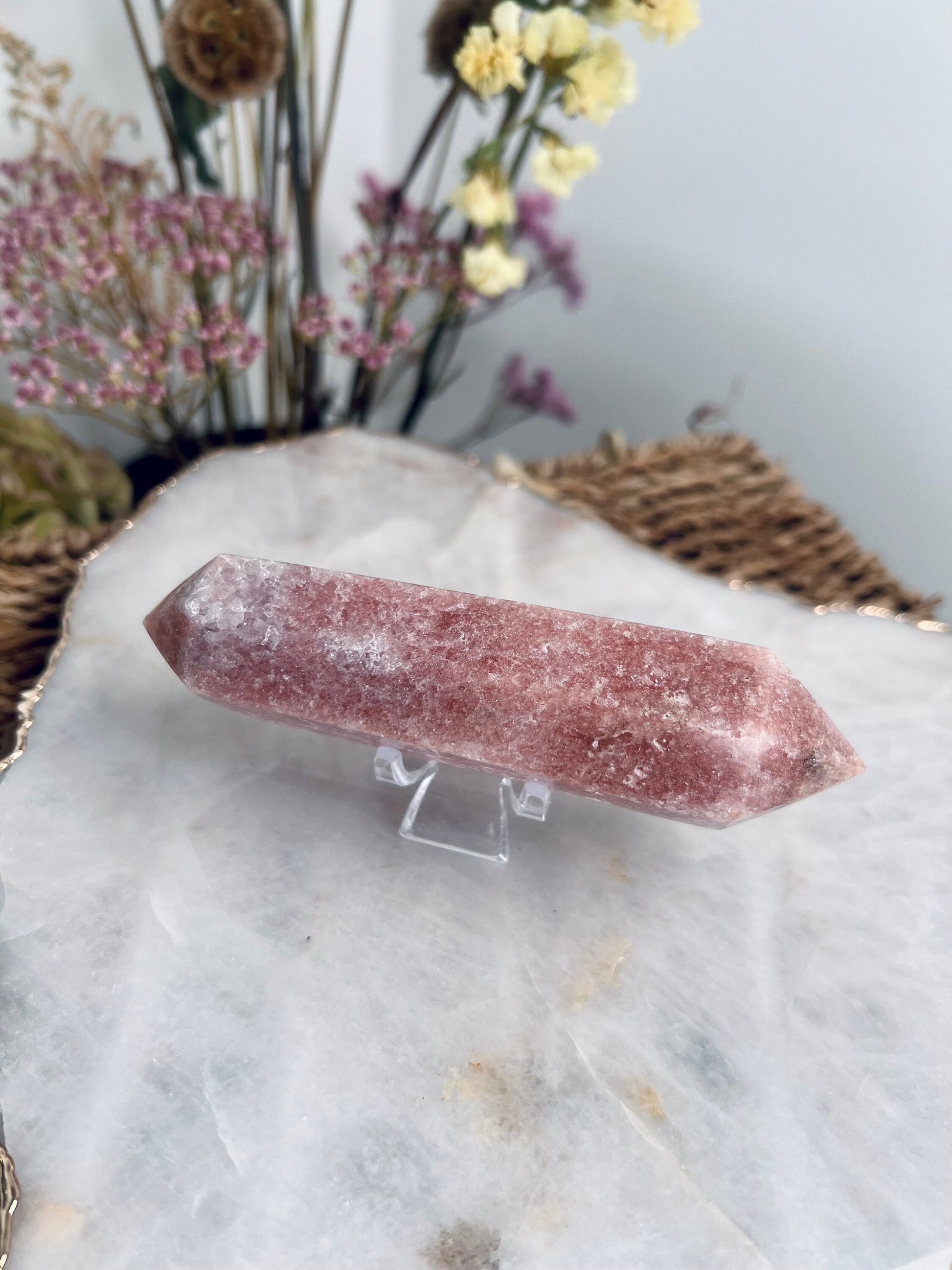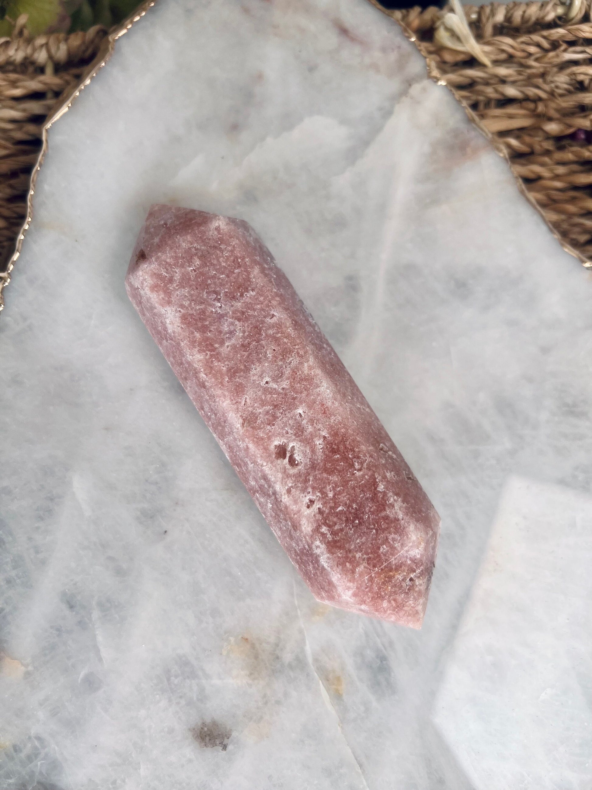 The feminine essence of this crystal remains consistent throughout all of its metaphysical properties. Pink amethyst is a balancer, healer, womb-warmer and comforter - through and through.